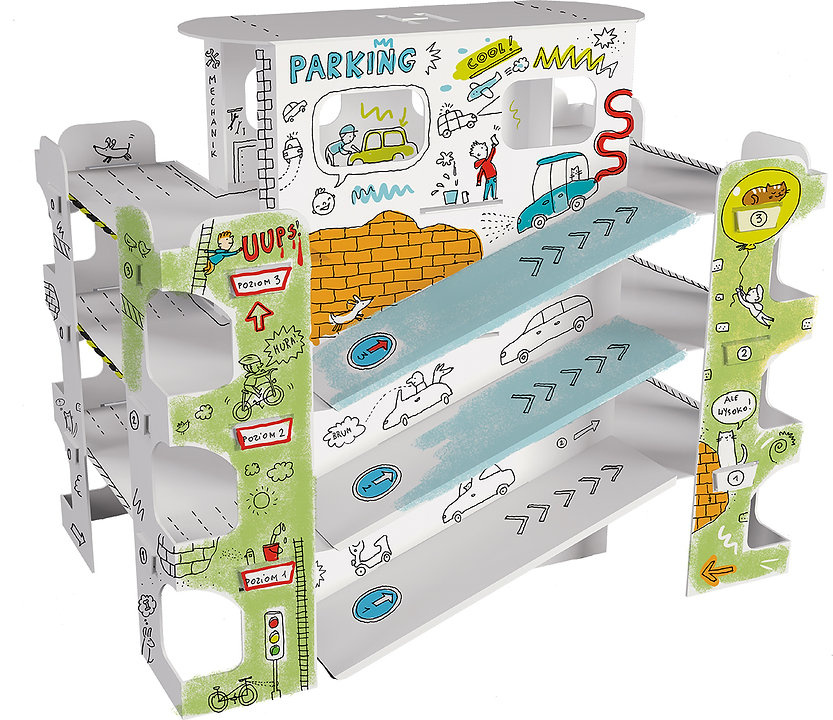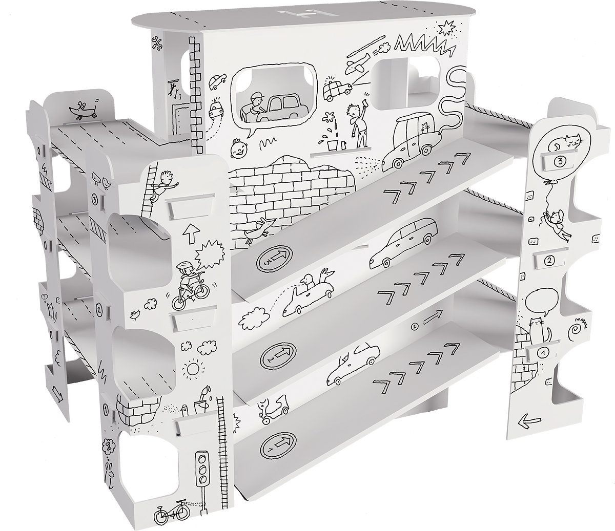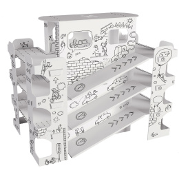Prostorová omalovánka z pevného kartonu potaženého bílým kartonem. Velké, přesně vystřižené díly, které lze snadno sestavit bez použití lepidla nebo nůžek. Obrázkový návod na zadní straně obalu. Pohyblivé části, otevřené prostory a police dělají hračku atraktivnější.