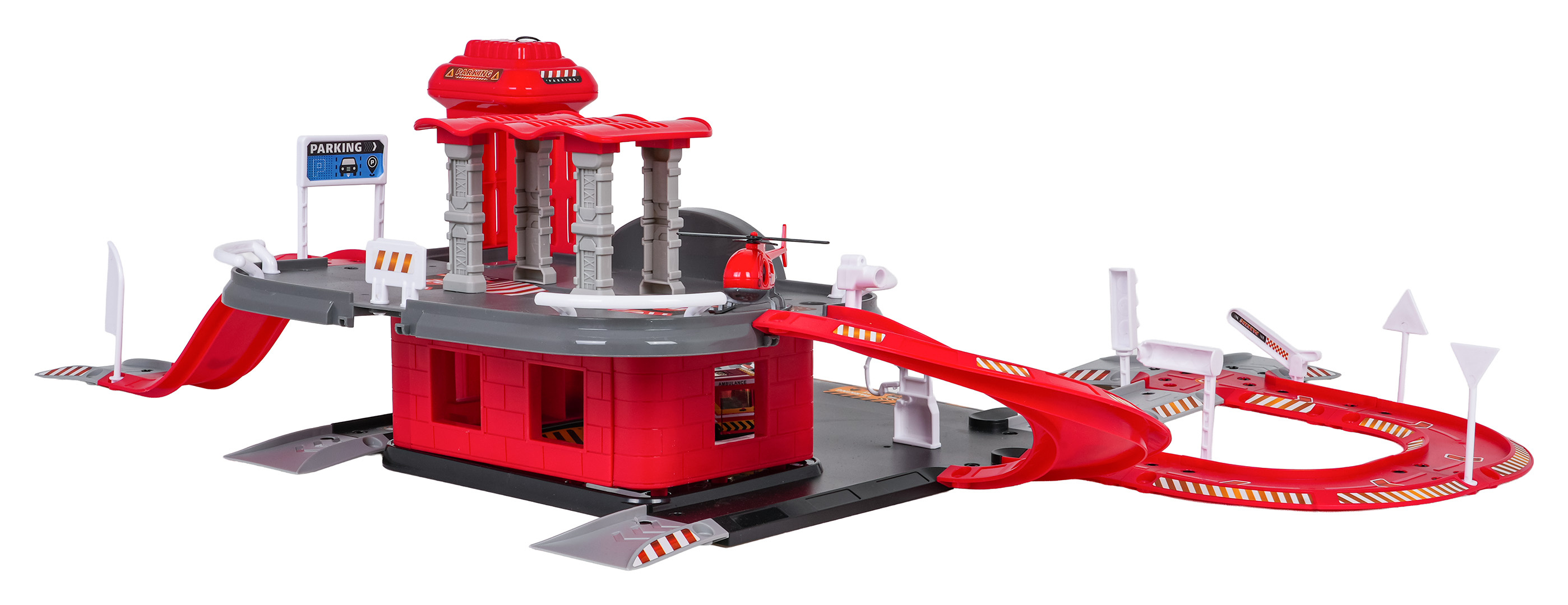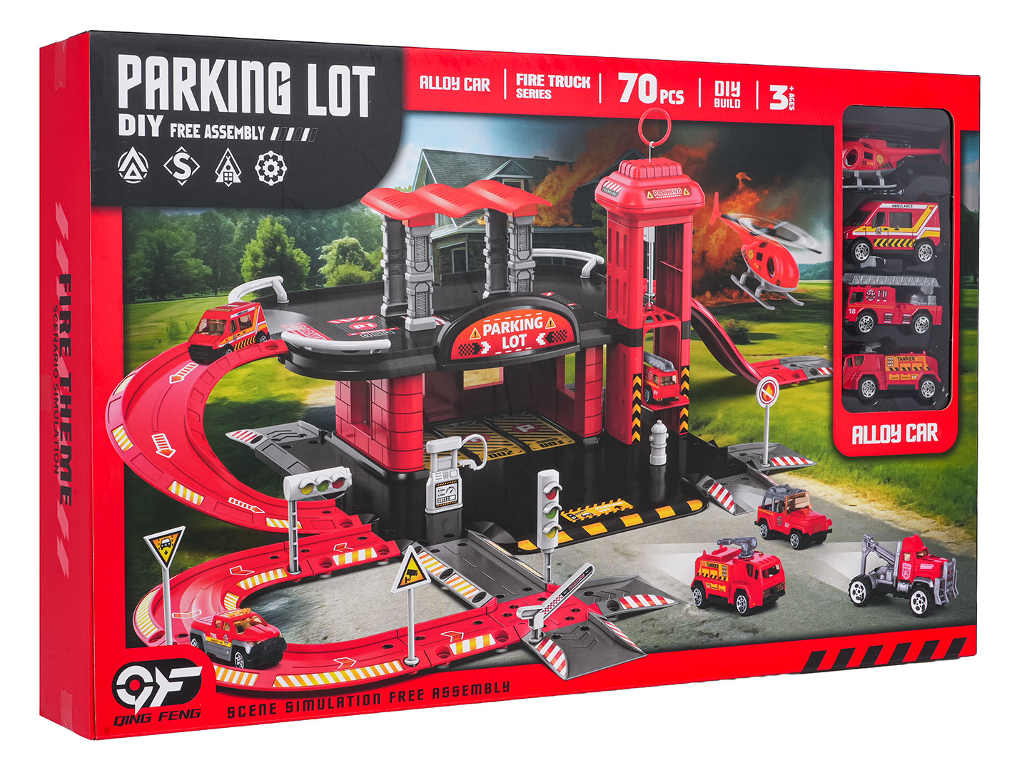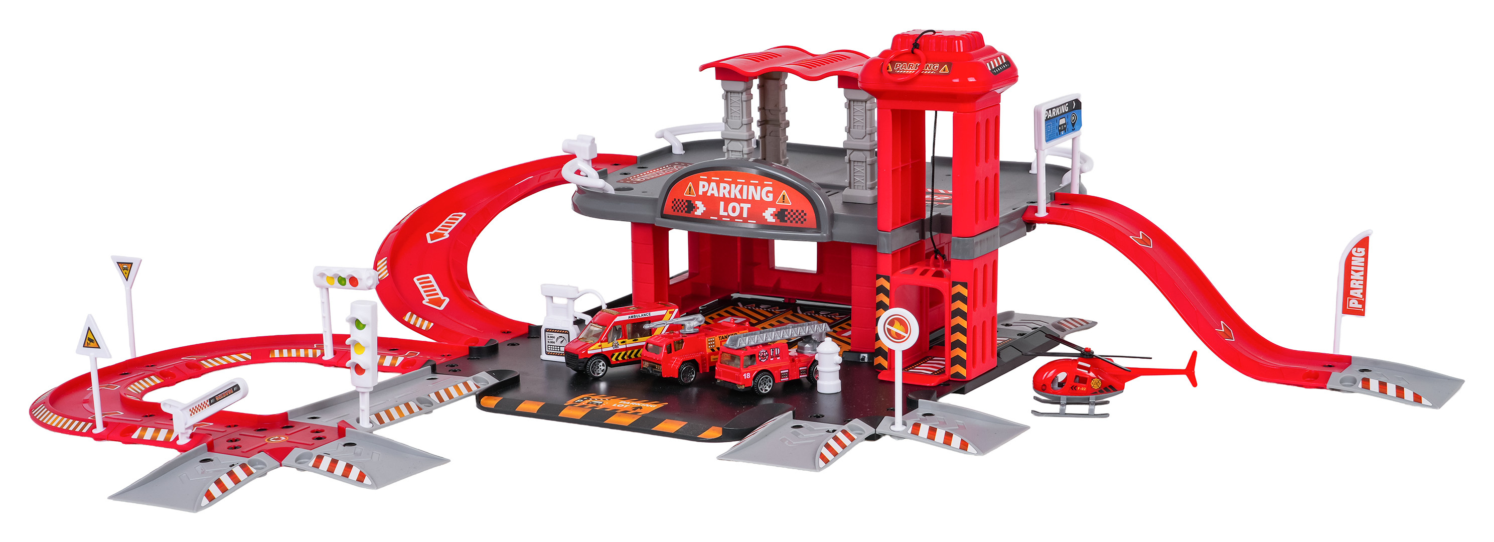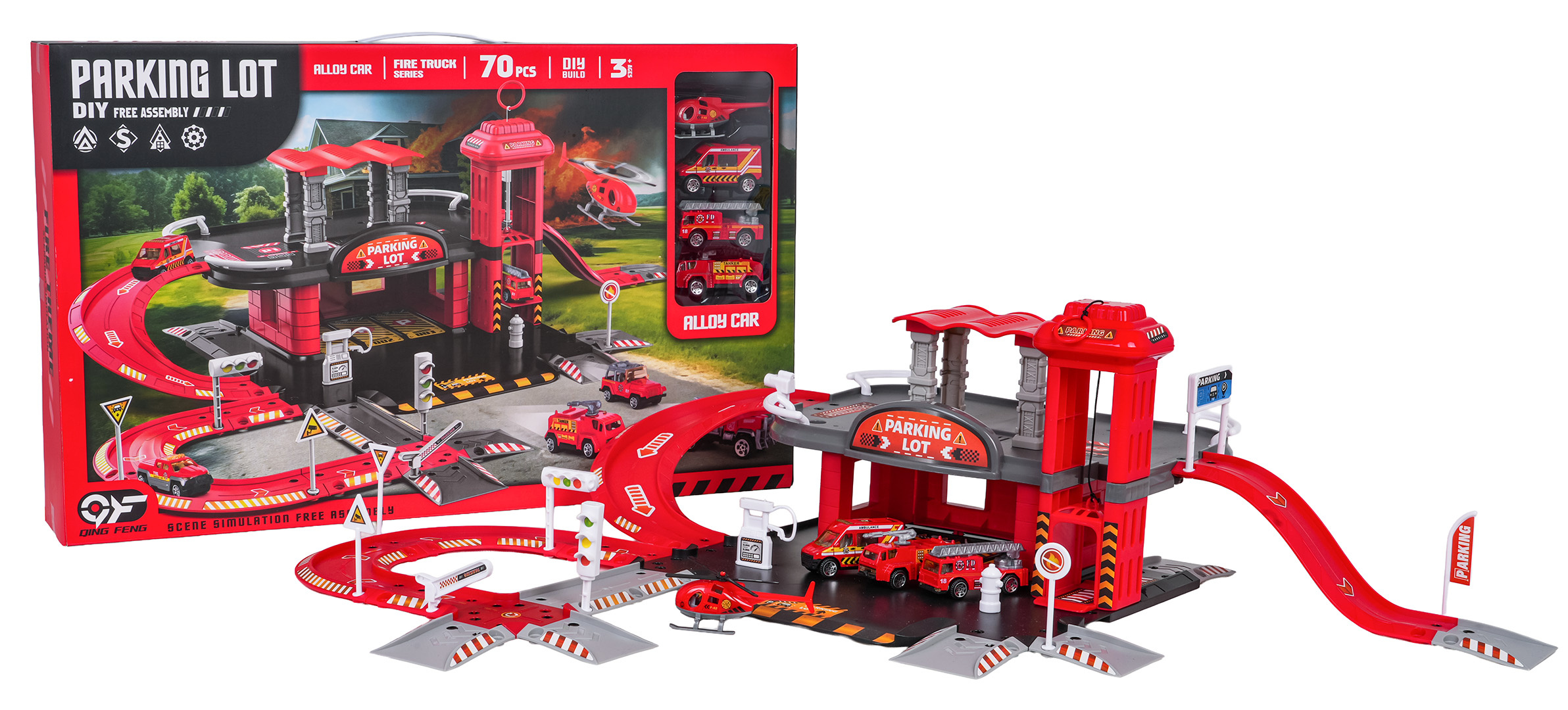 Sada parkoviště Hasičského sboru s kovovými hasičskými autíčky pro děti od tří let. Všechny prvky sady byly vyrobeny z nejkvalitnějších materiálů bezpečných pro děti. Parkování bude lahůdkou pro milovníky Hasičského sboru. Konstrukce parkoviště je dvouúrovňová. V přízemí se nachází čerpací stanice, cesta a výtah, který přepravuje vozidlo do prvního patra, kde je umístěno parkoviště. Shora mohou vozidla sjet výtahem nebo skluzavkou. V sadě máme tři hasičská vozidla a vrtulník. Sestava po složení nezabírá mnoho místa, ale nabízí mnoho možností zábavy.