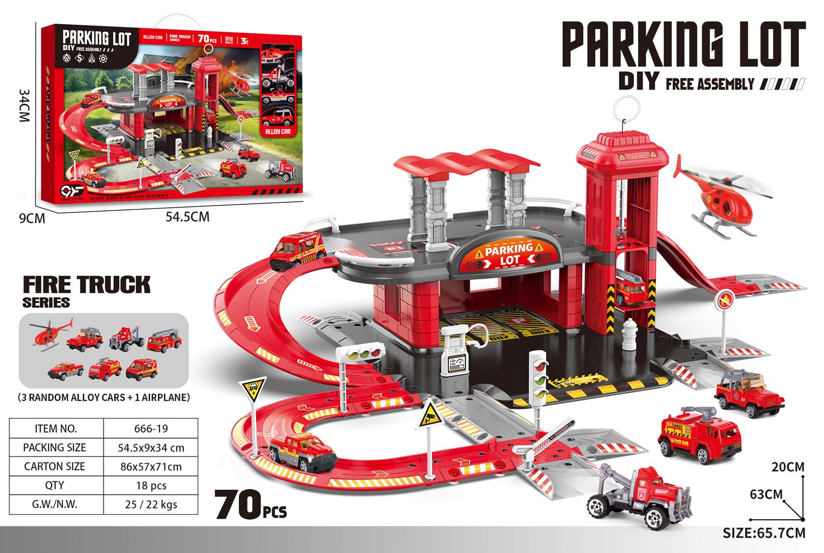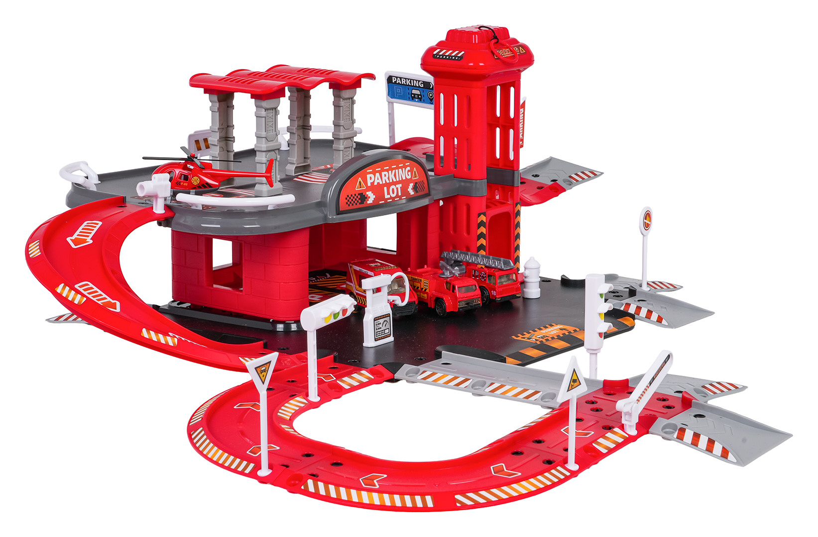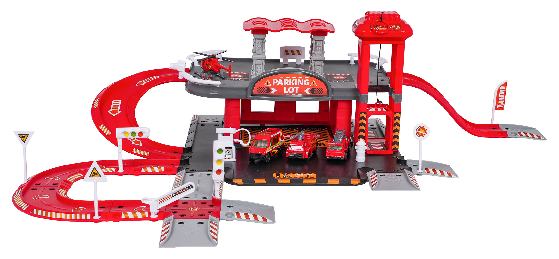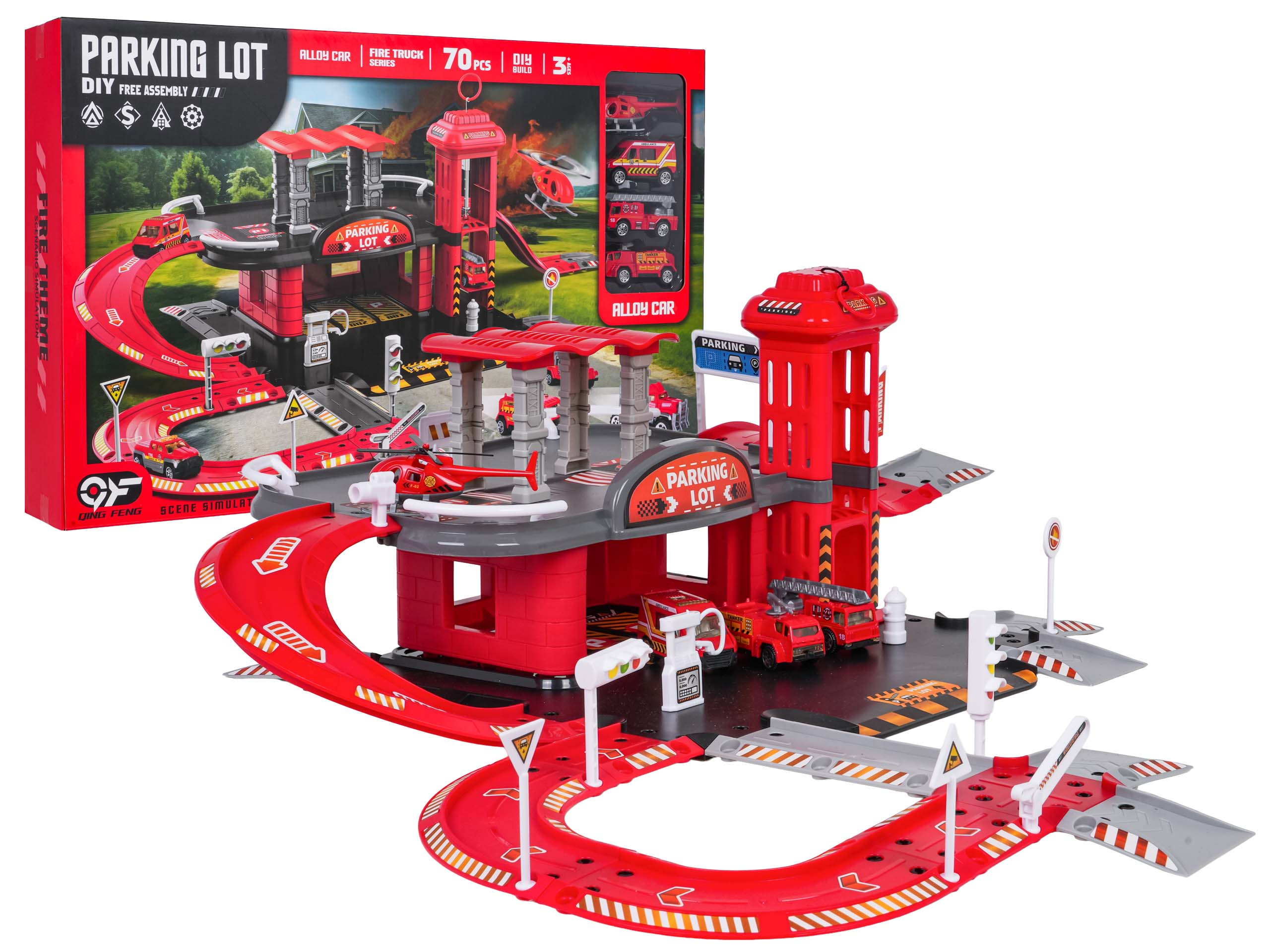 Sada parkoviště Hasičského sboru s kovovými hasičskými autíčky pro děti od tří let. Všechny prvky sady byly vyrobeny z nejkvalitnějších materiálů bezpečných pro děti. Parkování bude lahůdkou pro milovníky Hasičského sboru. Konstrukce parkoviště je dvouúrovňová. V přízemí se nachází čerpací stanice, cesta a výtah, který přepravuje vozidlo do prvního patra, kde je umístěno parkoviště. Shora mohou vozidla sjet výtahem nebo skluzavkou. V sadě máme tři hasičská vozidla a vrtulník. Sestava po složení nezabírá mnoho místa, ale nabízí mnoho možností zábavy.
