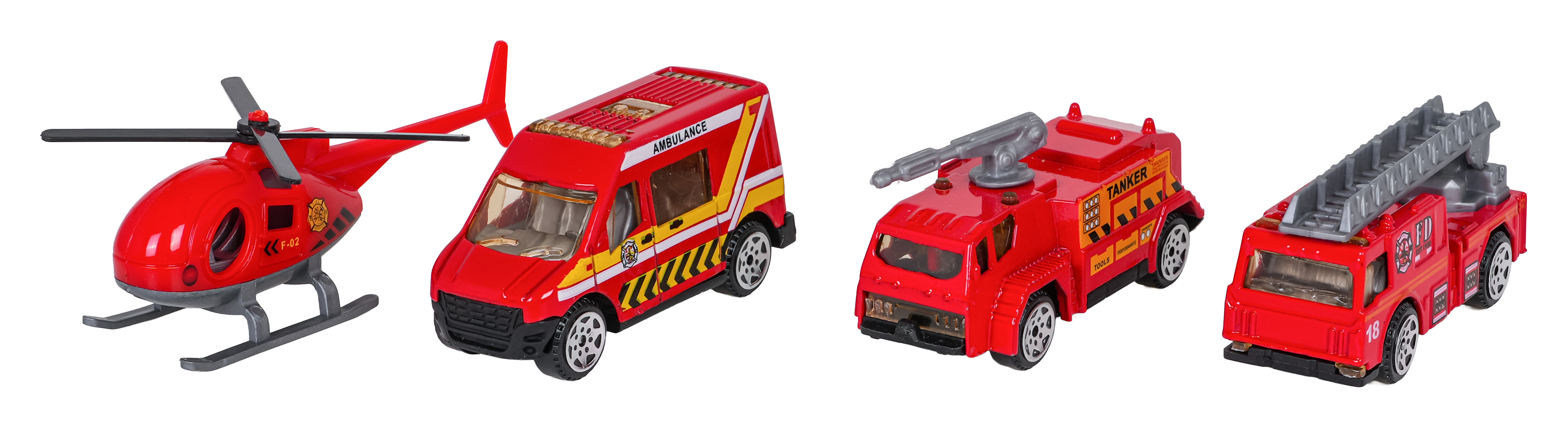 - 3 hasičská vozidla (s žebříkem, s vodním dělem, sanitka),