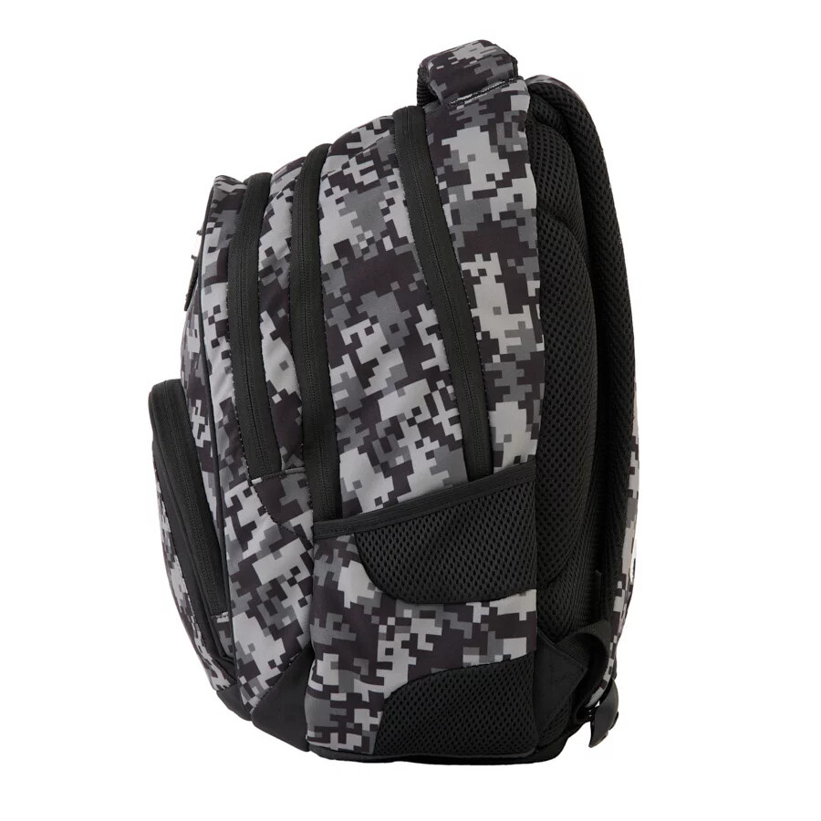 Má tři prostorné přihrádky, přední kapsu na zip s organizérem a dvě boční kapsy ze síťoviny a látky na láhev nebo termosku.