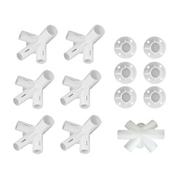 Kompletní sada spojovacích prvků pro konstrukci šestihranného zahradního altánu Sada se skládá z 13 prvků Sada spojek vhodná pro altány: PA5, PA6 Průměr otvorů pro sloupky - 24 mm Průměr otvorů pro střešní trubky - 18 mm. materiál PVC