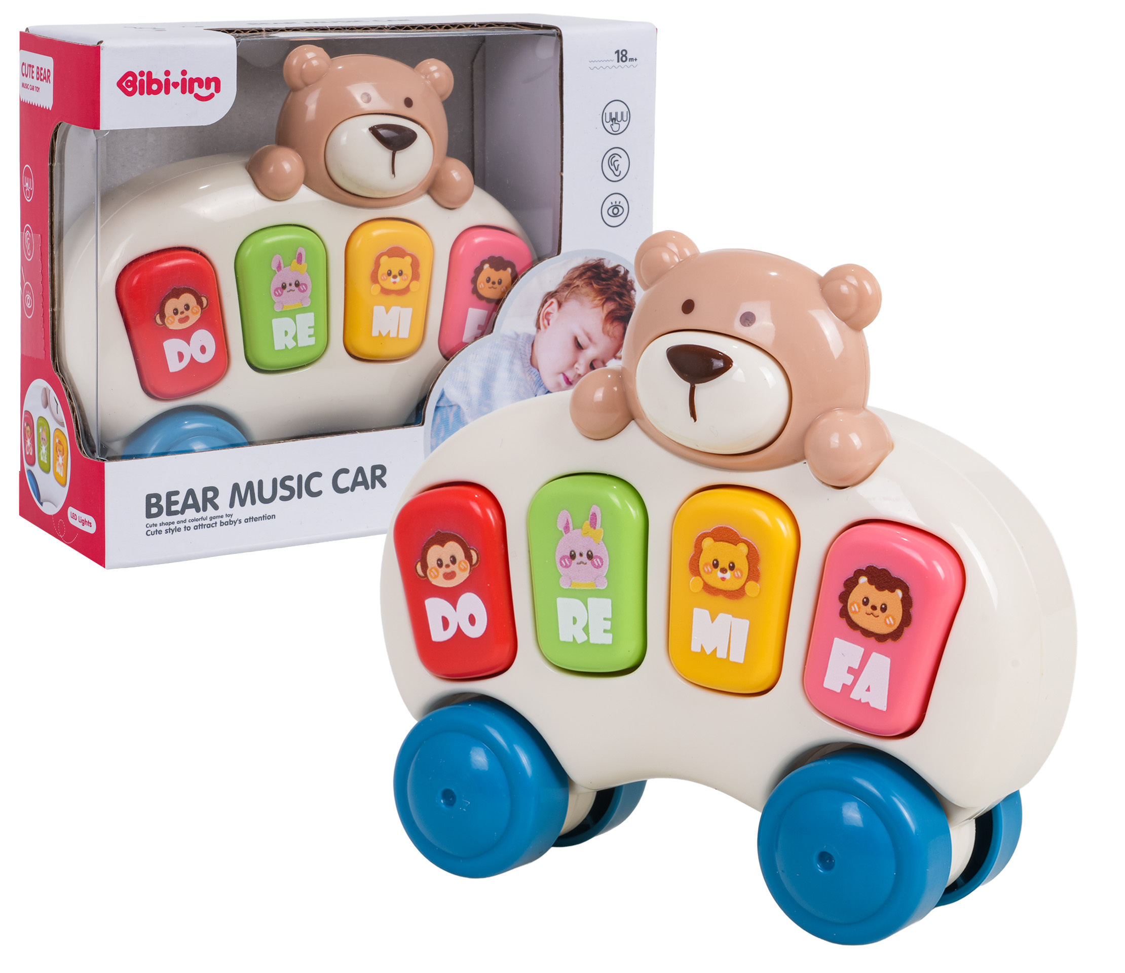 Pianinko s misemi a kolečky pro děti od osmnáctého měsíce života. Pianinko je vyrobeno z nejkvalitnějších materiálů v živých barvách, nemá ostré hrany. Pianinko připomíná autíčko s medvídkem a má čtyři zvukové klávesy s obrázky zvířátek a podsvícením. Stisknutí klávesy spustí režim piana (zvuky not, podsvícení klávesy). Dvojité stisknutí stejné klávesy spustí zvuky zvířátka. Stisknutí medvídka nahoře spustí veselé melodie. Hračka je napájena bateriemi typu 2 x AAA 1,5V.