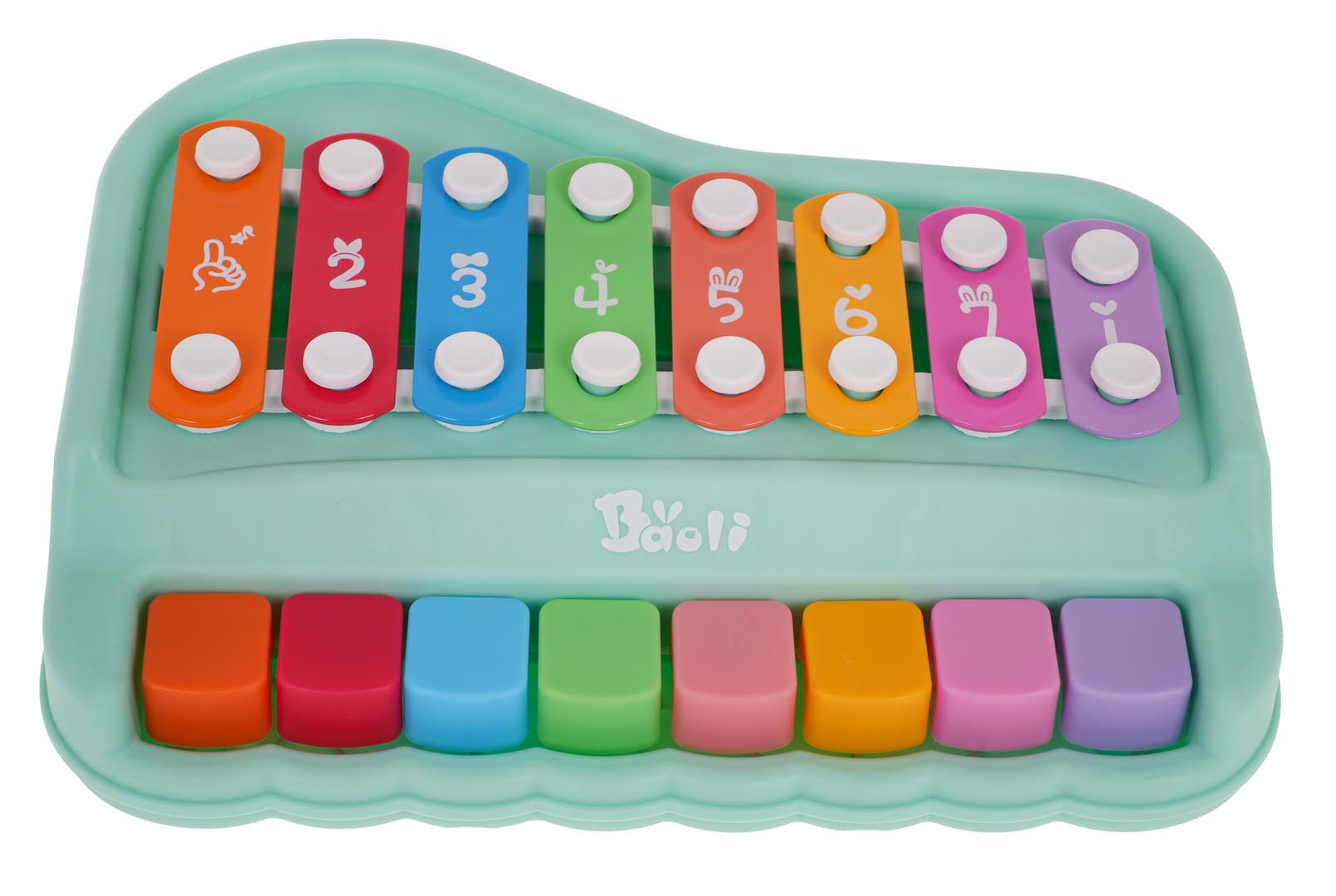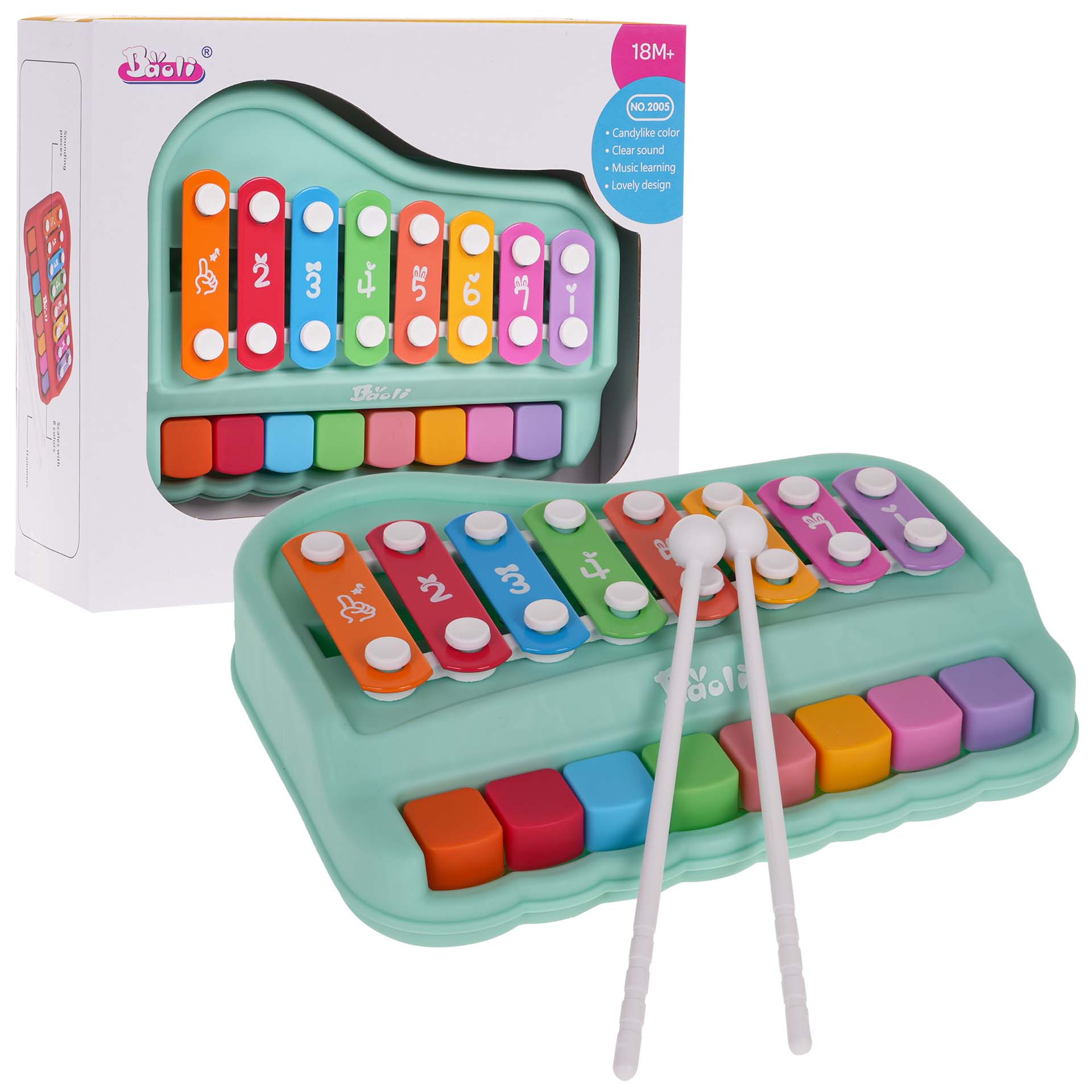 Sada 2v1 piánko a xylofon pro děti od 18 měsíců. Hračka je vyrobena z nejkvalitnějšího plastu a kovu, živé barvy přitahují pozornost dítěte a povzbuzují ho ke hře. Do sady byly přiloženy dvě hůlky.