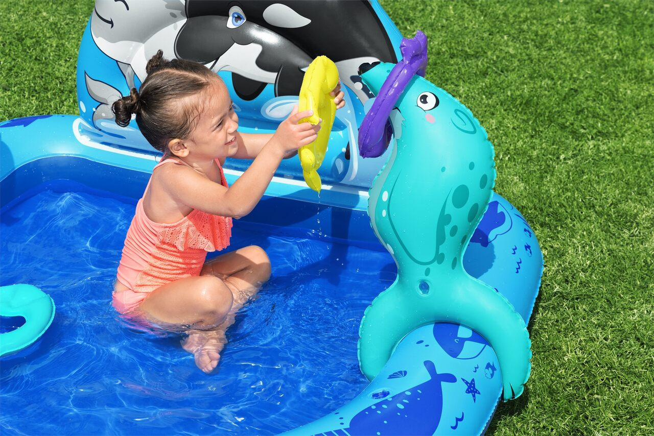 | * Mimořádně velká plocha pro stříkající bazén * Další nafukovací příslušenství * Polstrovaná podlaha pro měkké přistání * Barevný oblouk a přátelské mořské dekorace * Snadno použitelný ventil pro vypouštění vody * Konstrukční objem vody: 84 l | |