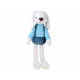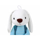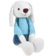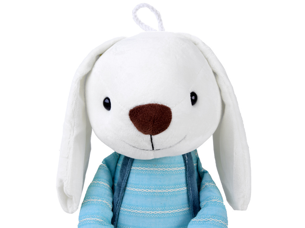 Králíček má plastové oči, vyšívaný nos a rozkošný úsměv. Králík má na sobě šortky s kšandami a pruhované tričko s dlouhým rukávem.