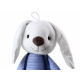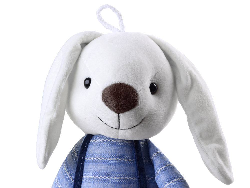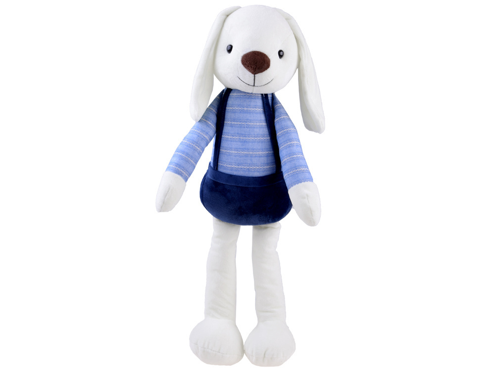 Králíček má plastové oči, vyšívaný nos a rozkošný úsměv. Králík má na sobě šortky s kšandami a pruhované tričko s dlouhým rukávem.