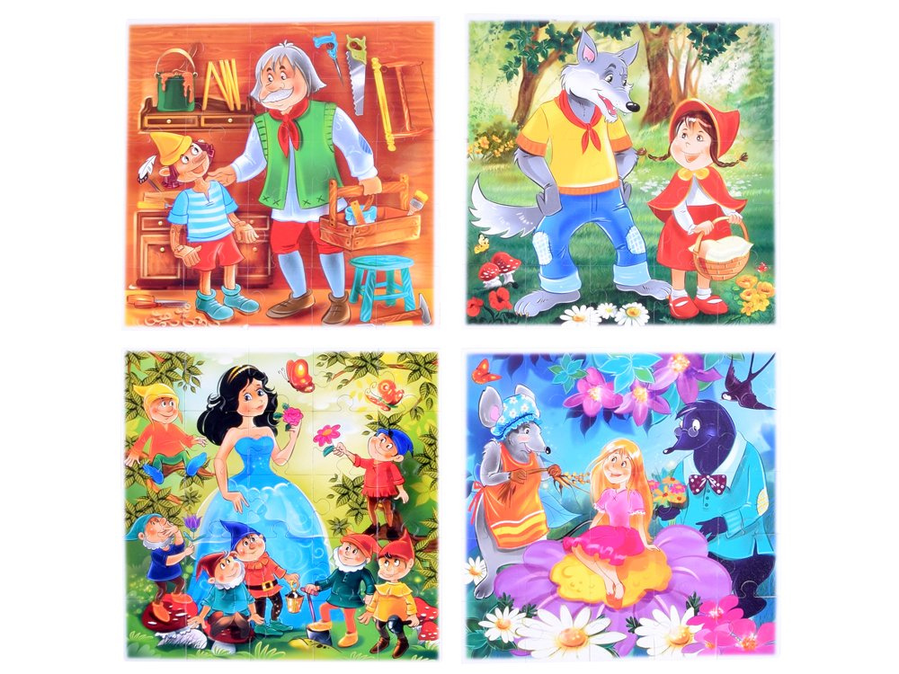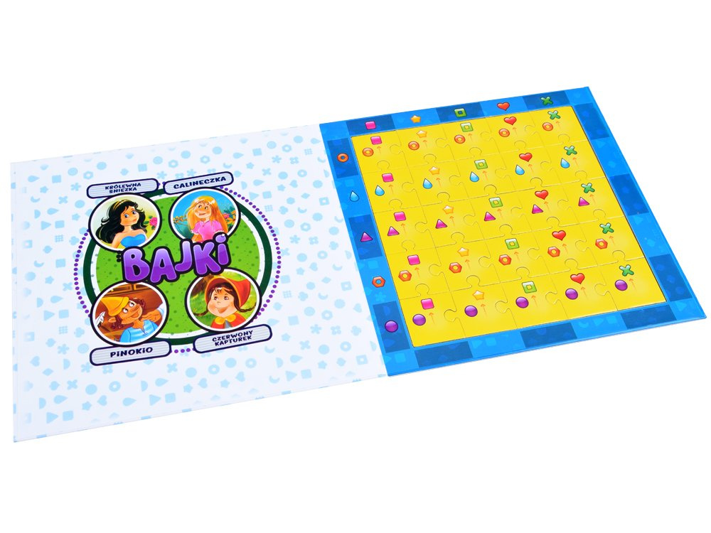Kodex Pohádky obsahuje obrázky s výjevy z různých pohádek: Pinocchio, Paleček, Sněhurka, Červená Karkulka. Každý obrázek byl rozdělen na 25 čtvercových prvků. Na zadní straně každého trička je na barevném pozadí uveden kód. Každá pohádka má svou barvu. Umístěte všechny položky jedné barvy do sešitu podle kódů na straně otevřeného sešitu. Pokud jsou dílky správně uspořádány, po zavření a otočení sešitku se v okénku objeví obrázek z pohádky.