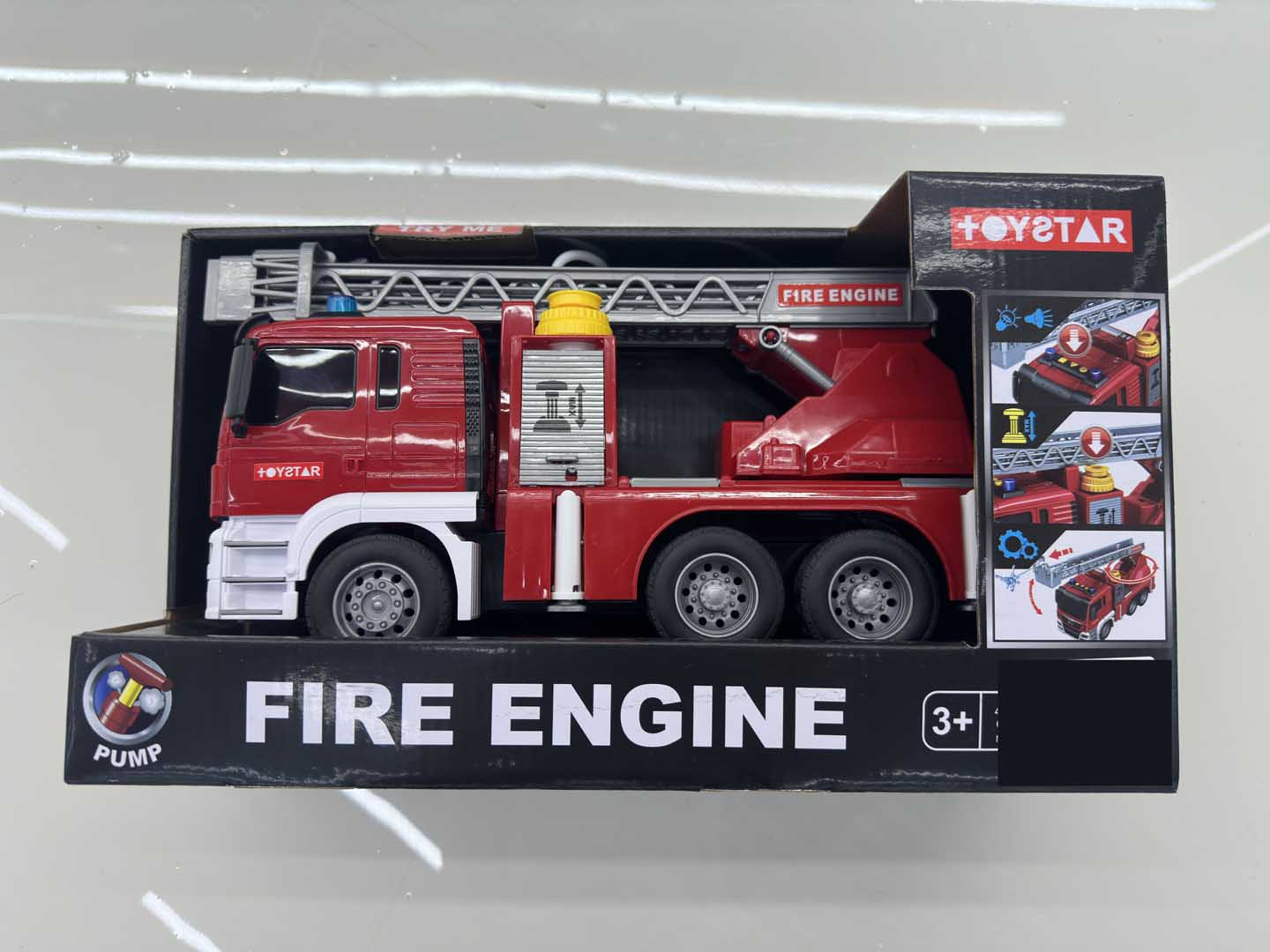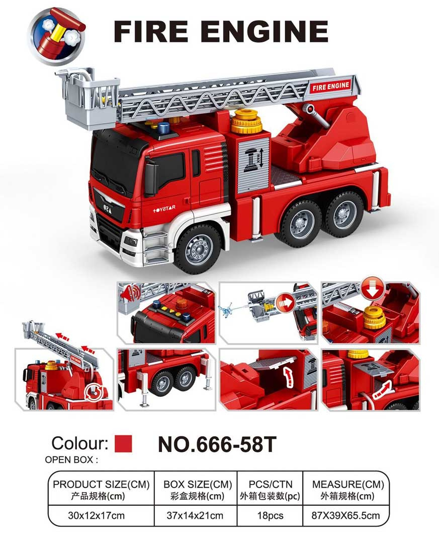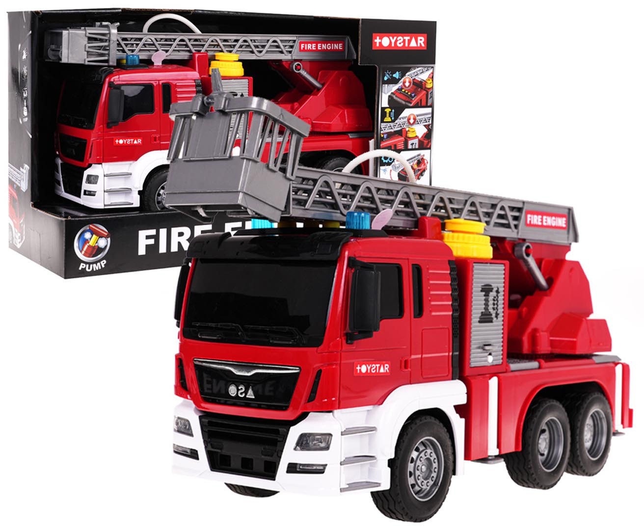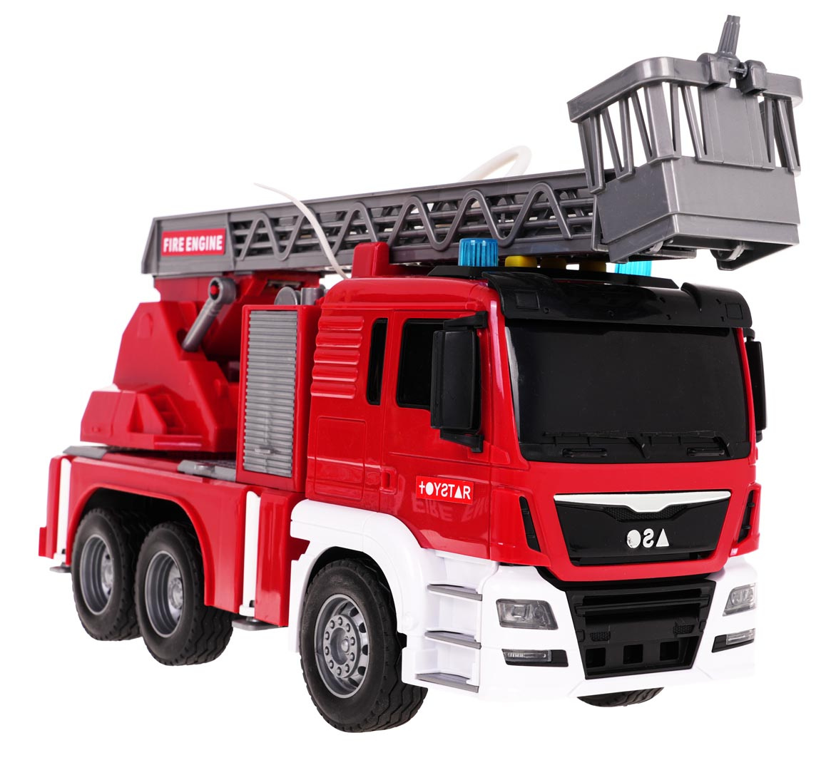 Interaktivní hasičský vůz s funkcí vody pro děti od 3 let. Chránič byl vyroben z plastu nejvyšší kvality v živých barvách. Má gumové pneumatiky, které dobře drží na povrchu, a pohon Friction. Na vrchu hasičského auta se nacházejí tlačítka zodpovědná za generování zvuků sirén, zvuků startování vozidla a chodu motoru. Po stranách zvukových tlačítek jsou také svítící světélka. Žebřík hasičského vozu můžeme zvedat a spouštět a vysouvat dopředu (manuálně). Po naplnění nádržky umístěné u kabiny vozidla vodou a stisknutí pumpičky bude z hadice vytékat voda. Hračka je napájena bateriemi typu 3 x AG13 (v balení).