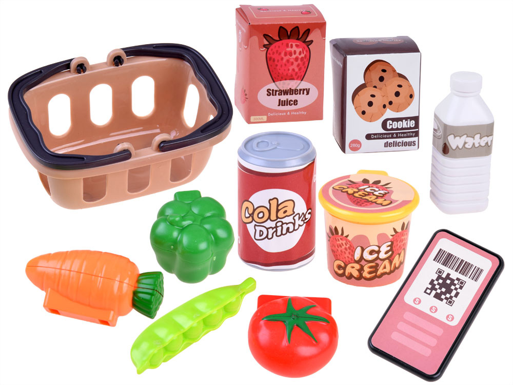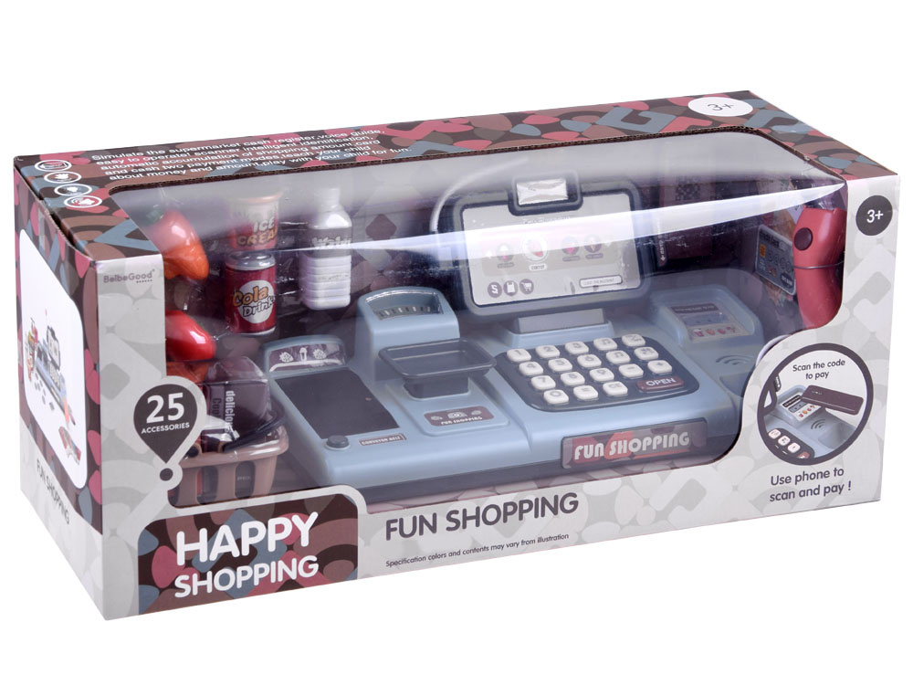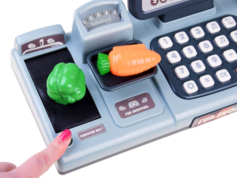 Fiskální pokladna je základním vybavením každé cukrárny, prodejny potravin, více poboček atd. Hra na obchod a prodavače patří mezi oblíbené hry malých dětí. Pokladna má softwarové tlačítko kalkulačky pro sčítání, odčítání a sčítání. Pokladna je vybavena displejem LCD, na kterém se zobrazují číslice. Tlačítka u pokladny a čtečka potravin se zvukem umožňují profesionální obsluhu zákazníků. Čtečka skenuje zboží stejně jako ve skutečném obchodě. Jednoduše položte výrobek na skener, stiskněte tlačítko na skeneru a uslyšíte zvuk skenovaného výrobku. Na displeji se zobrazí částka za naskenovaný výrobek, stačí stisknout tlačítko (+) a můžete pokračovat ve skenování zbývajících výrobků. Pokladna je vybavena terminálem, takže náš malý zákazník bude moci po nákupu a shrnutí (= ) zaplatit hotově, kartou nebo dokonce chytrým telefonem, stejně jako rodiče v obchodě. Pokladna je navíc vybavena váhou a pásem, na který může zákazník položit svůj nákup. Páska se pohybuje stisknutím tlačítka. Hra na prodavače, obchodníka a obchodníka je vždy vzrušující a poučná.