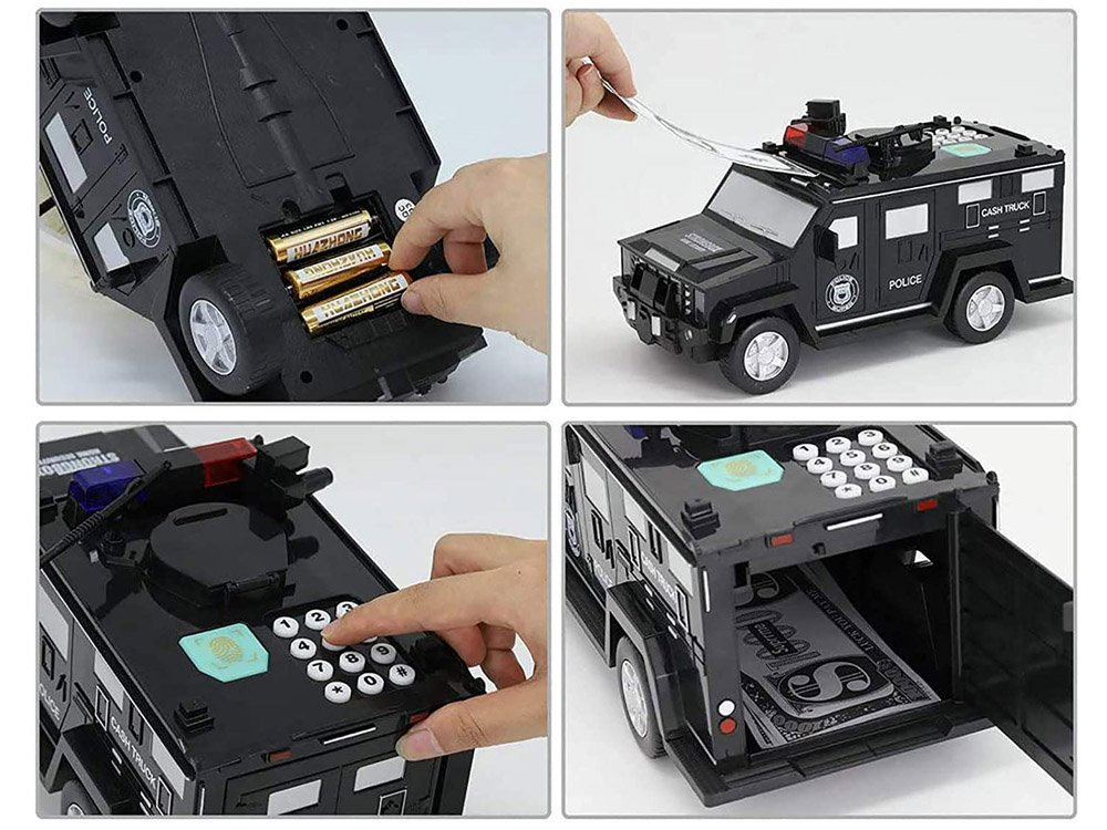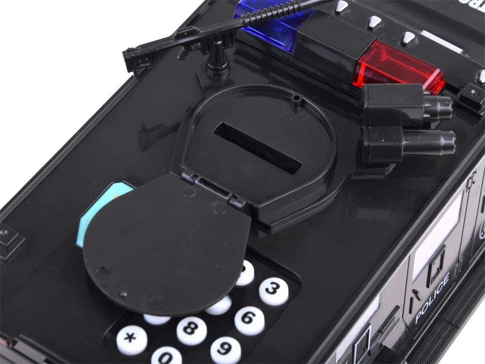 Policejní vůz s pokladnou je vůz pro speciální úkoly. Úkolem auta se zvukovými efekty je ochrana a úschova dětských úspor. Tento vůz tyto požadavky splňuje. Policejní auto má přístupový kód, který automaticky otevře dveře po naskenování otisku prstu, a v autě jsou také ukryty úžasné zvukové efekty. Policejní auto má být hračka, ale ve skutečnosti je to trezor na vaše peníze : )