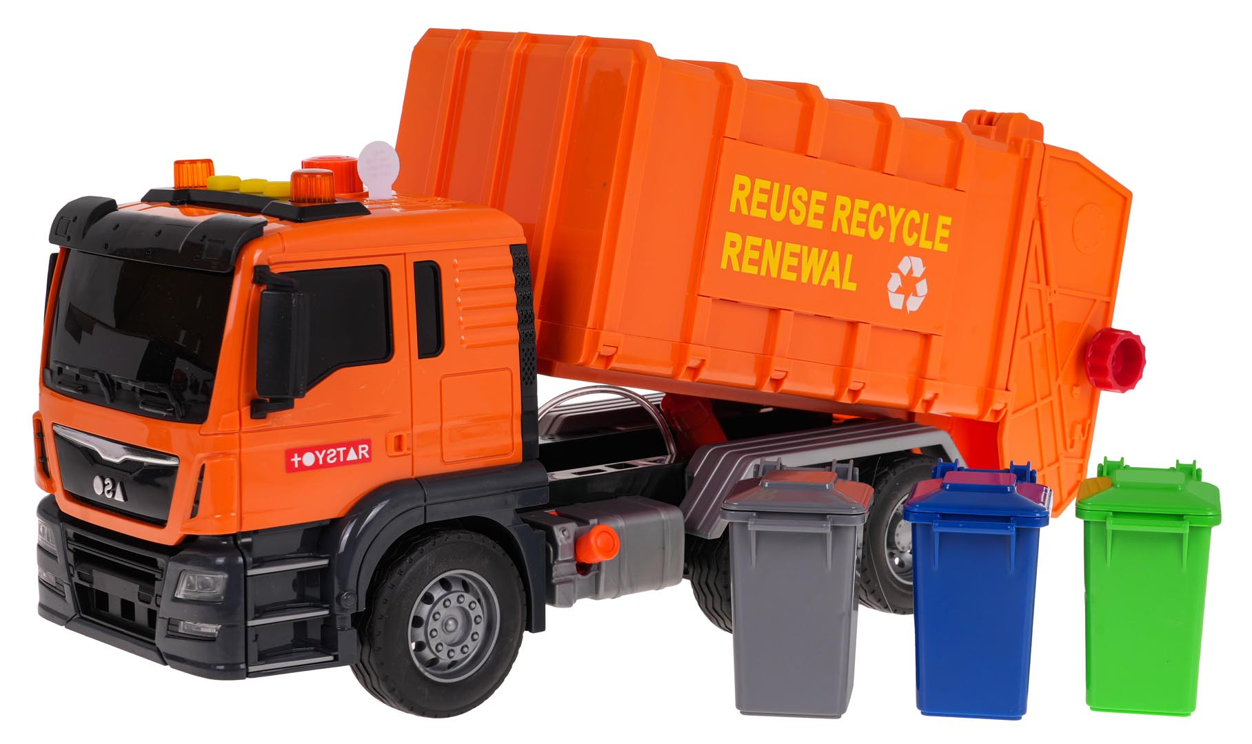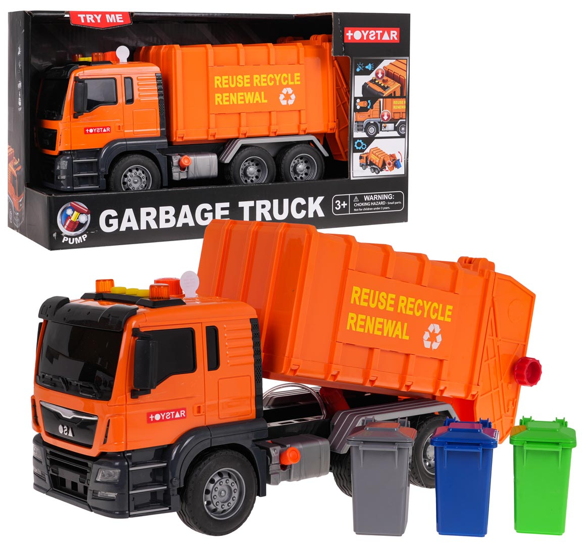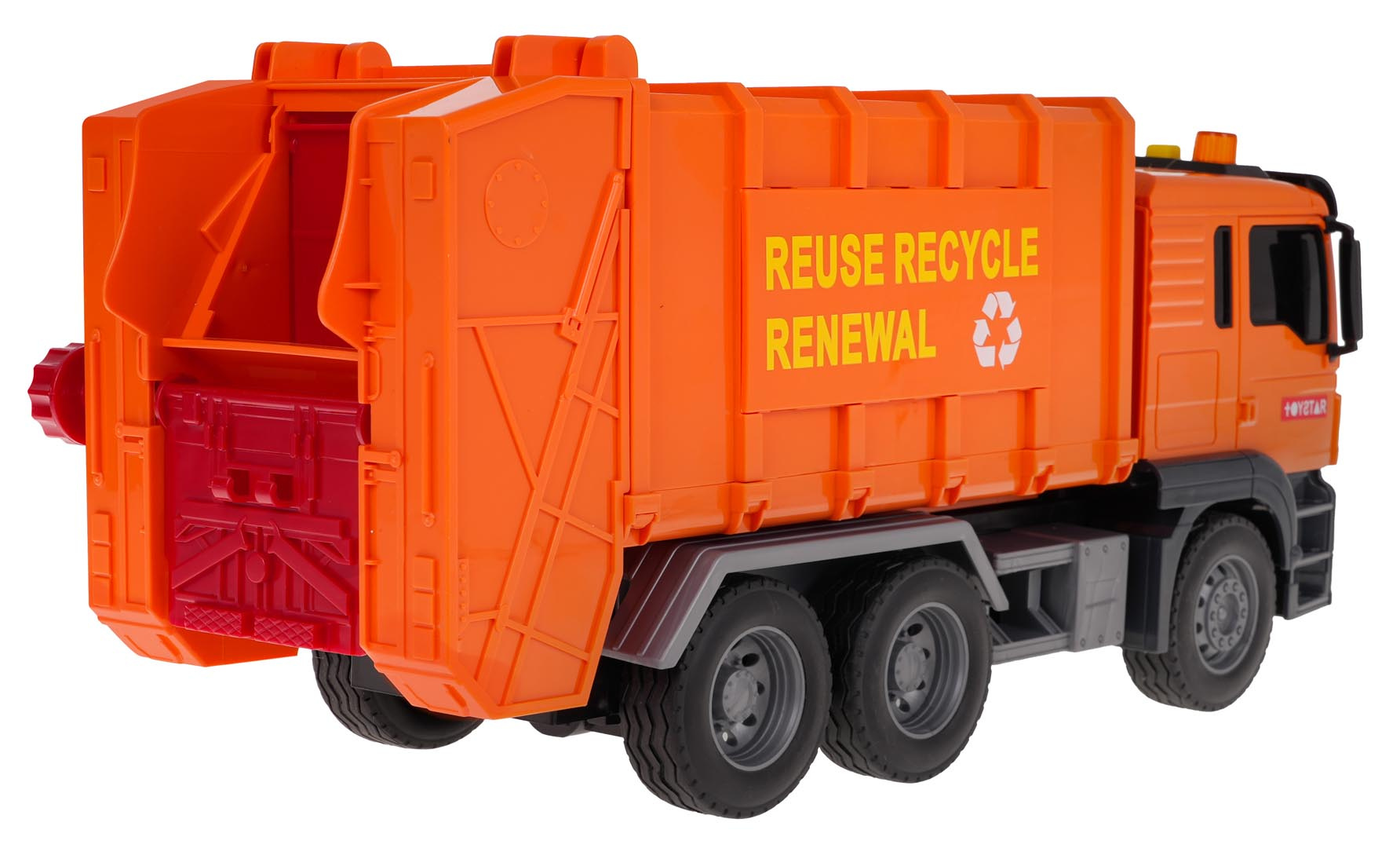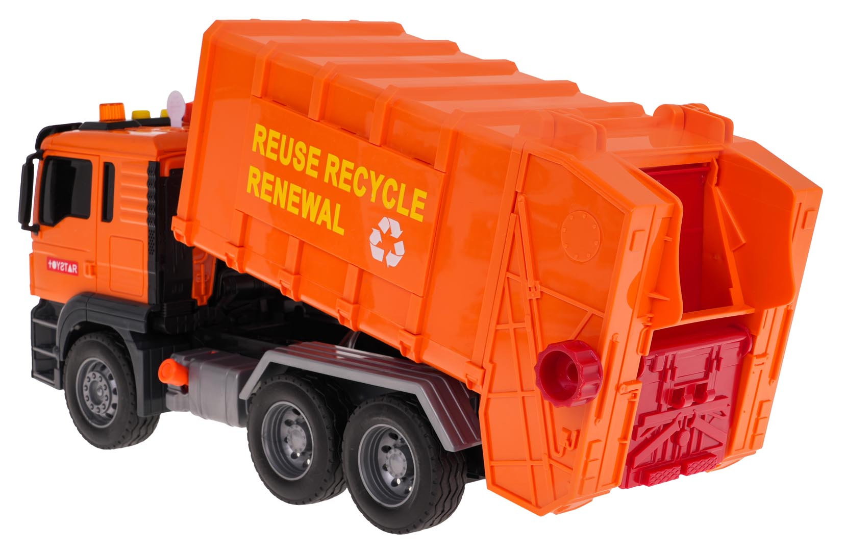 Oranžový popelářský vůz s funkcí zvuku pro děti od 3 let. Byla vyrobena z nejkvalitnějšího plastu a má pohyblivé části. Zadní část popelářského vozu je zvedána (tlačítko nahoře v kabině) a spouštěna (tlačítko na úrovni kol), klapku popelářského vozu můžeme zvedat a spouštět, navíc můžeme vyprázdnit popelnice díky pohyblivému zvedáku (klička vzadu na vozidle). Na střeše popelářského vozu se nachází panel s tlačítky, která spouštějí zvuky motoru, klaksonu a zvuk nakládání odpadků. Zvukům doprovázejí blikající světýlka na střeše kabiny. Smetiarka má gumové pneumatiky a pohon na přední kola. Hračka je napájena bateriemi typu 3 x AG13 (včetně).