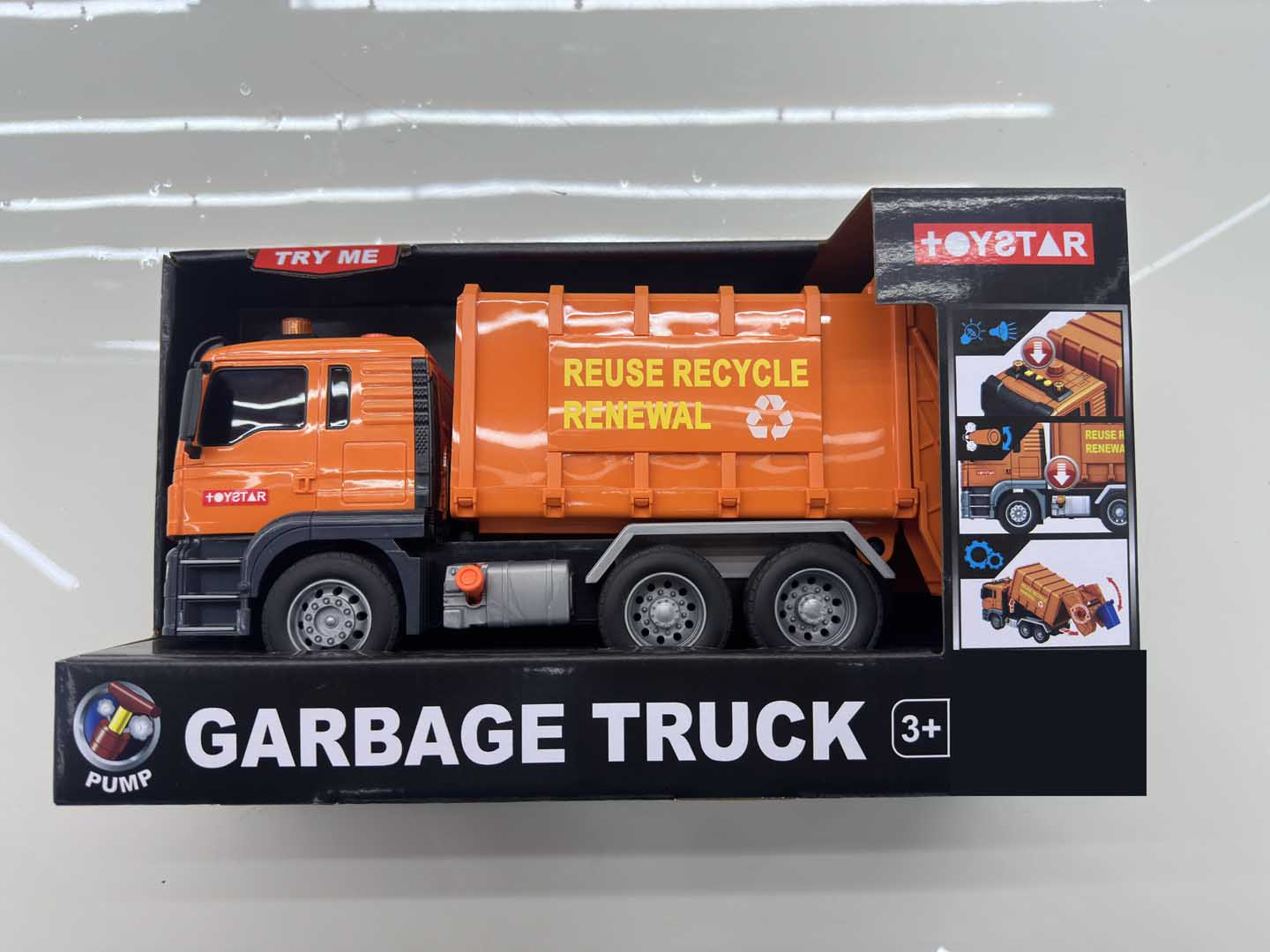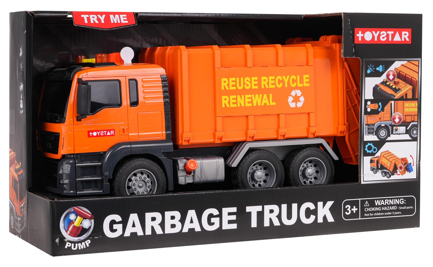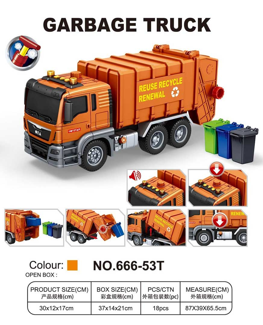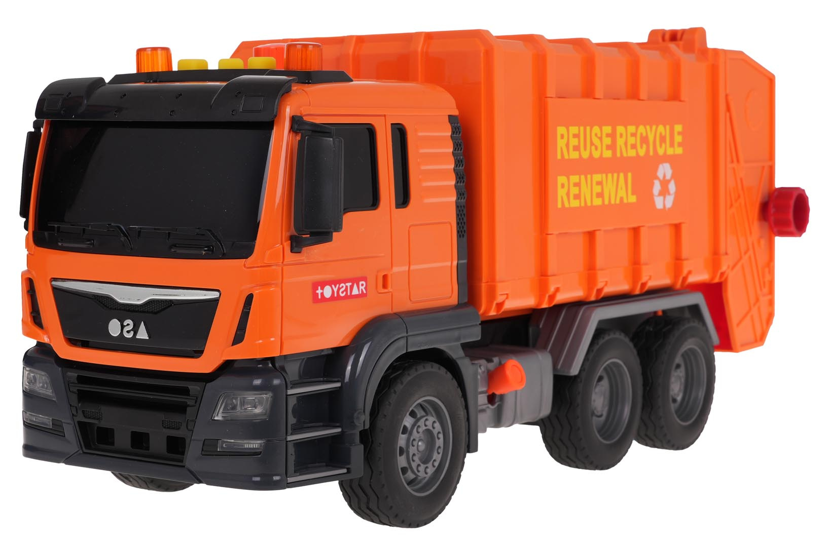 Oranžový popelářský vůz s funkcí zvuku pro děti od 3 let. Byla vyrobena z nejkvalitnějšího plastu a má pohyblivé části. Zadní část popelářského vozu je zvedána (tlačítko nahoře v kabině) a spouštěna (tlačítko na úrovni kol), klapku popelářského vozu můžeme zvedat a spouštět, navíc můžeme vyprázdnit popelnice díky pohyblivému zvedáku (klička vzadu na vozidle). Na střeše popelářského vozu se nachází panel s tlačítky, která spouštějí zvuky motoru, klaksonu a zvuk nakládání odpadků. Zvukům doprovázejí blikající světýlka na střeše kabiny. Smetiarka má gumové pneumatiky a pohon na přední kola. Hračka je napájena bateriemi typu 3 x AG13 (včetně).