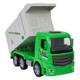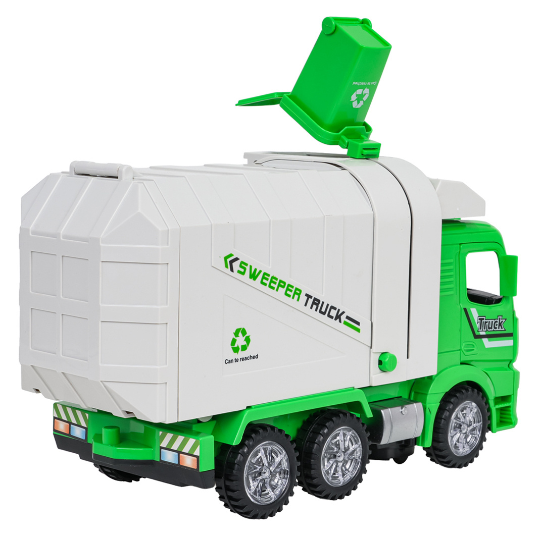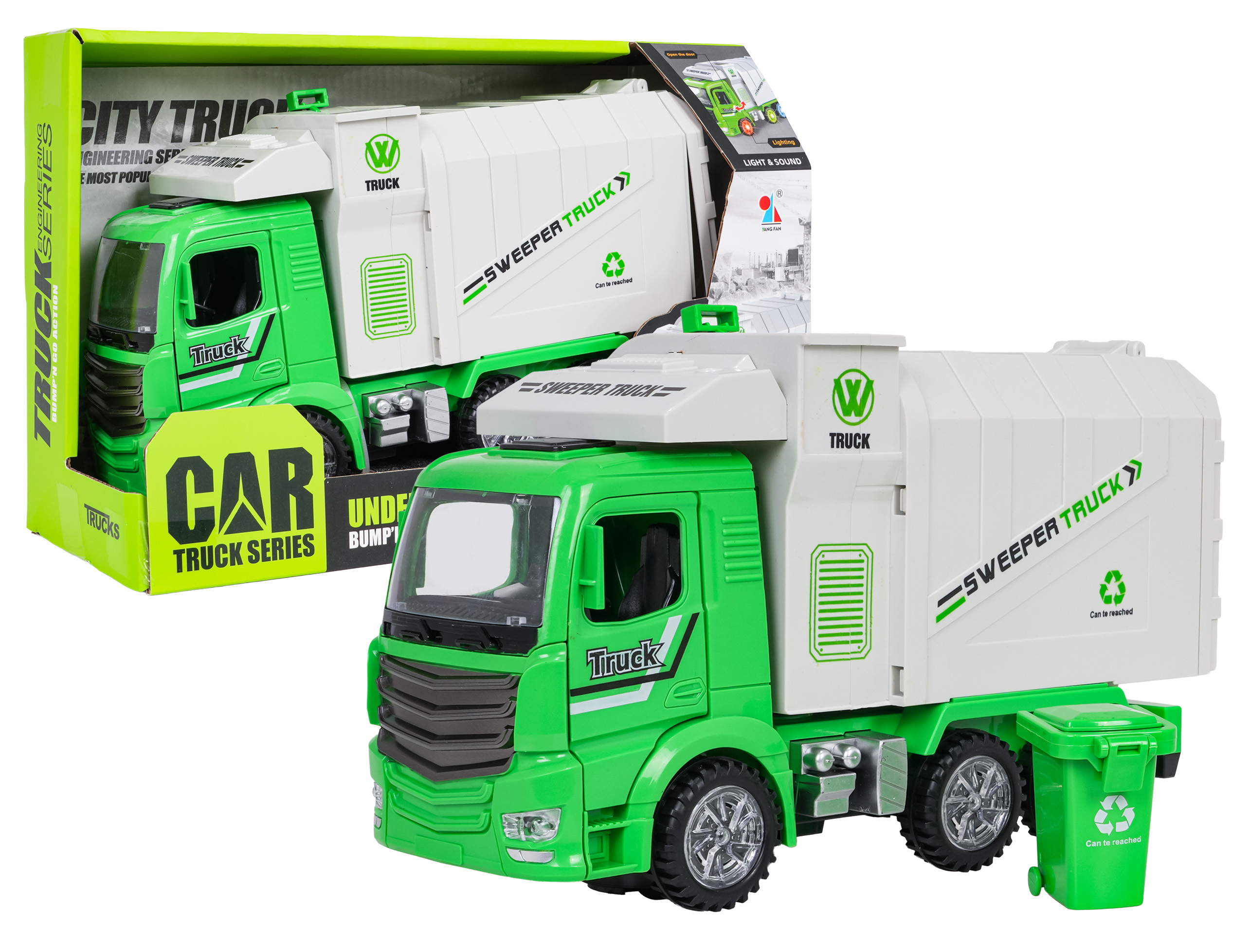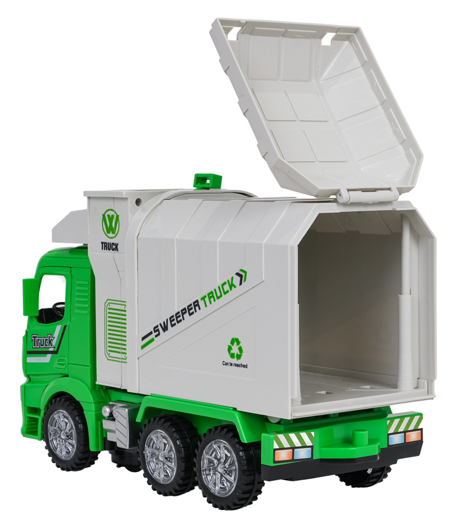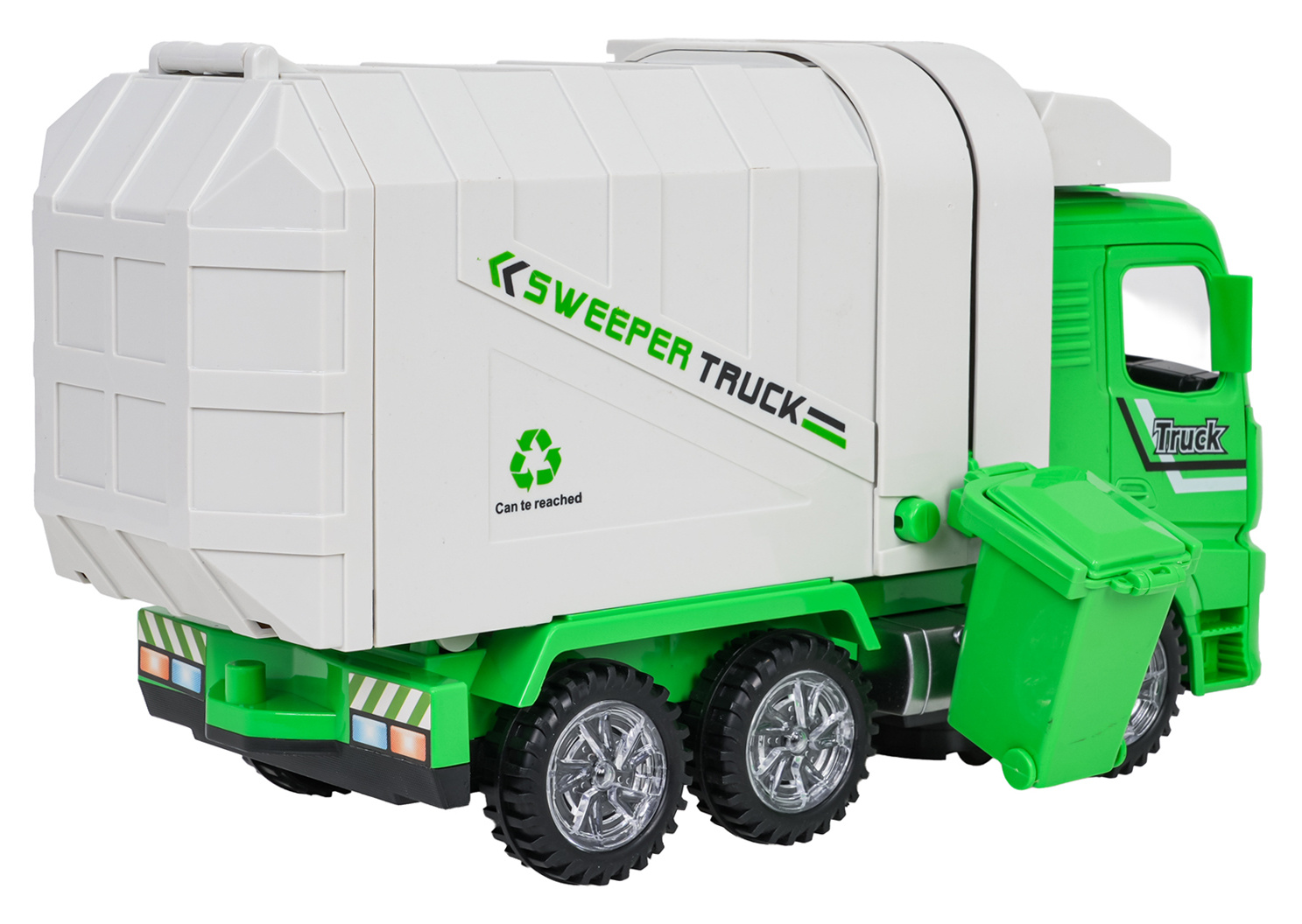 Interaktivní popelářské auto s funkcí zvuku a světla pro děti od tří let. Popelářské auto bylo vyrobeno z nejkvalitnějšího plastu, s důrazem na detaily. Kolečka vozidla jsou podsvícená a na spodní straně se nachází otočné kolečko umožňující jízdu všemi směry. Hračka vydává zvuky jízdy, klaksonu, brzdění a veselé melodie. Během jízdy se také otevírají dveře nákladního vozu, zvedá a spouští kontejner, svítí přední světla. Koš na odpadky je součástí sady, lze jej připevnit na bok popelářského vozu a vysypávat z něj odpad přímo do skluzu, navíc můžeme zvedat kontejner a jeho zadní klapku (manuálně). Hračka je napájena bateriemi typu 3 x AA 1,5 V (nejsou součástí balení).