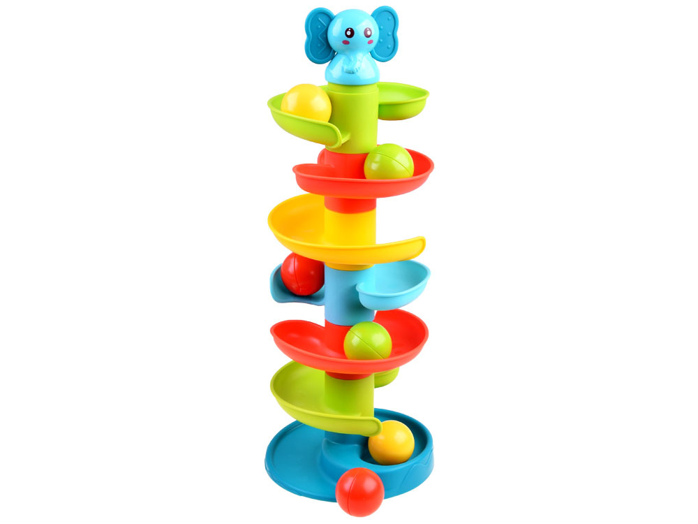 Barevná kroucená kuličková dráha je vysoká kroucená věž, na jejímž vrcholu triumfuje roztomilý slon s gumovýma ušima, který může sloužit jako kousátko pro batolata. Kuličková dráha je pro děti, které mají rády akci - něco se děje, něco se točí! Barevná dráha se skládá ze šesti barevných plošin, stojanu a překryvného prvku ve tvaru slona a poskytne spoustu pozitivní zábavy každému malému dítěti. Děti hravě vypustí míčky ze stočené pyramidy a s radostným chřestěním sledují, jak se kutálejí ke dnu. Hračka je vyrobena výhradně z vysoce kvalitního plastu v atraktivních barvách.