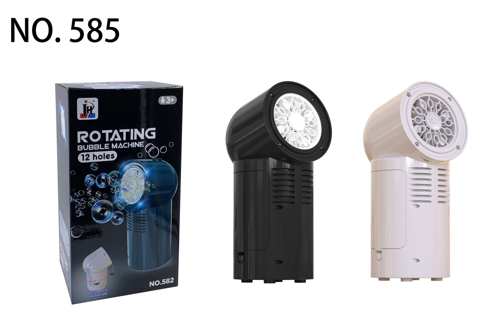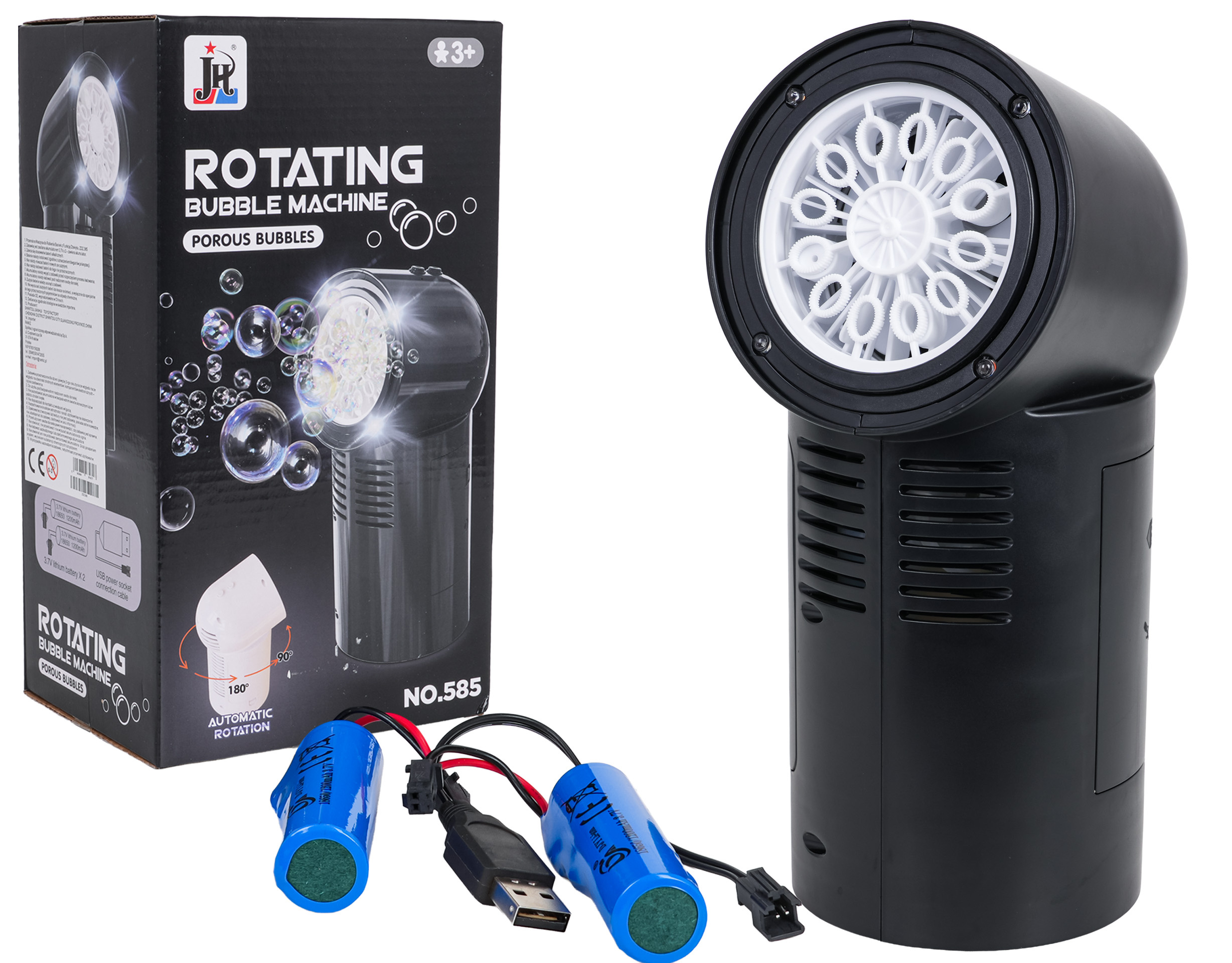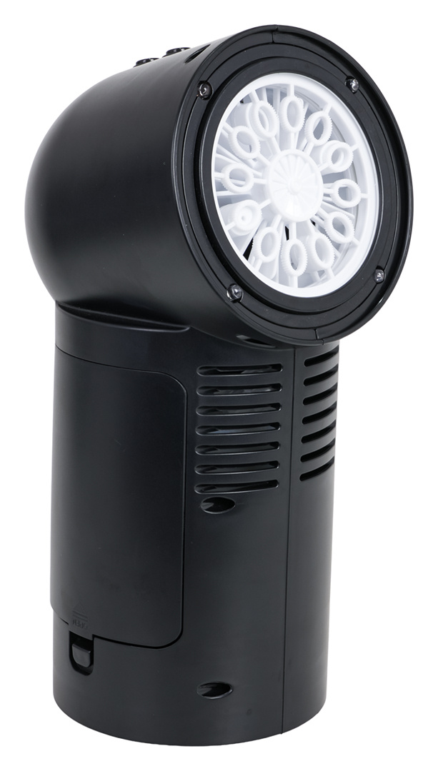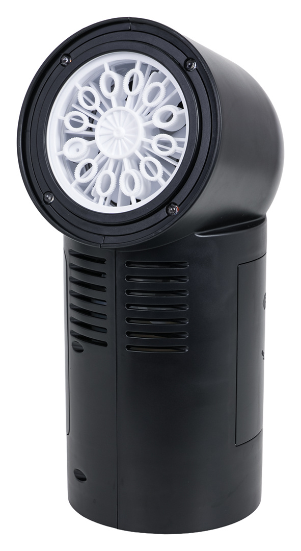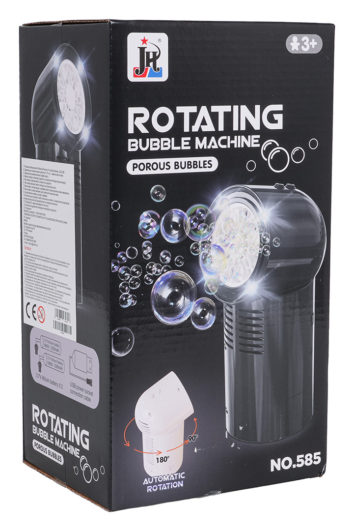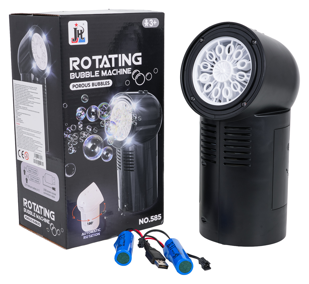 Přenosný stroj na výrobu bublin, výrobník pro děti od tří let, mládež a dospělé. Výkonný výrobník zpestří každou zábavu. Z trysky se uvolňují barevné mýdlové bubliny a tichý ventilátor nainstalovaný v přístroji je rozfoukává kolem. Dodatečně jsou bubliny osvětleny čtyřmi diodami umístěnými kolem trysky. Na vrcholu stroje je umístěno tlačítko odpovědné za otáčení, jedno stisknutí způsobí, že se stroj pomalu otočí o 90 stupňů, dvojité stisknutí otočí o 180 stupňů, trojité stisknutí vypne otáčení. Generátor je napájen akumulátorem typu 3,7V (v sadě se nacházejí dva akumulátory).