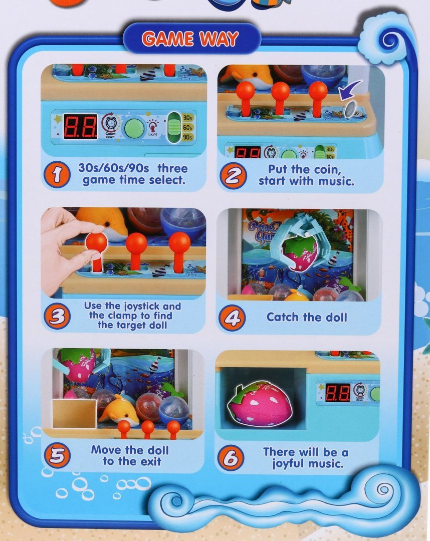 Cílem hry je chytit míč (10 dílků v balení.) s chapadlem umístěným ve stroji, v závislosti na obtížnosti na to máme 30 s, 60 s nebo 90 s.