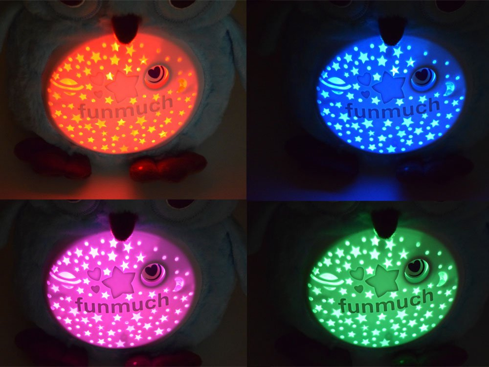 Měkké světlo měnící barvy vytváří klidnou auru, která napomáhá usínání. Díky otvorům na břiše hračky vznikají krásné výstupky ve tvaru hvězd, měsíce a planet. Celé to doprovází uklidňující relaxační hudba se zvuky přírody v pozadí. Hračka obsahuje více než tucet různých ukolébavek. Hudební box hraje ukolébavky nepřetržitě téměř 20 minut. Pokud se naše miminko odebere do říše snů dříve, lze ukolébavky vypnout tlačítkem na bříšku. Sova má dvě úrovně hlasitosti, takže ji lze dokonale přizpůsobit potřebám dítěte.