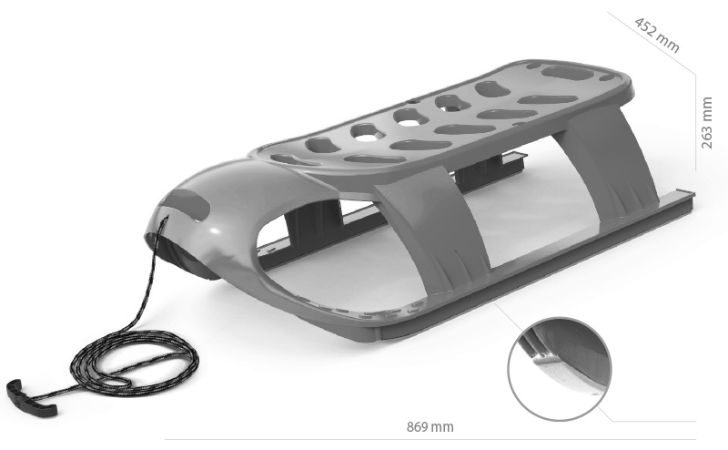 Sáně jsou vyrobené z vysoce odolného plastu a opatřené ocelovými skluznicemi, které zajišťují perfektní skluz po sněhu.
