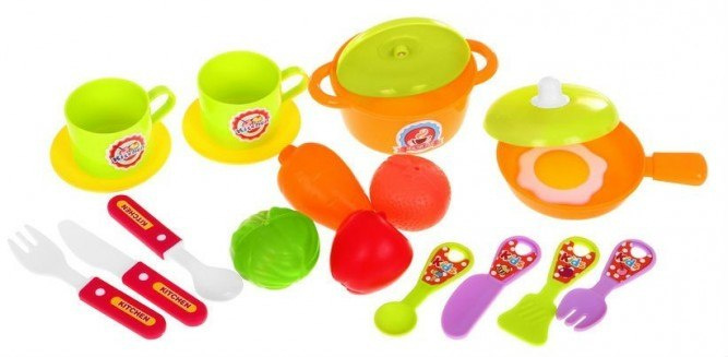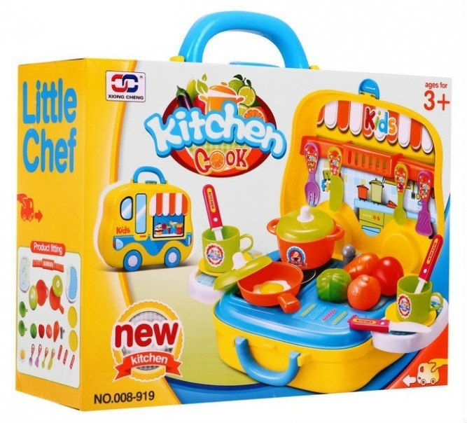 | Obsah sady: - přenosný rozkládací kufřík - autíčko na kolečkách, - horní deska s imitací indukčního vařiče, - 2 boční poličky, - věšák na kuchyňské náčiní, - hrnec s pokličkou, - pánev s pokličkou, - 2 talíře, - 2 hrnky, - 2 vidličky (menší a větší), - 2 lžíce (větší a menší), - 2 nože (menší a větší), - pánev, - kohoutek, - 4 druhy zeleniny/ovoce (paprika, mrkev, zelí, pomeranče), - smažené vejce, - barevné balení, ideální jako dárek. |
