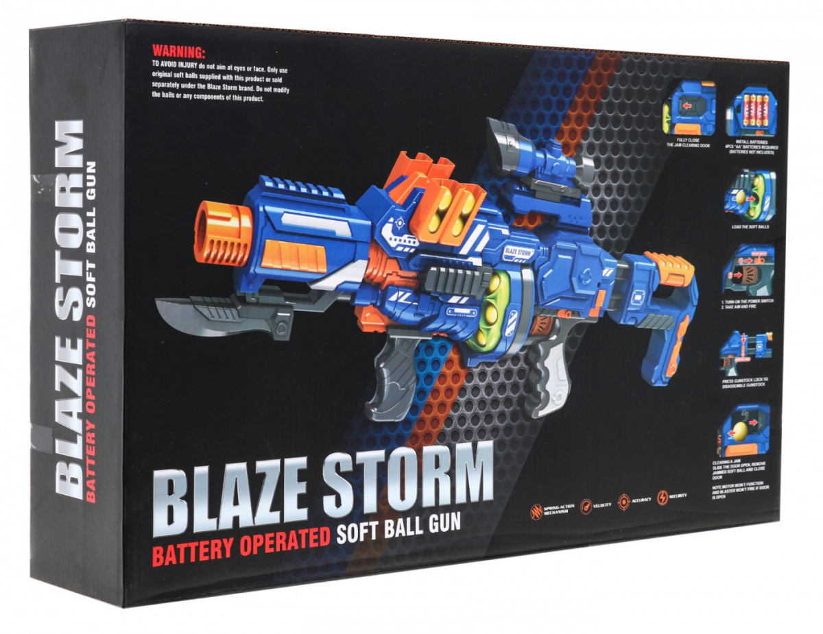 Blaze Storm je puška určená pro děti od 14 let. Každý malý vojenský nadšenec si s ním užije spoustu zábavy. Jedná se o plně elektrický automatický typ s bubnovým nabíjením. Puška má speciální posuvné vyhazovací okénko pro odstranění zablokovaných nábojů. Předností představené pušky je rychlá střelba, spolehlivost a funkčnost. Hračka je napájena 4 bateriemi AA 1,5 V, které nejsou součástí balení.