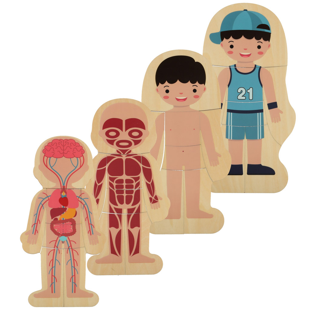 Puzzle ukazují lidský průřez včetně kostí, vnitřních orgánů, svalů a těla