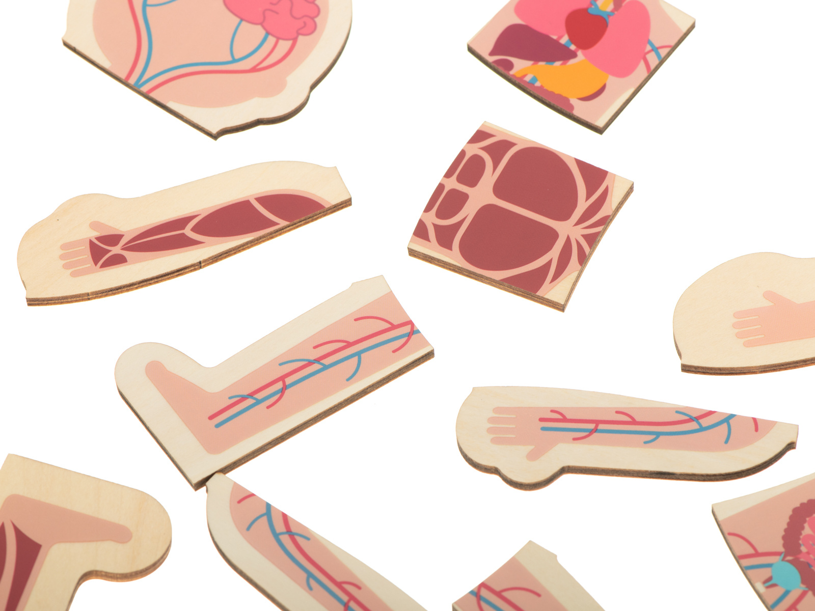Kousky skládačky se překrývají ve vrstvách. Úkolem batole je uspořádat lidskou kostru, vnitřní orgány, svaly, tělo a nakonec oblečení do pořadí.