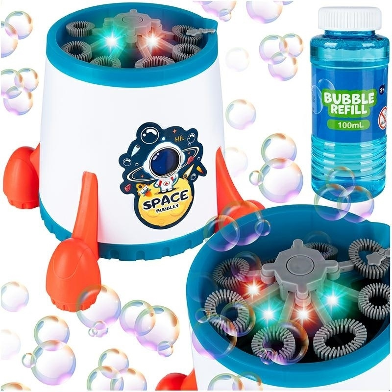 Výrobník mýdlových bublin ve tvaru rakety je ideální nápad na zpestření každé oslavy. Po přidání speciální kapaliny nebo mýdlové vody vytváří velké množství bublin a rozptyluje je kolem pomocí tichého ventilátoru. Zařízení může navíc přehrávat veselou hudbu. Specifikace: napájení: 4xAA (není součástí balení) nádržka s tekutinou na bubliny 100ml v balení rozměry: 21,5x21,5x16cm Hračka je určena pro děti od 3 let. Rozměry balení: 17x14x17,5 cm