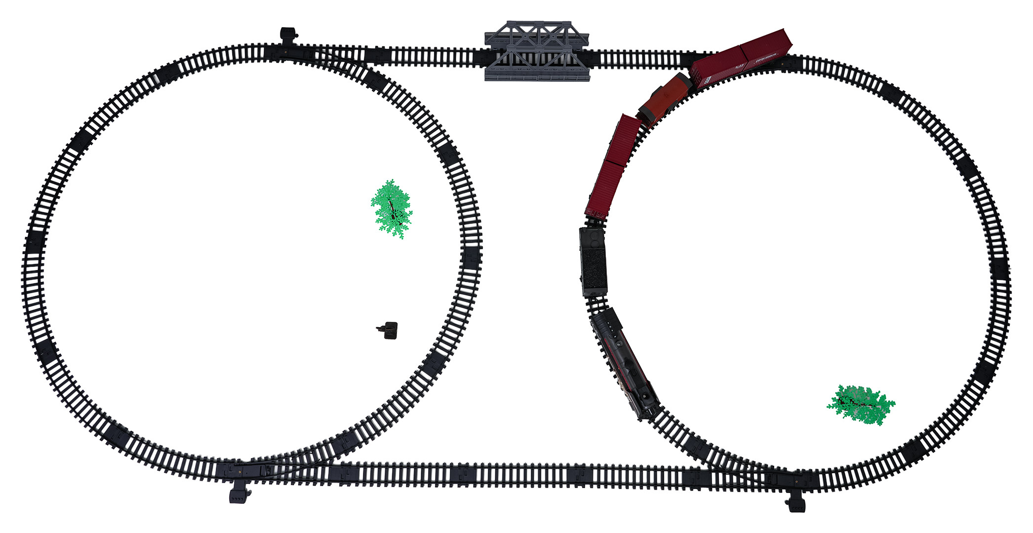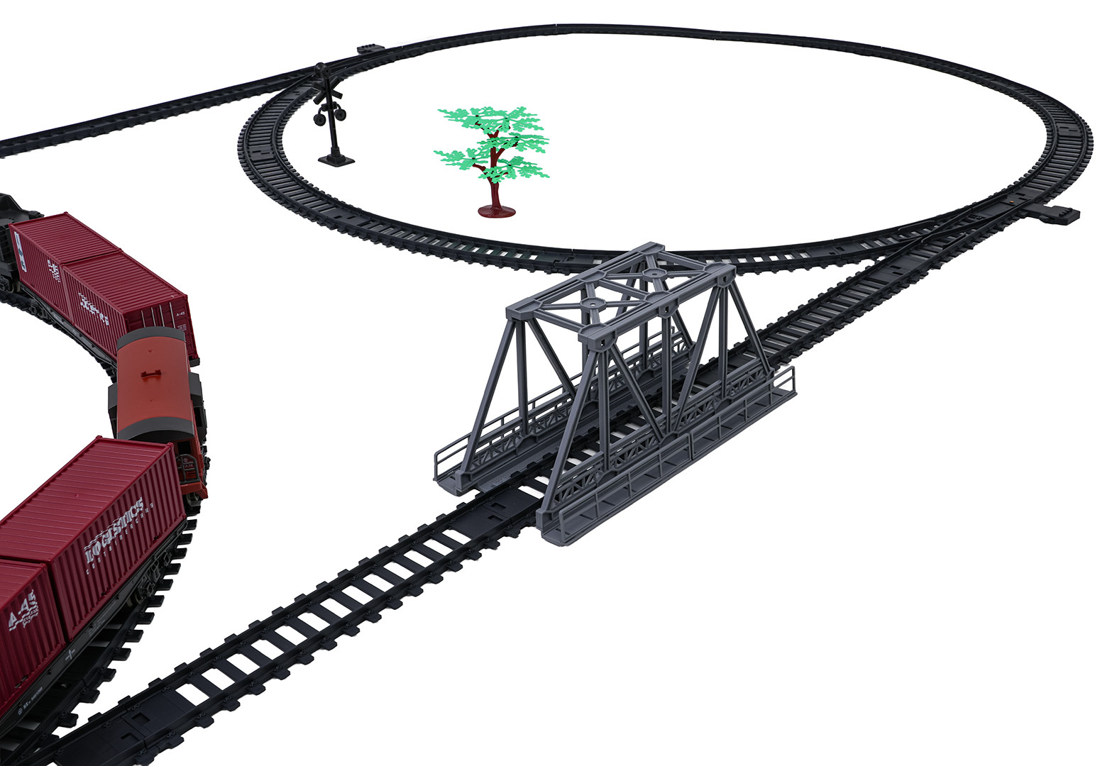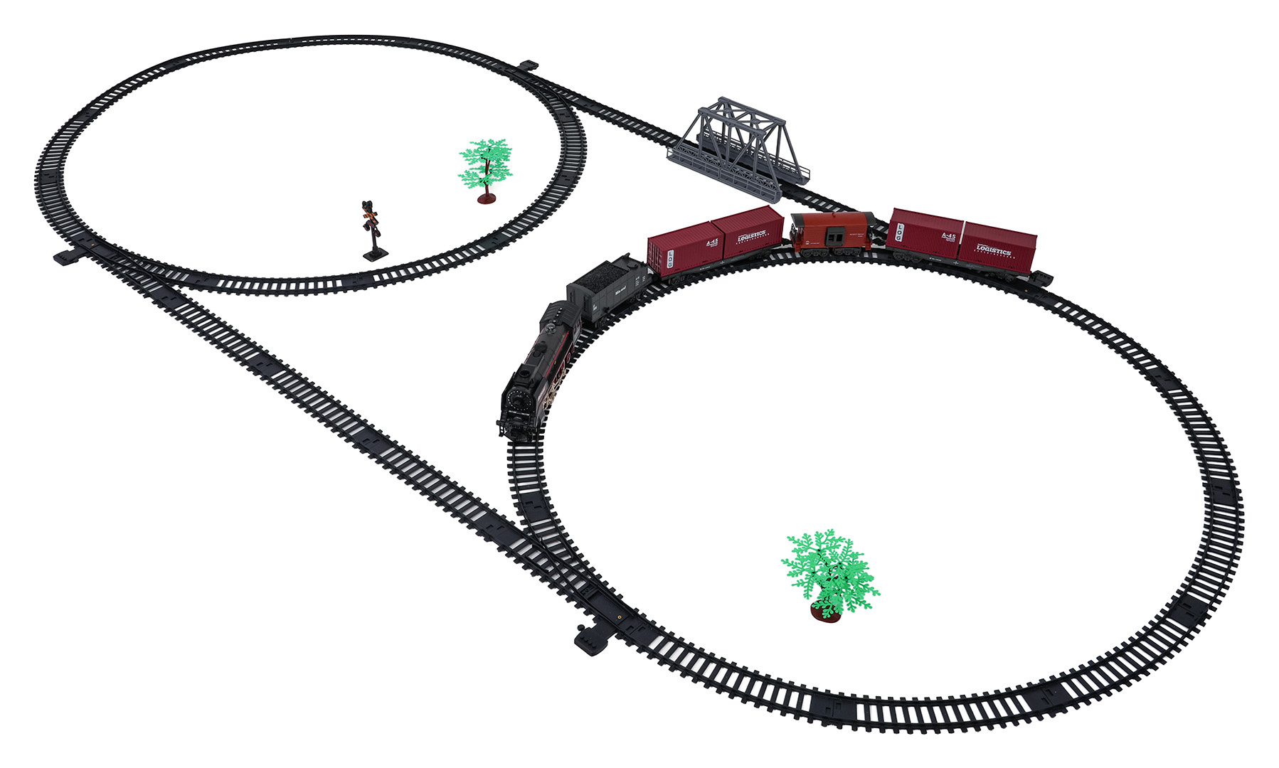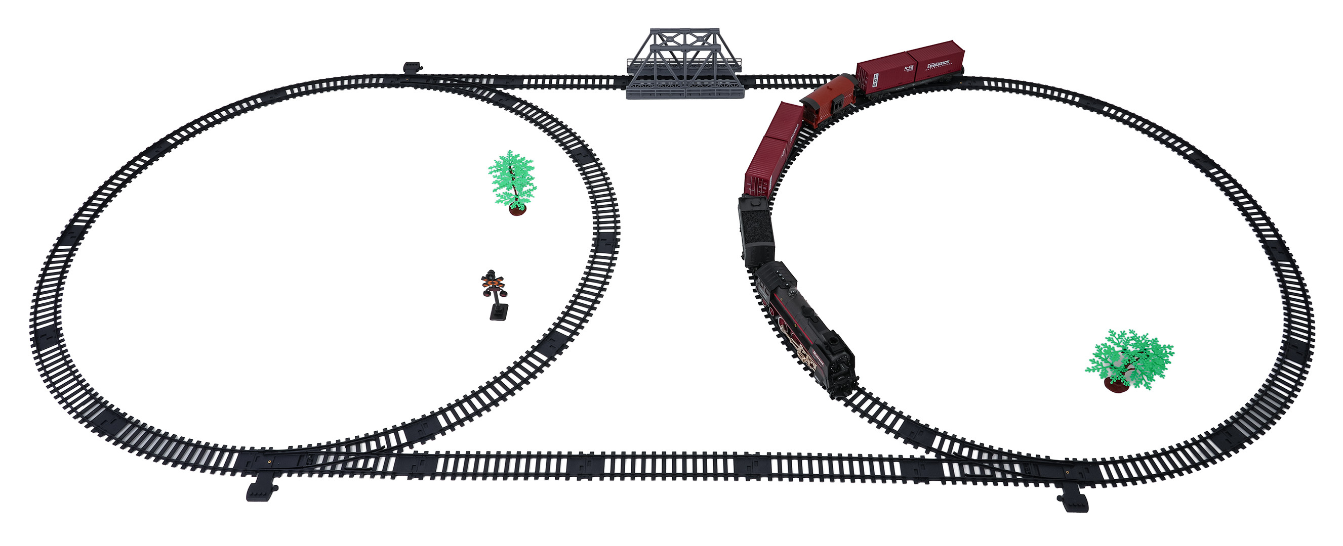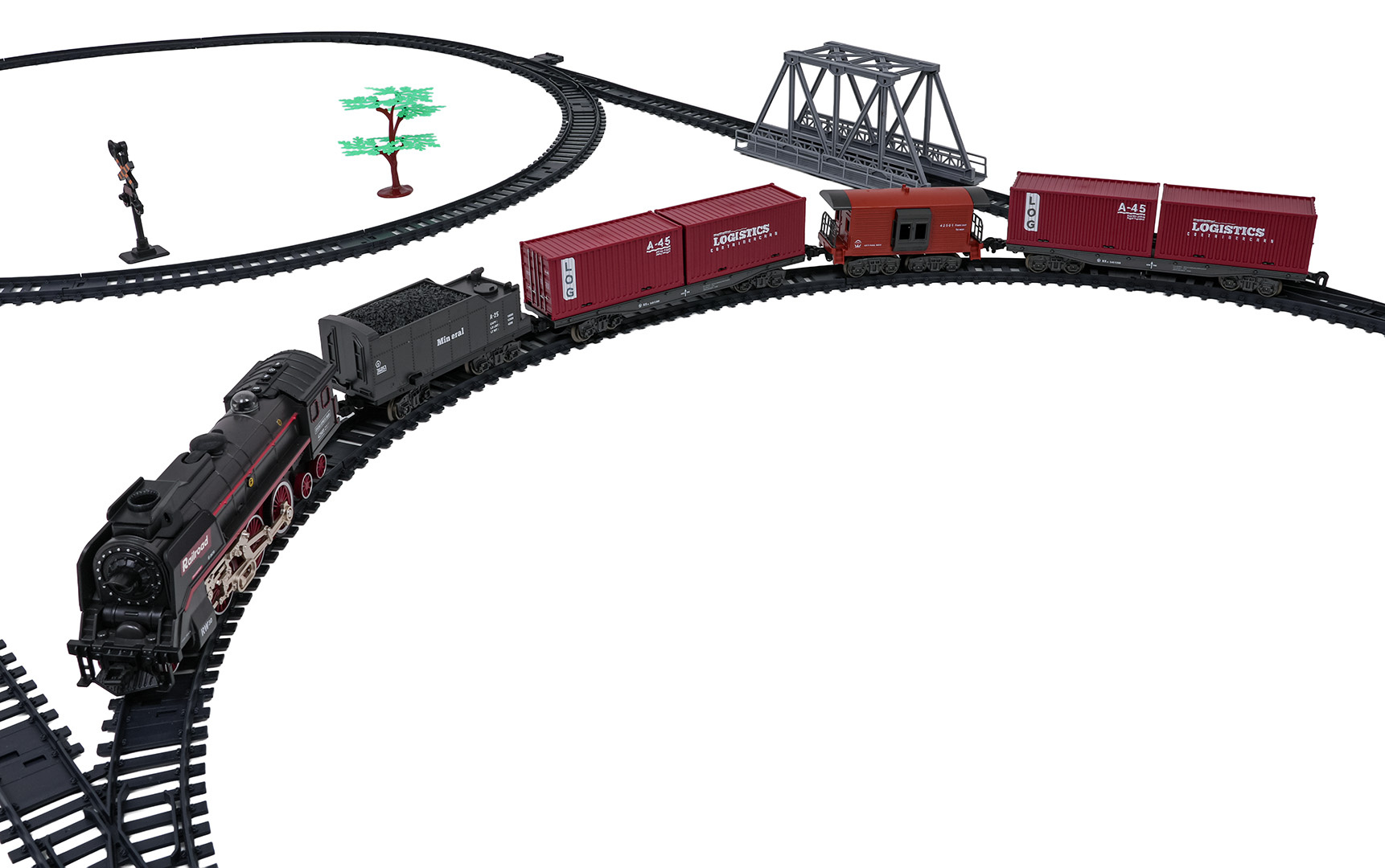 | Rozměry | - lokomotiva cca. 24,2 cm x 5,4 cm x 8,8 cm, - vůz s kontejnerem cca. 24,5 cm x 7 cm x 4,5 cm, - vagón s uhlím cca. 16,5 cm x 7,5 cm x 5 cm, - vůz pro zvířata cca. 14,5 cm x 6,5 cm x 4,5 cm, - trasa dráhy cca. 207 cm x 99 cm, - opakování cca 45 cm x 9 cm x 27,5 cm. |