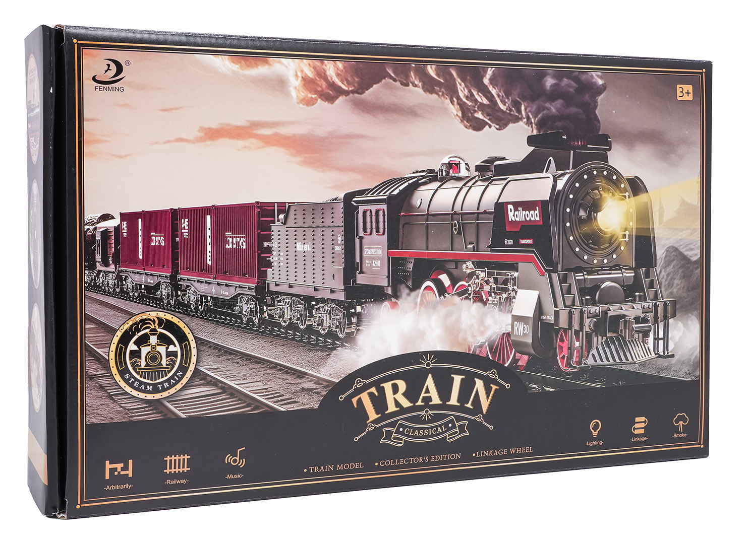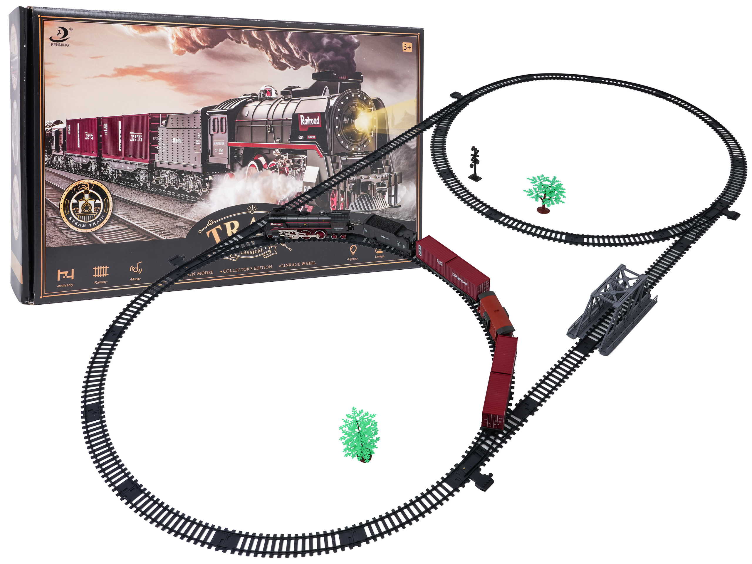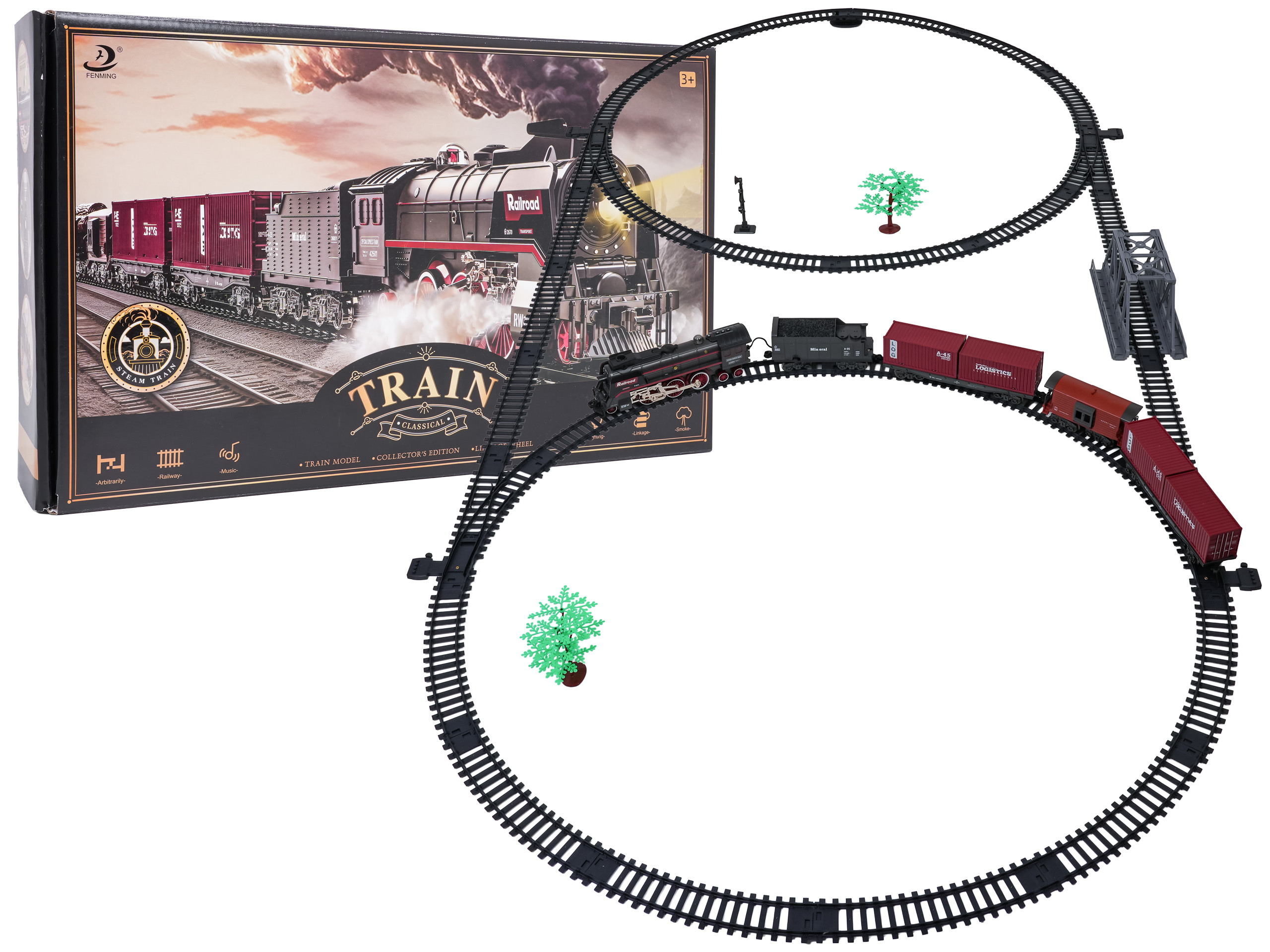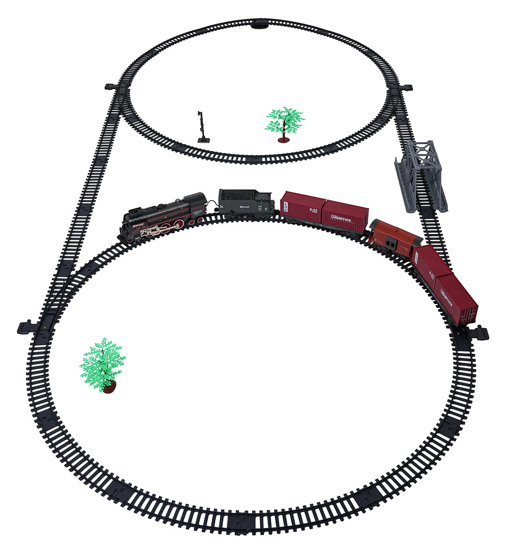 | Sada retro vláček s funkcí kouře, světla a zvuku pro děti od tří let. Hračka je napájena akumulátorem typu 3,7 V 1200 mAh (v balení). Během jízdy lokomotiva vypouští komínem a po svých stranách kouř, po předchozím doplnění vodou (pipetka na vodu je součástí sady), svítí přední reflektor a slyšíme zvuky jízdy. Koleje jsou odolné a bezpečné a mají snadný způsob spojování.