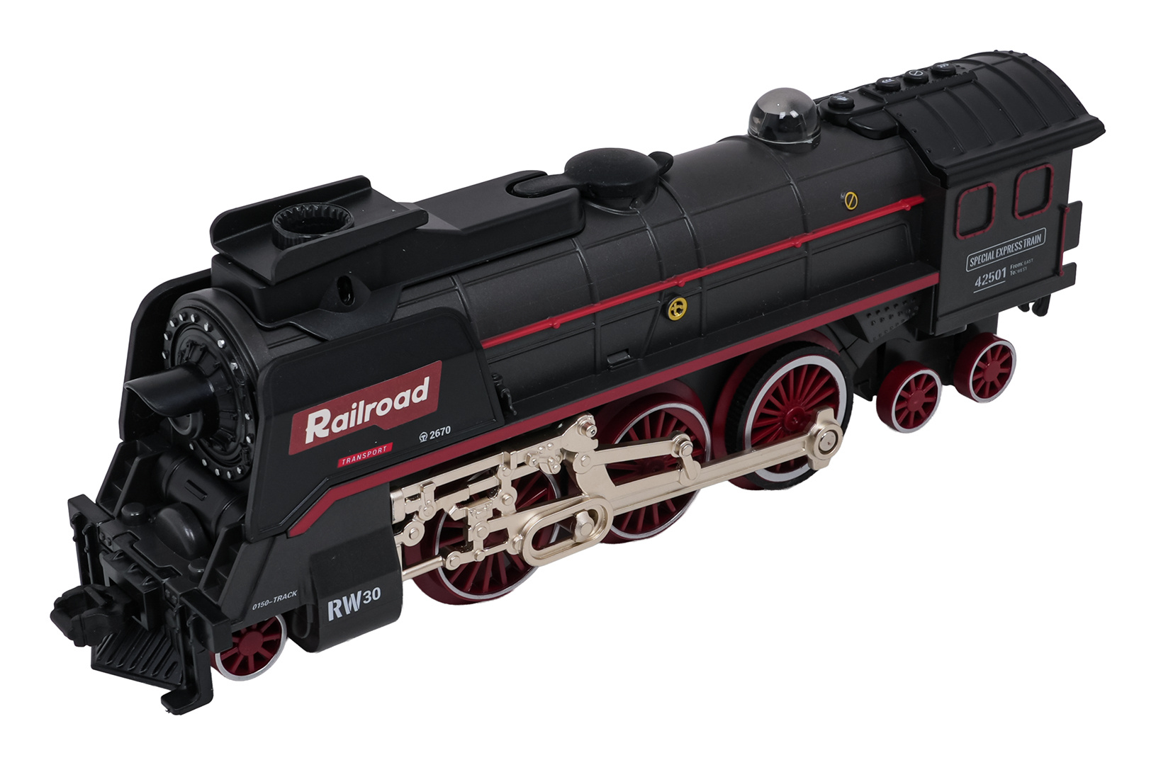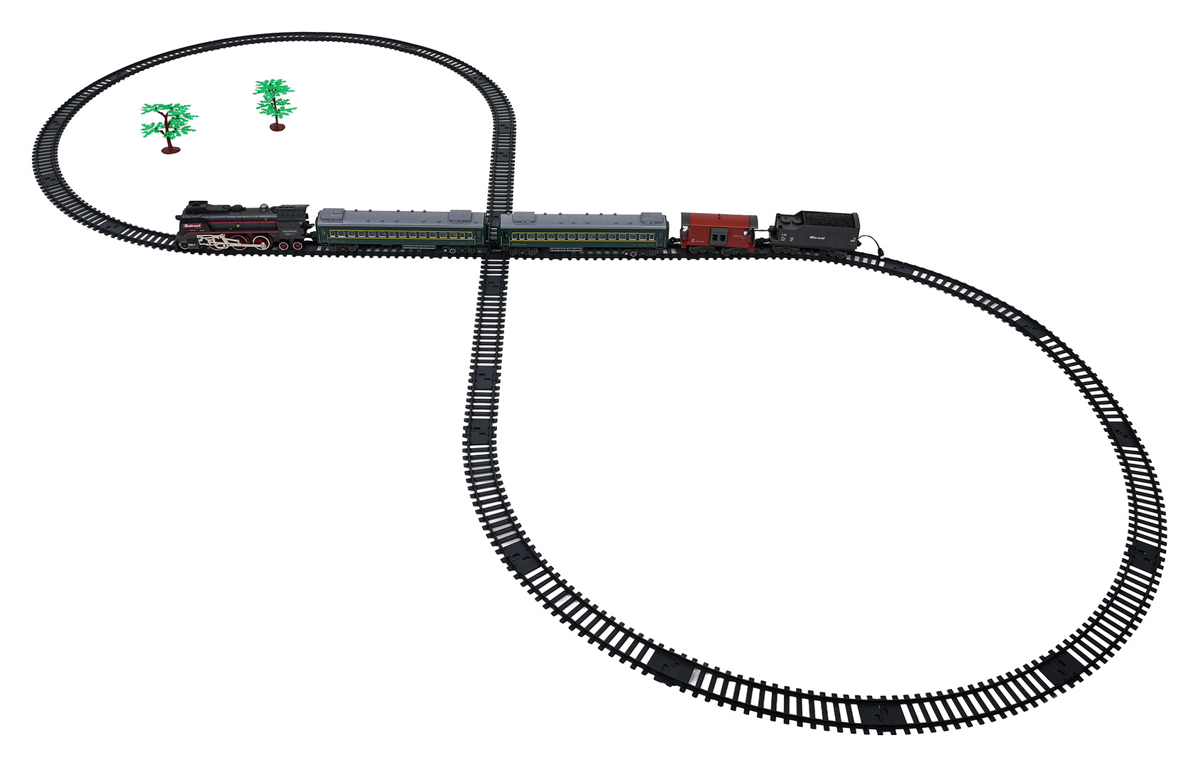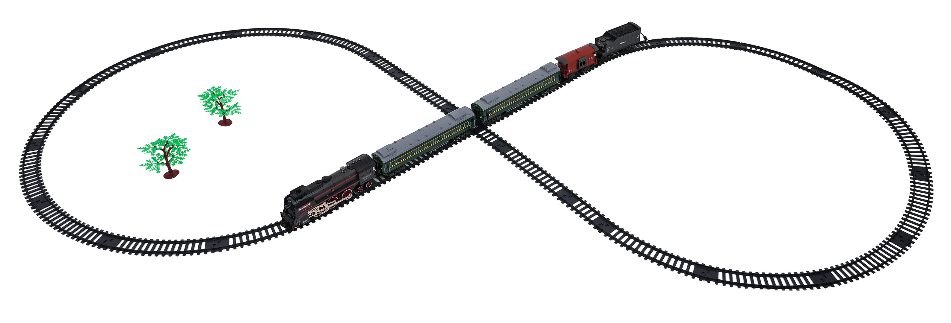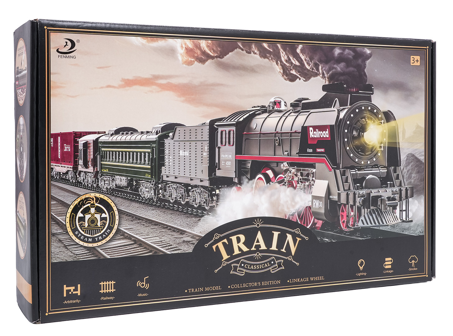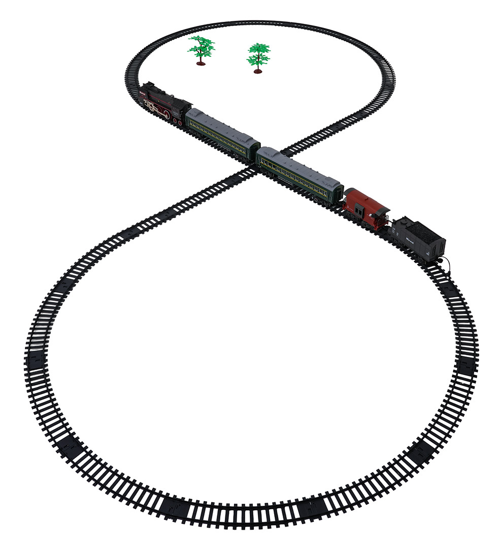 | Sada retro vláček s funkcí kouře, světla a zvuku pro děti od tří let. Hračka je napájena akumulátorem typu 3,7 V (v balení). Během jízdy lokomotiva vypouští komínem a po svých stranách kouř, po předchozím doplnění vodou (pipetka na vodu je součástí sady), svítí přední reflektor a slyšíme zvuky jízdy. Koleje jsou odolné a bezpečné a mají snadný způsob spojování.