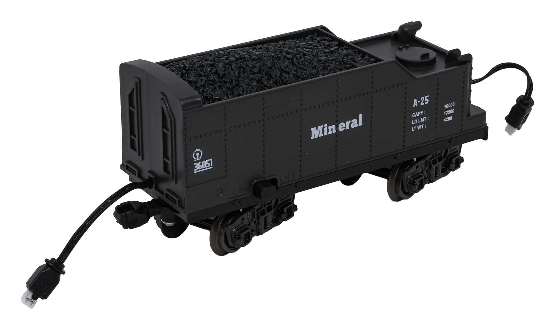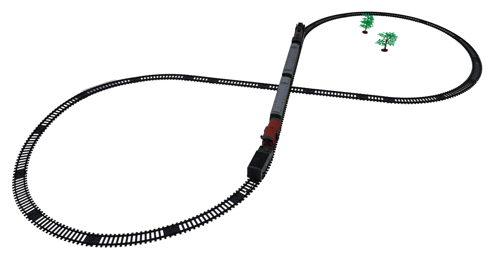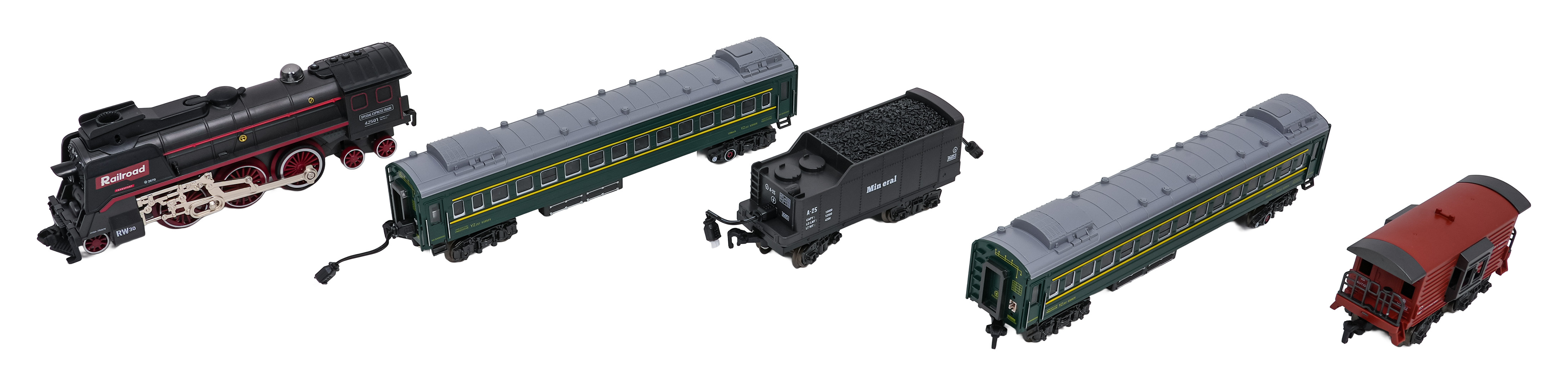 | - lokomotiva, - 2 x osobní vůz, - vagón s uhlím, - vůz pro zvířata, - součásti dráhy, - kabel pro nabíjení USB, - šroubovák, - pipeta na vodu. |