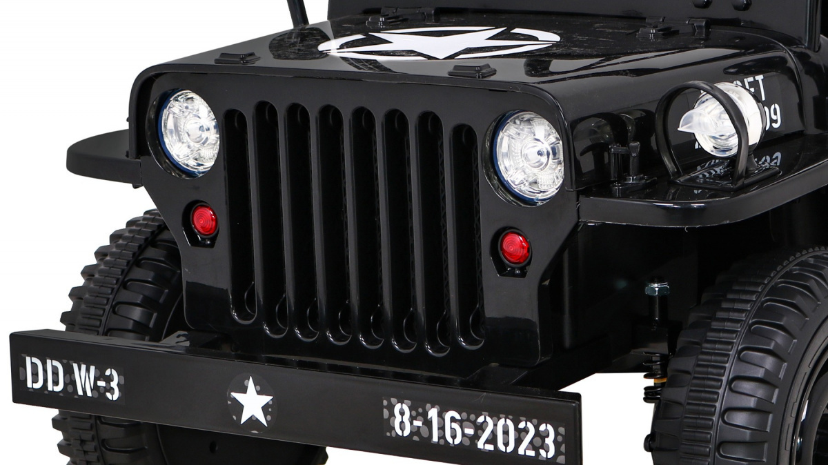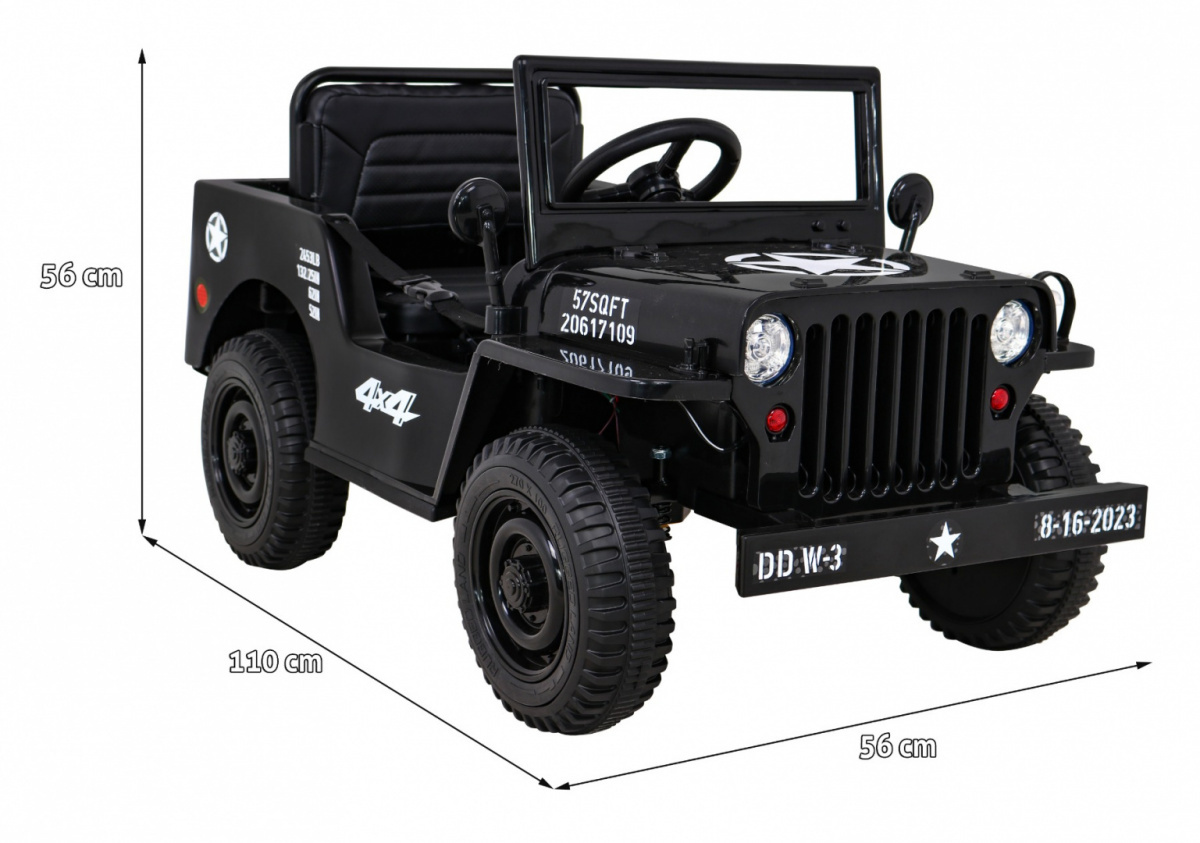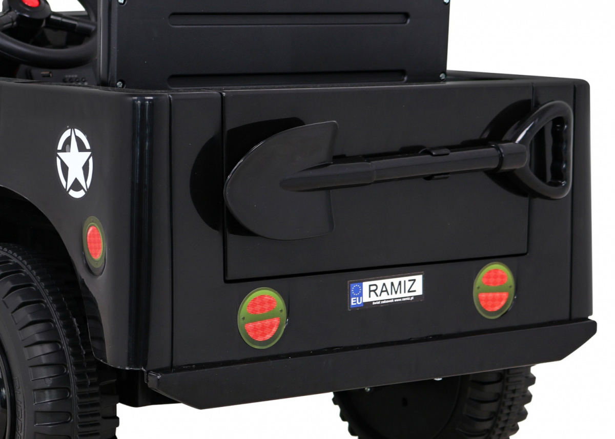Retro vojenské auto pro děti černé + pohon 4x4 + dálkové ovládání + 2 nosiče zavazadel + pomalý start + MP3 LED