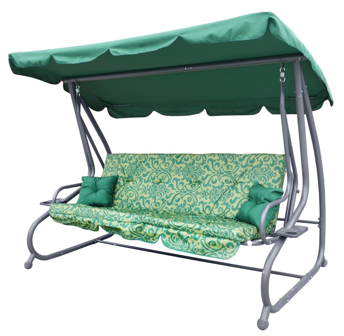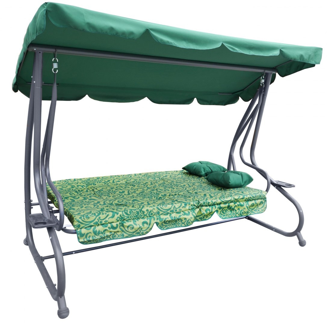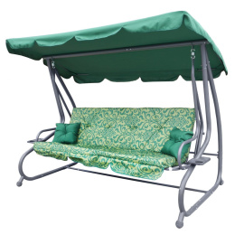 Rodinná zahradní houpačka se stříškou Zelený vzor + Textil 2x1 + Nastavitelné sedadlo + Matrace + 2 držáky na nápoje