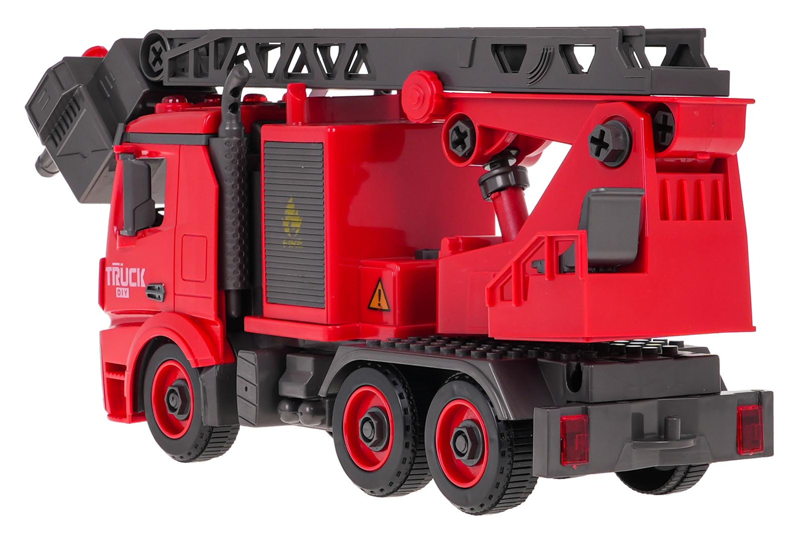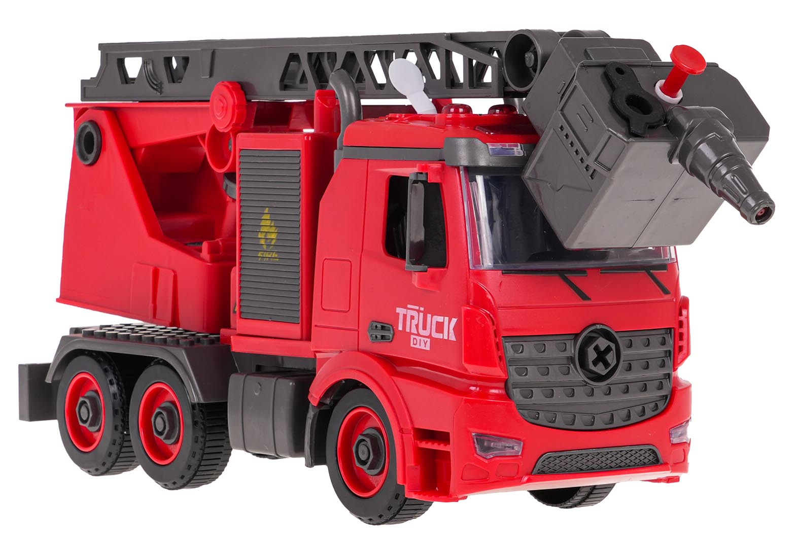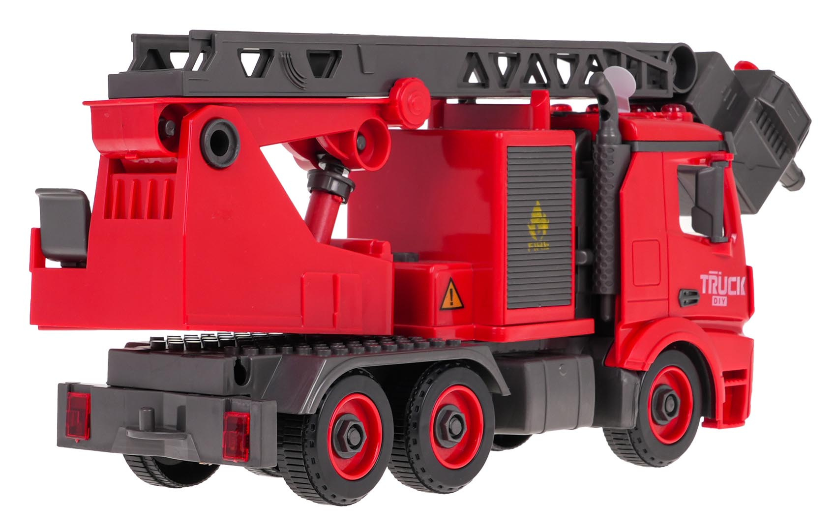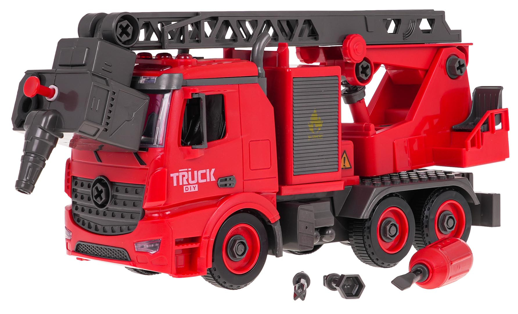 Interaktivní hasičský vůz k rozebírání s funkcí vody pro děti od 3 let. V sadě se nachází šroubovák s vyměnitelnými koncovkami pro rozebrání vozidla. Hasičský vůz má pohon předních kol. Na střeše hasičského vozu se nacházejí dvě blikající světla a funkční tlačítka. Tlačítka spouštějí zvuky alarmu, startování vozidla, couvání a klaksonu. Rameno hasičského vozu lze zvedat, spouštět a vysouvat ručně. Můžeme s ním otáčet také o 360 stupňů. Po naplnění nádržky vodou a stisknutí tlačítka na koncovém stupni hasičské hadice bude stříkat voda. Hračka je napájena bateriemi typu 3 x AG13 (v balení).