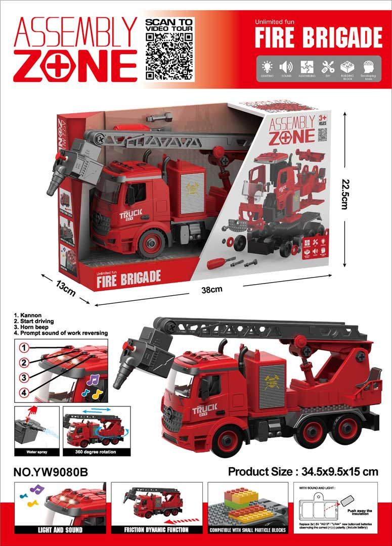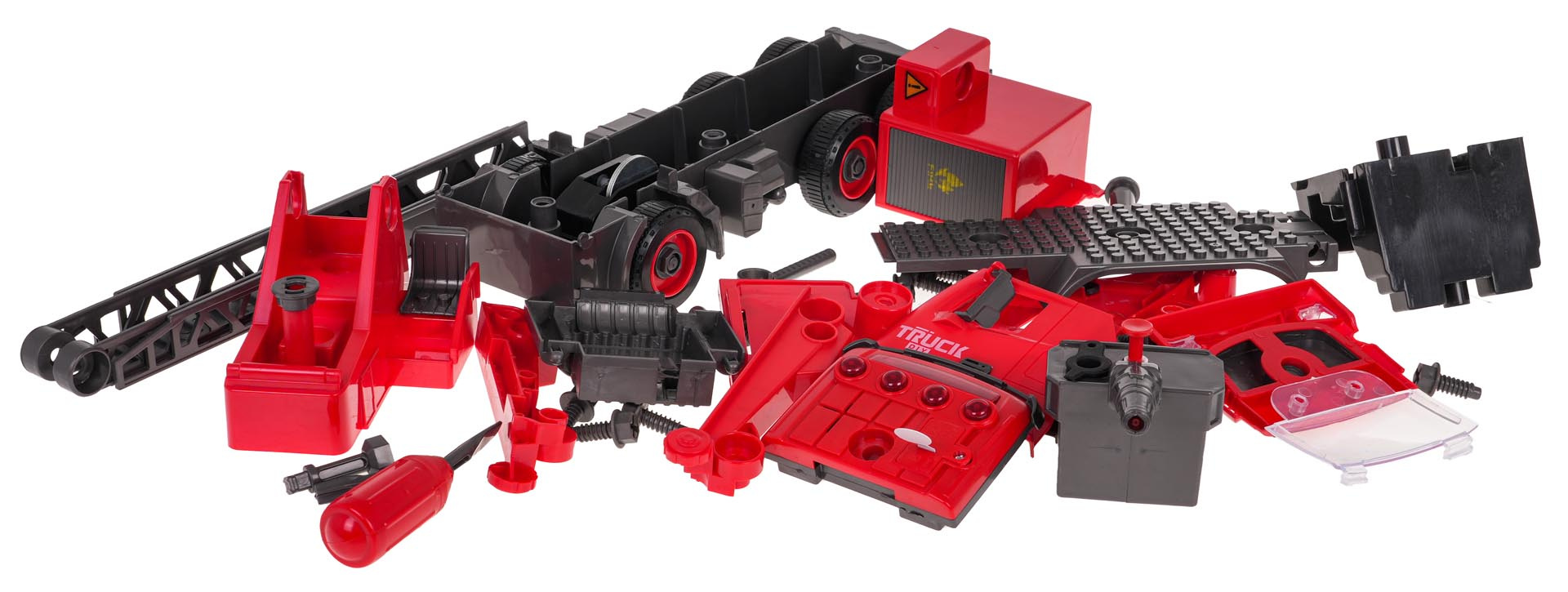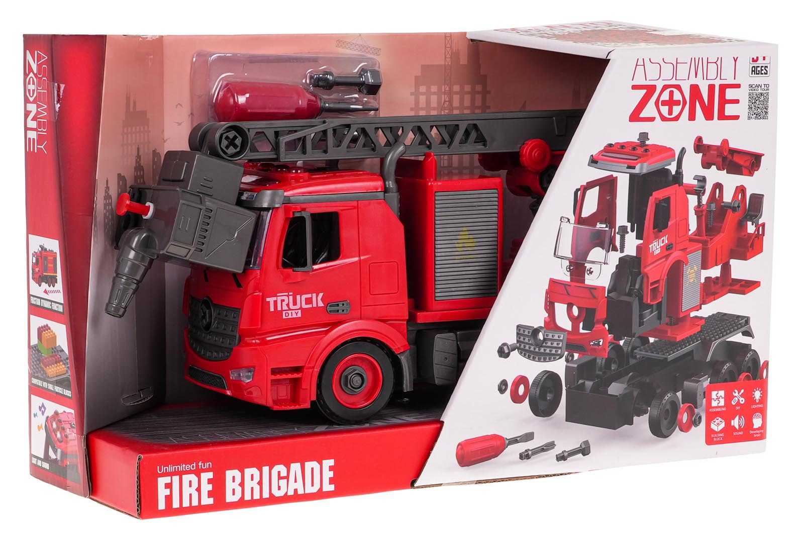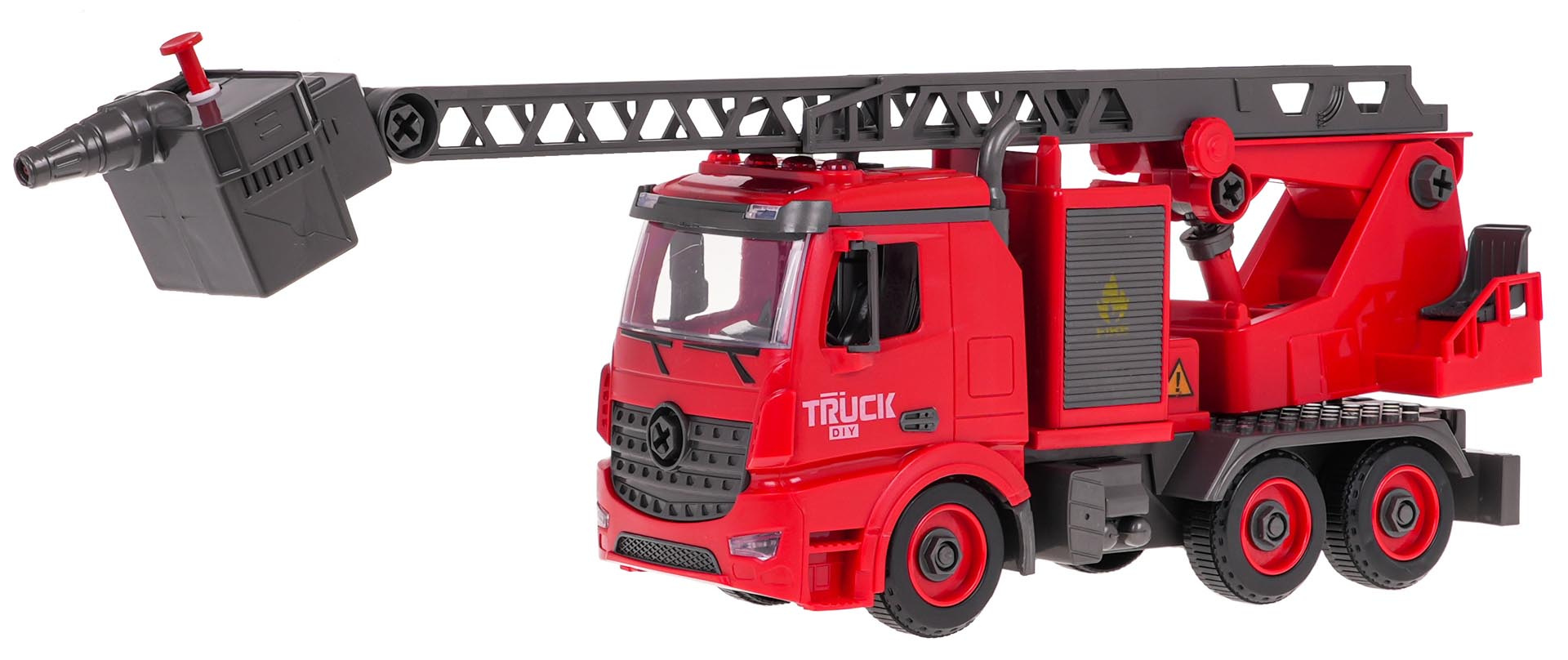 Interaktivní hasičský vůz k rozebírání s funkcí vody pro děti od 3 let. V sadě se nachází šroubovák s vyměnitelnými koncovkami pro rozebrání vozidla. Hasičský vůz má pohon předních kol. Na střeše hasičského vozu se nacházejí dvě blikající světla a funkční tlačítka. Tlačítka spouštějí zvuky alarmu, startování vozidla, couvání a klaksonu. Rameno hasičského vozu lze zvedat, spouštět a vysouvat ručně. Můžeme s ním otáčet také o 360 stupňů. Po naplnění nádržky vodou a stisknutí tlačítka na koncovém stupni hasičské hadice bude stříkat voda. Hračka je napájena bateriemi typu 3 x AG13 (v balení).