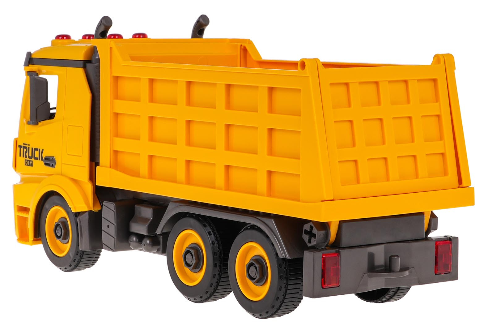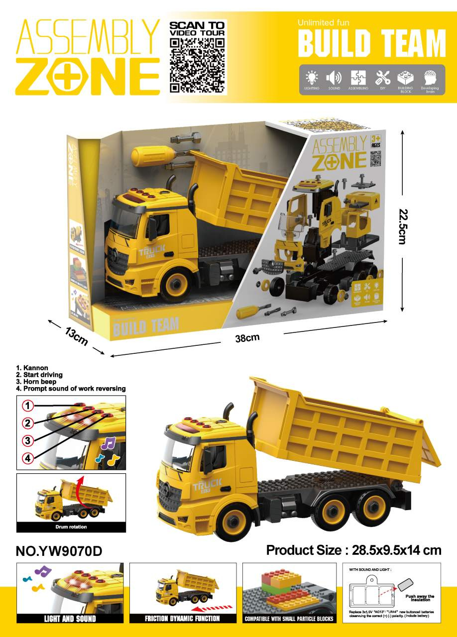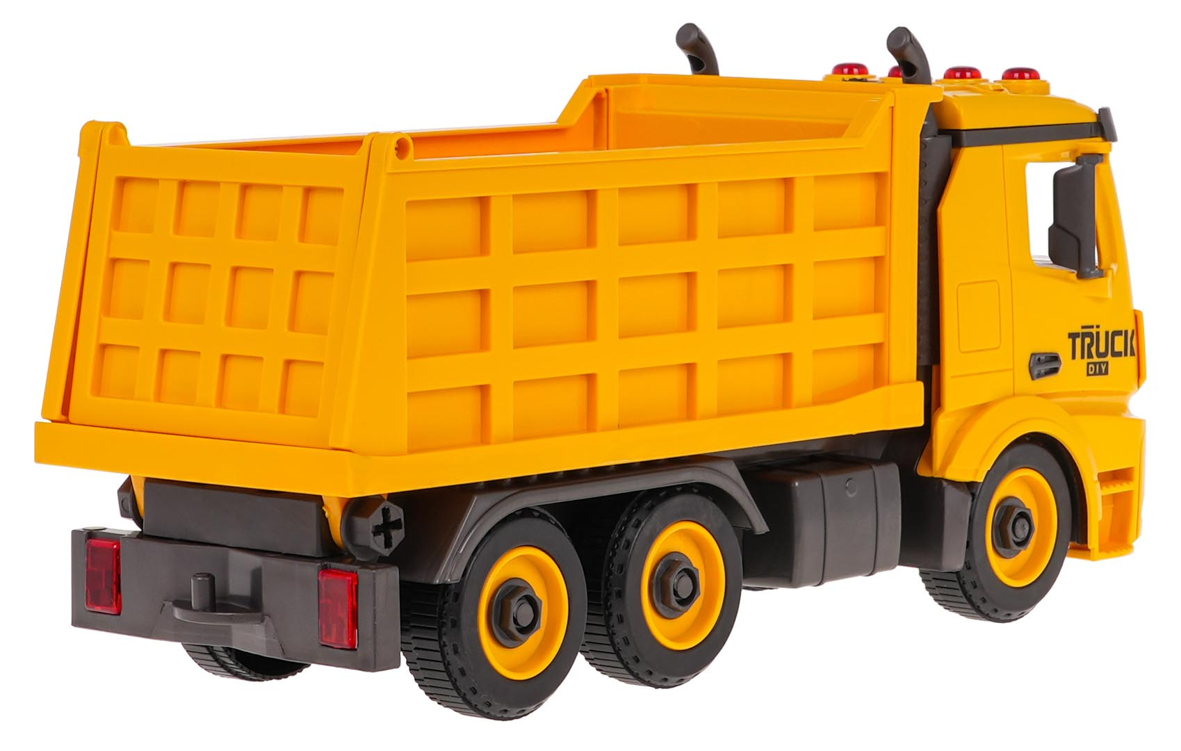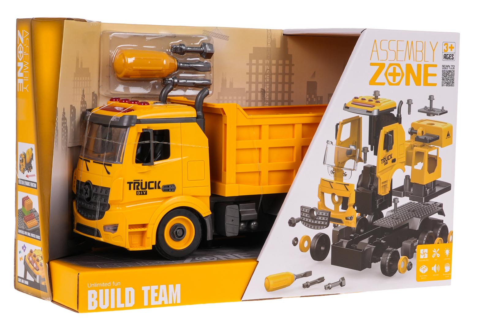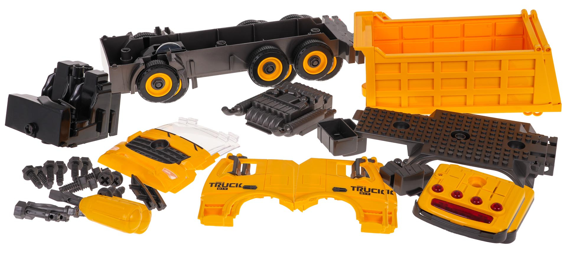 Interaktivní sklápěčka k rozebírání pro děti od 3 let. V sadě se nachází šroubovák s vyměnitelnými koncovkami pro rozebrání vozidla. Sklápěčka má pohon na přední kola. Na její střeše se nacházejí dvě blikající světla a funkční tlačítka. Tlačítka spouštějí zvuky startování vozidla, couvání, klaksonu a alarmu. Přívěs můžeme zvedat a spouštět a otevírat jeho zadní klapku, nebo jej úplně odpojit od soupravy, a místo něj na podstavci z kostek skládat kostky. Hračka je napájena bateriemi typu 3 x AG13 (v balení).
