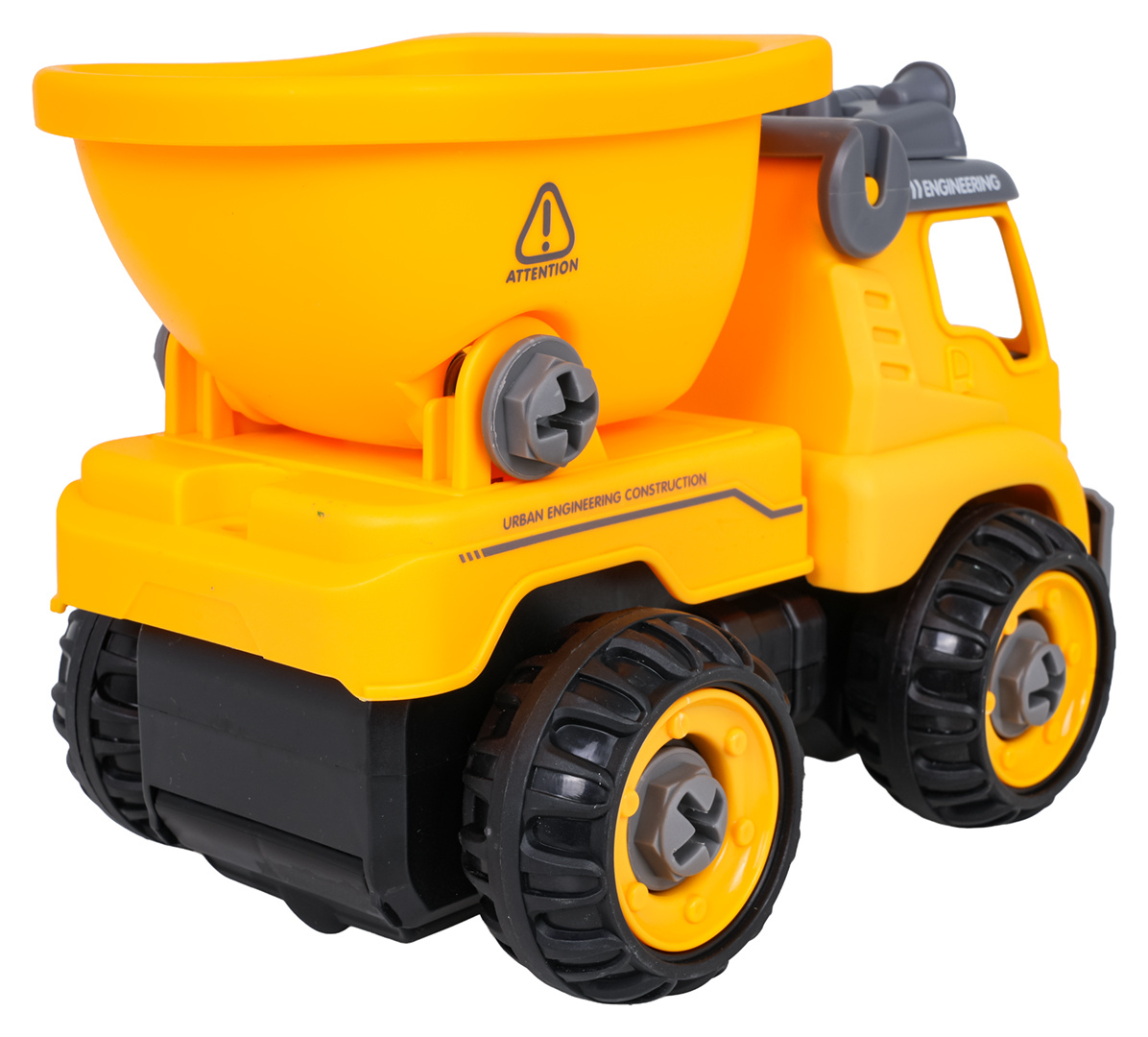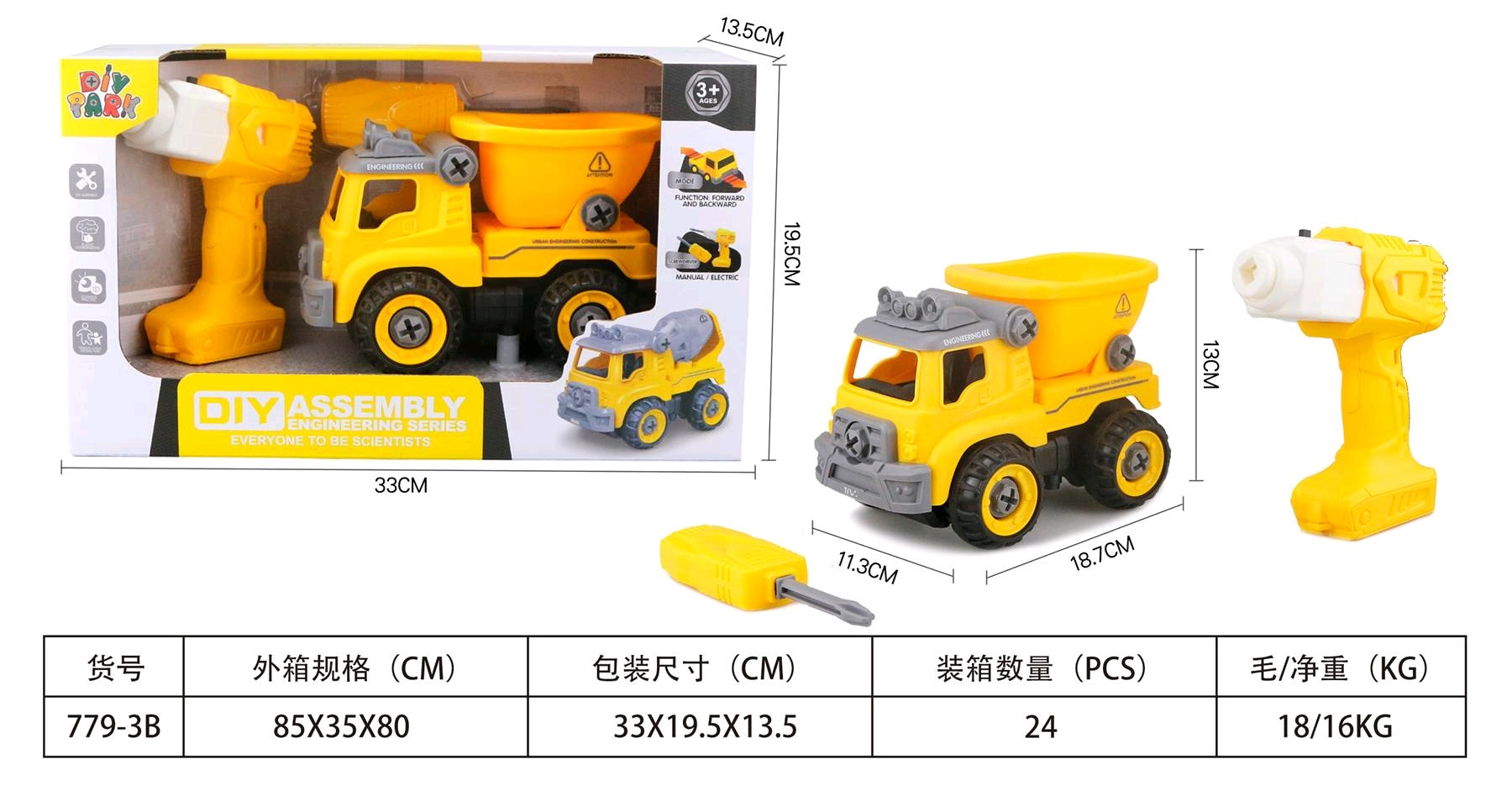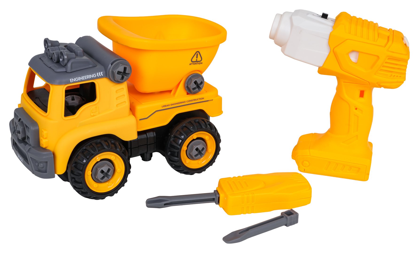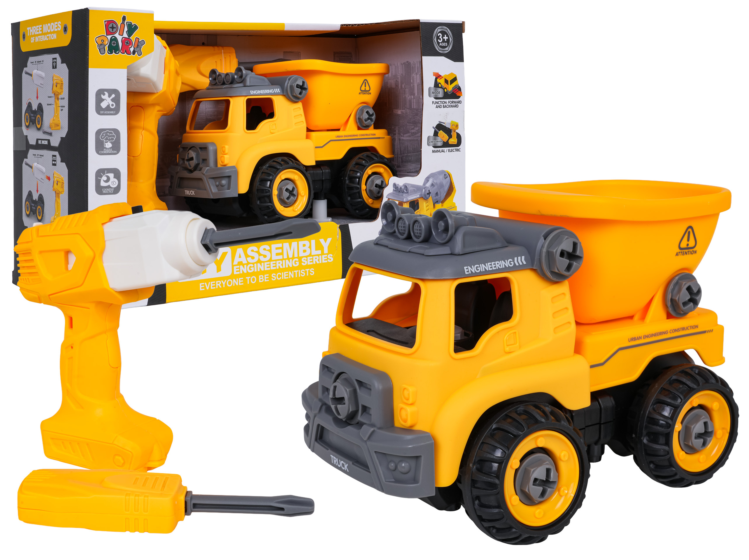 Interaktivní stavební vozidlo pro děti od tří let s příslušenstvím v sadě. Vozidlo obdržíme smontované a kompletní, můžeme ho rozložit na jednotlivé části pomocí přiloženého šroubováku nebo aku vrtačky. Šroubovák je manuální, zatímco aku vrtačka je na baterie. Vrtačka má vyjímatelný panel, pokud tento panel přemístíme do vozidla, bude se pohybovat dopředu a dozadu. Hračka má pohyblivé části, jako je přívěs nebo střecha vozidla. Hračka byla vyrobena z nejkvalitnějších materiálů, v živých barvách. Ovládací panel je napájen bateriemi typu 2 x AA 1,5 V (nejsou součástí balení).