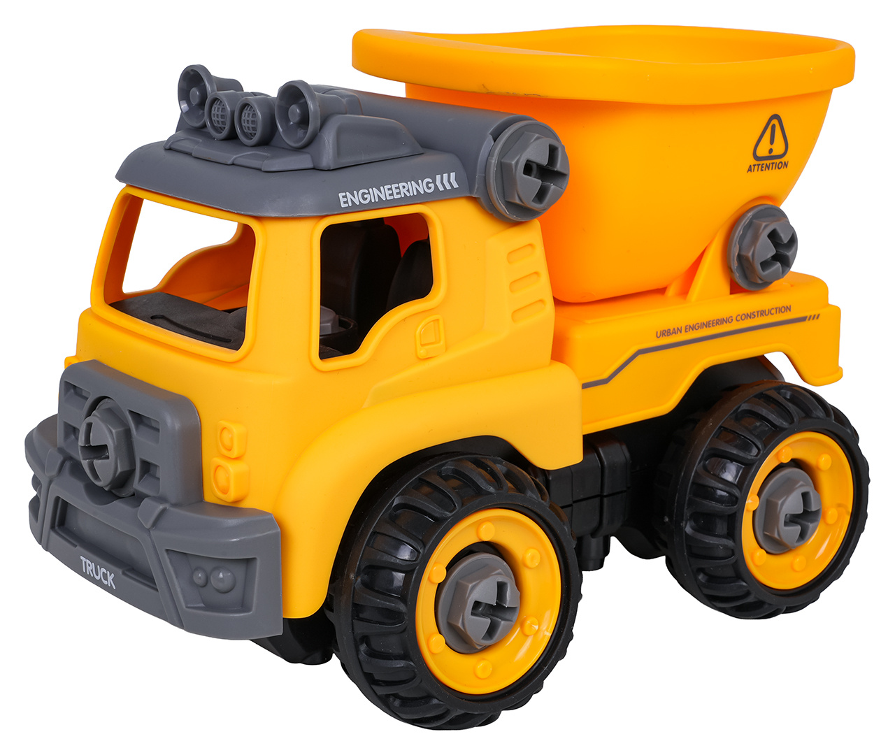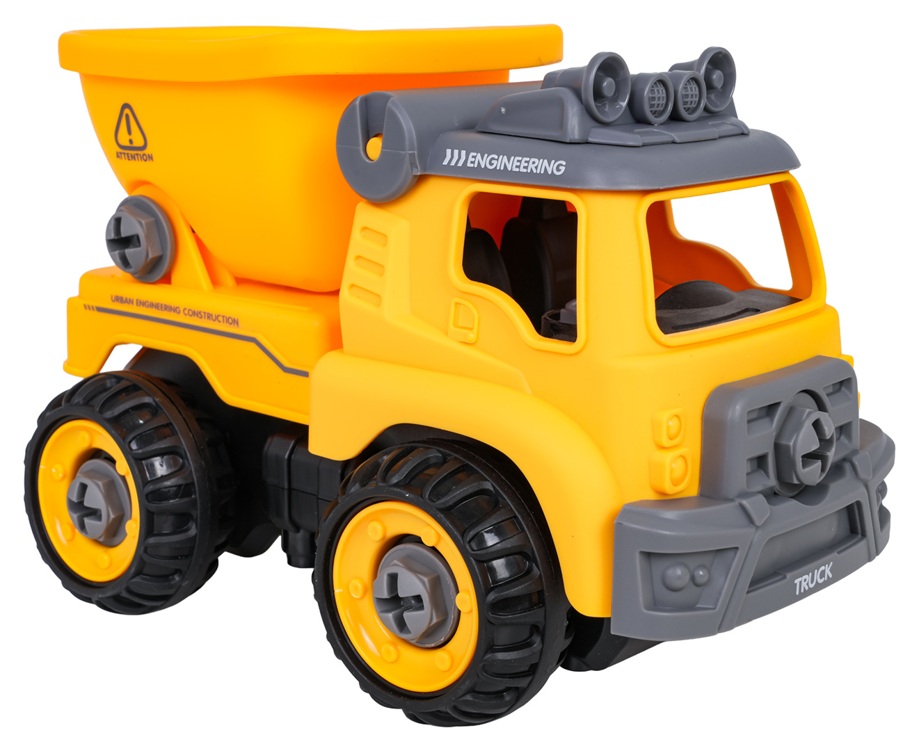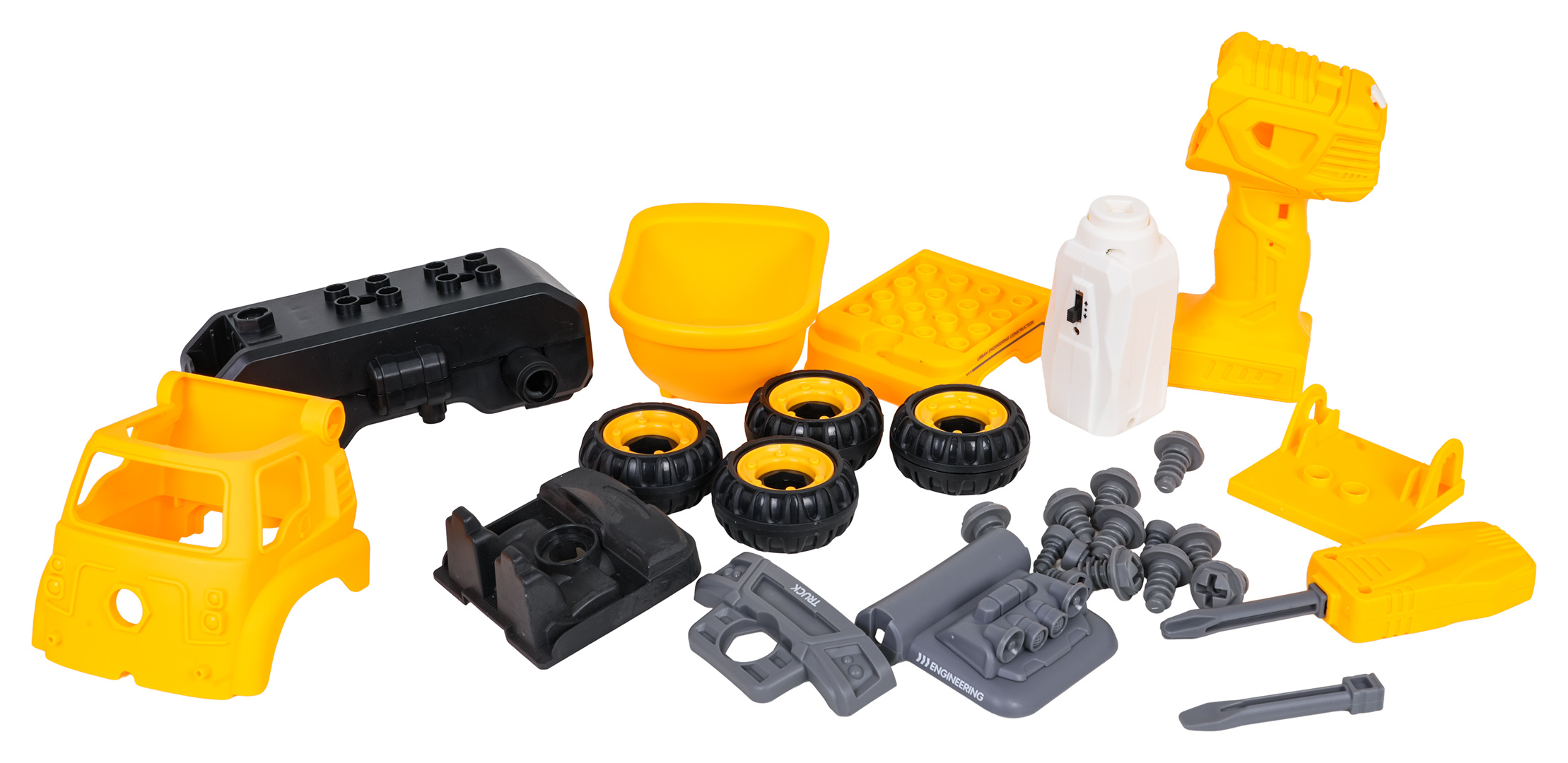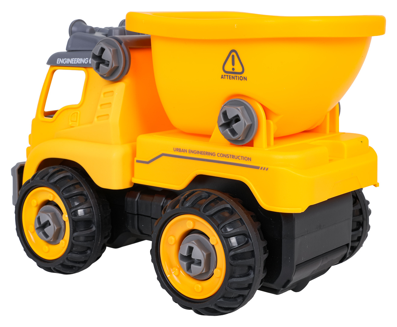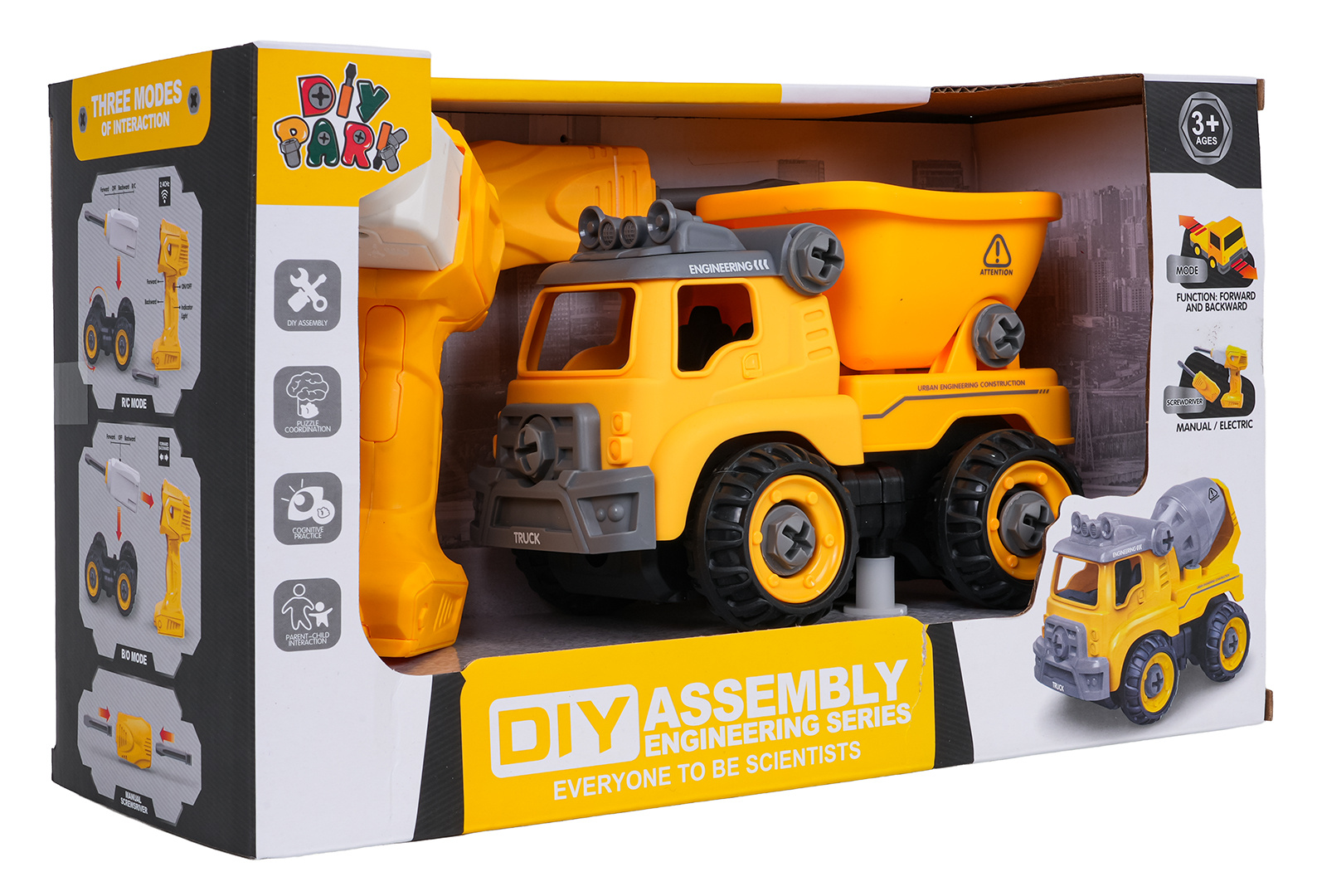 Interaktivní stavební vozidlo pro děti od tří let s příslušenstvím v sadě. Vozidlo obdržíme smontované a kompletní, můžeme ho rozložit na jednotlivé části pomocí přiloženého šroubováku nebo aku vrtačky. Šroubovák je manuální, zatímco aku vrtačka je na baterie. Vrtačka má vyjímatelný panel, pokud tento panel přemístíme do vozidla, bude se pohybovat dopředu a dozadu. Hračka má pohyblivé části, jako je přívěs nebo střecha vozidla. Hračka byla vyrobena z nejkvalitnějších materiálů, v živých barvách. Ovládací panel je napájen bateriemi typu 2 x AA 1,5 V (nejsou součástí balení).