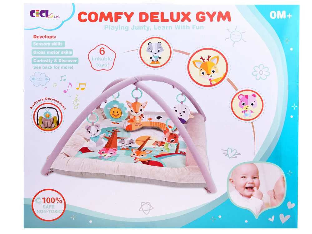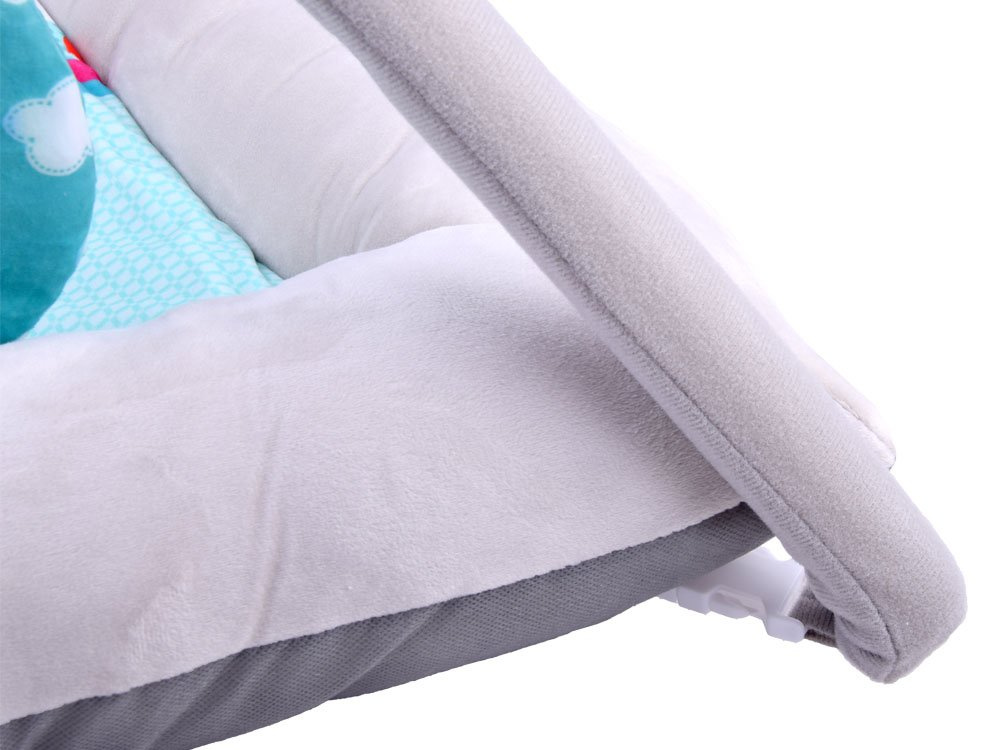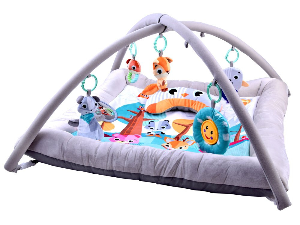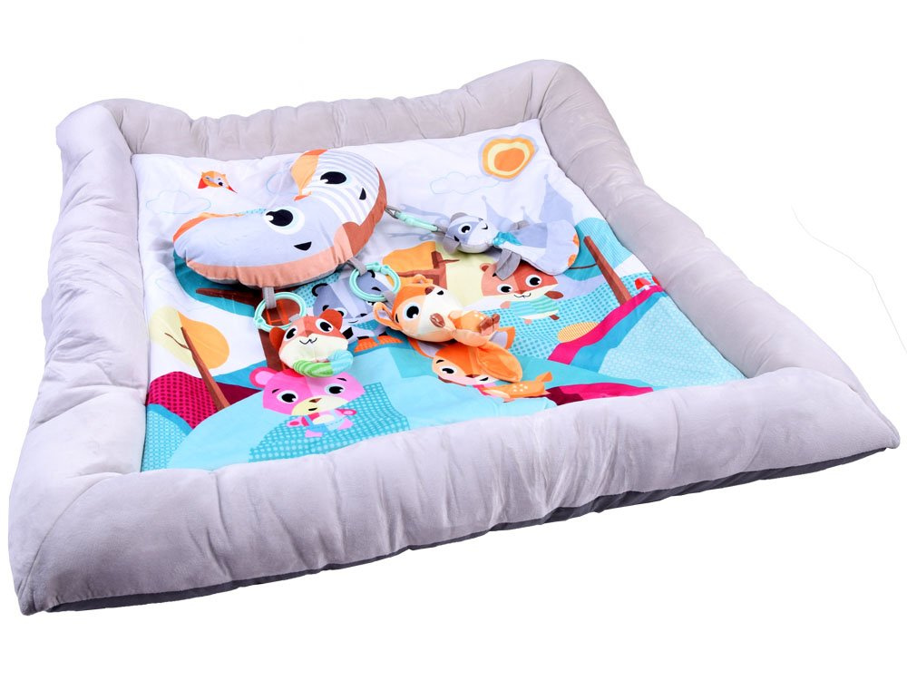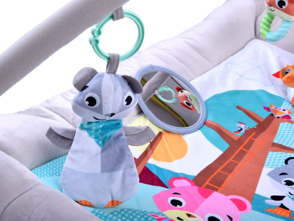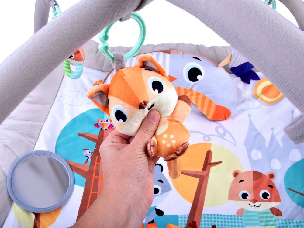 Roztomilá, měkká a elegantní vzdělávací podložka pro nejmenší děti se bude líbit batolatům i rodičům. Podložka je ve světle šedé barvě s krásnou kontrastní grafikou. Materiál je měkký a příjemný na dotek. Strany podložky jsou vyplněny měkkou výplní, která chrání vaše dítě při válení na podložce. Vzdělávací podložka je vybavena připevnitelnými oblouky, na které lze zavěsit hračky. Hračky jsou zavěšeny na plastových kroužcích.