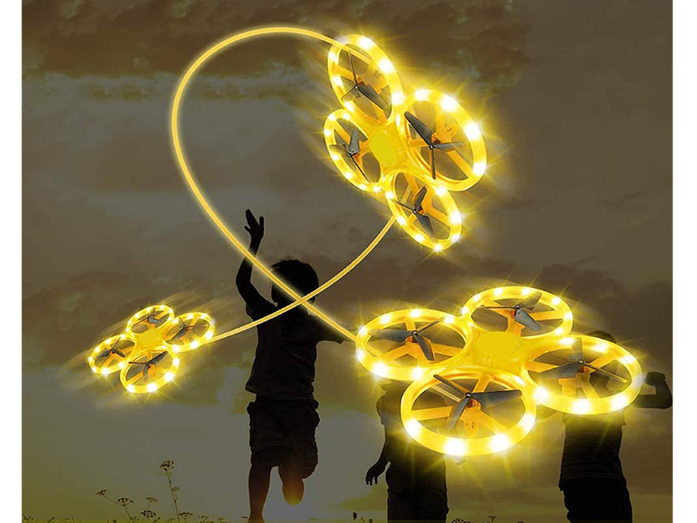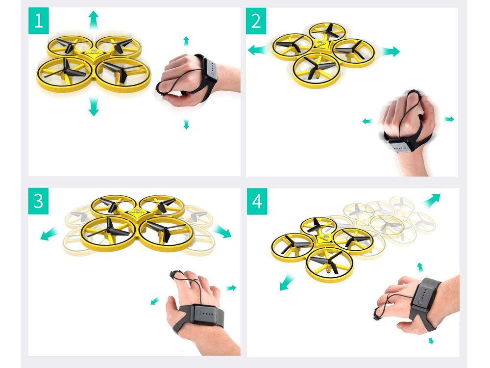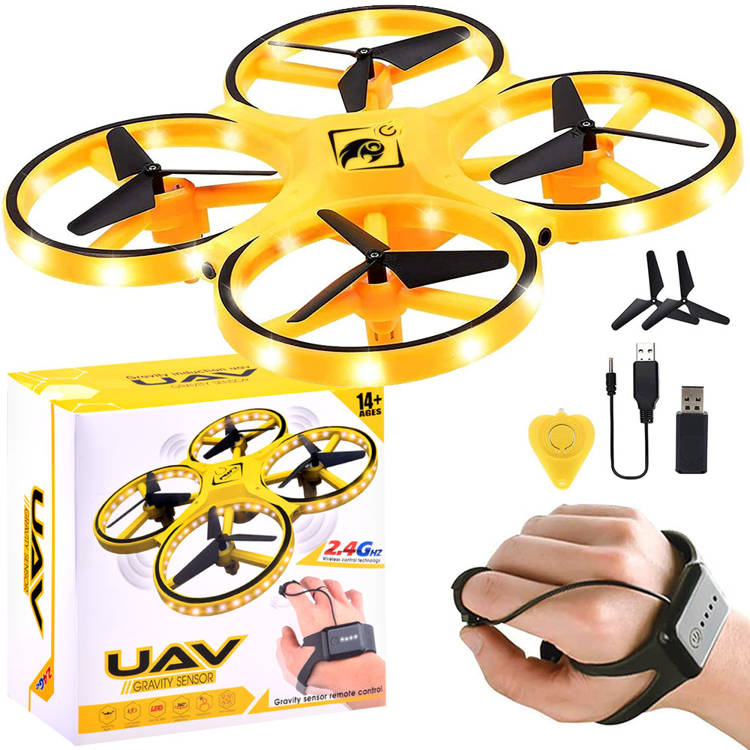 Kvadrokoptéra UAV s gravitačním senzorem - je to zábavná volba pro mladší a starší děti, které mají rády létající hračky. Dron je vyroben výhradně z plastu s fantastickým LED osvětlením, které se skvěle vyjímá za soumraku. Dron se ovládá speciálním dálkovým ovladačem, který se nosí na zápěstí jako hodinky. Hračka ovládaná rukou a gesty má široké možnosti manévrování, stačí jemný pohyb ruky pro změnu směru letu, doprava doleva, nahoru dolů. Po vypuštění zůstane ve vzduchu a otáčí se kolem své osy o 360 stupňů. Pásek se nosí na ruce tak, že se nasadí mezi palec a knoflíková páska se umístí na ukazováček. Silikonový pásek má 12stupňové nastavení šířky - padne každému. Hračka je lehká, a proto rychle stoupá do vzduchu, 4 protiběžná křídla zvyšují její stabilitu během letu.