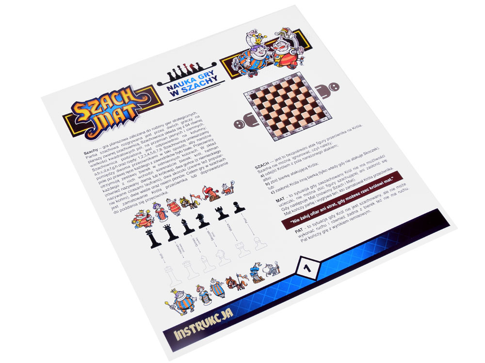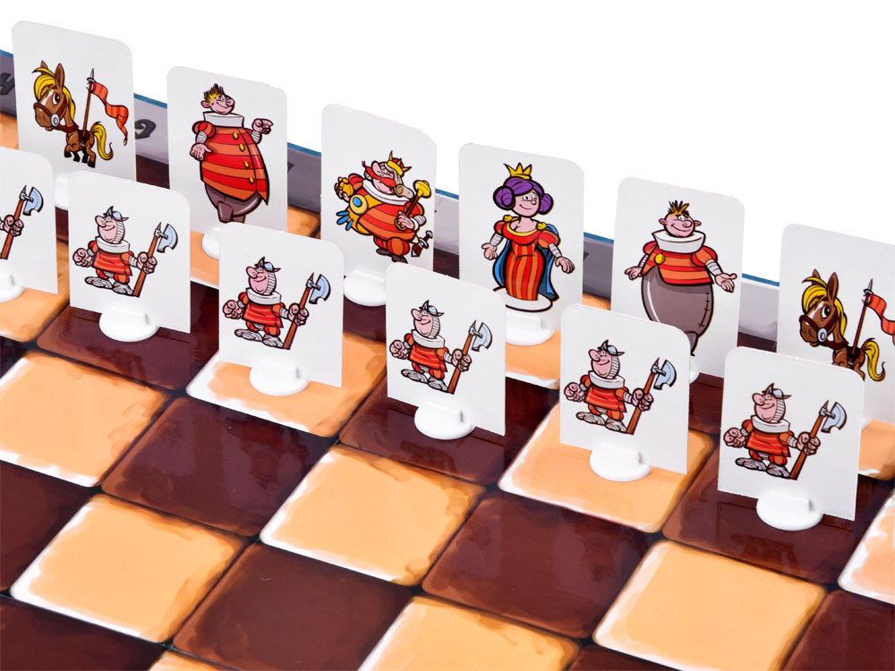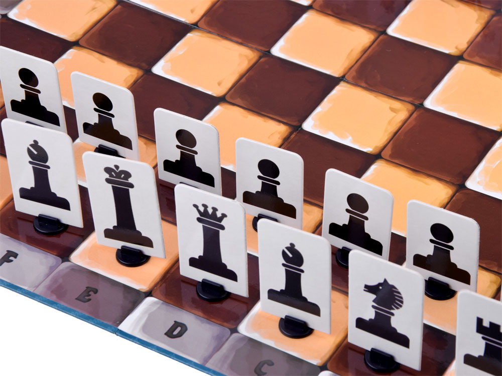 Hra obsahuje 24 karet s úkoly se třemi úrovněmi obtížnosti: snadná, obtížná a velmi obtížná. Úlohy, které ukazují pohyb a údery jednotlivých figur, jsou způsobem, jak se snadno naučit základy šachu.Díky oboustranné grafice figurek se hráči snáze naučí označovat pěšce na šachovnici.