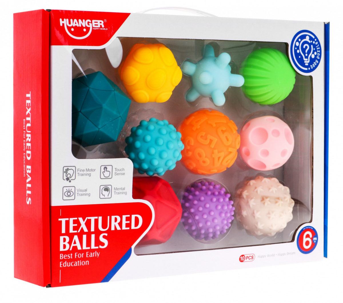 Tato sada měkkých senzorických míčků je určena pro batolata od 6 měsíců věku. Míče jsou vyrobeny ze 100% materiálů vhodných pro děti. Podněcují představivost, mysl, zrak a sluch. Prvky sady může dítě libovolně mačkat, čímž získává sílu v rukou. Při drcení vydávají zvuky, které vzbuzují zájem dítěte. Sada se skládá z 10 kusů různých tvarů, barev a textur.