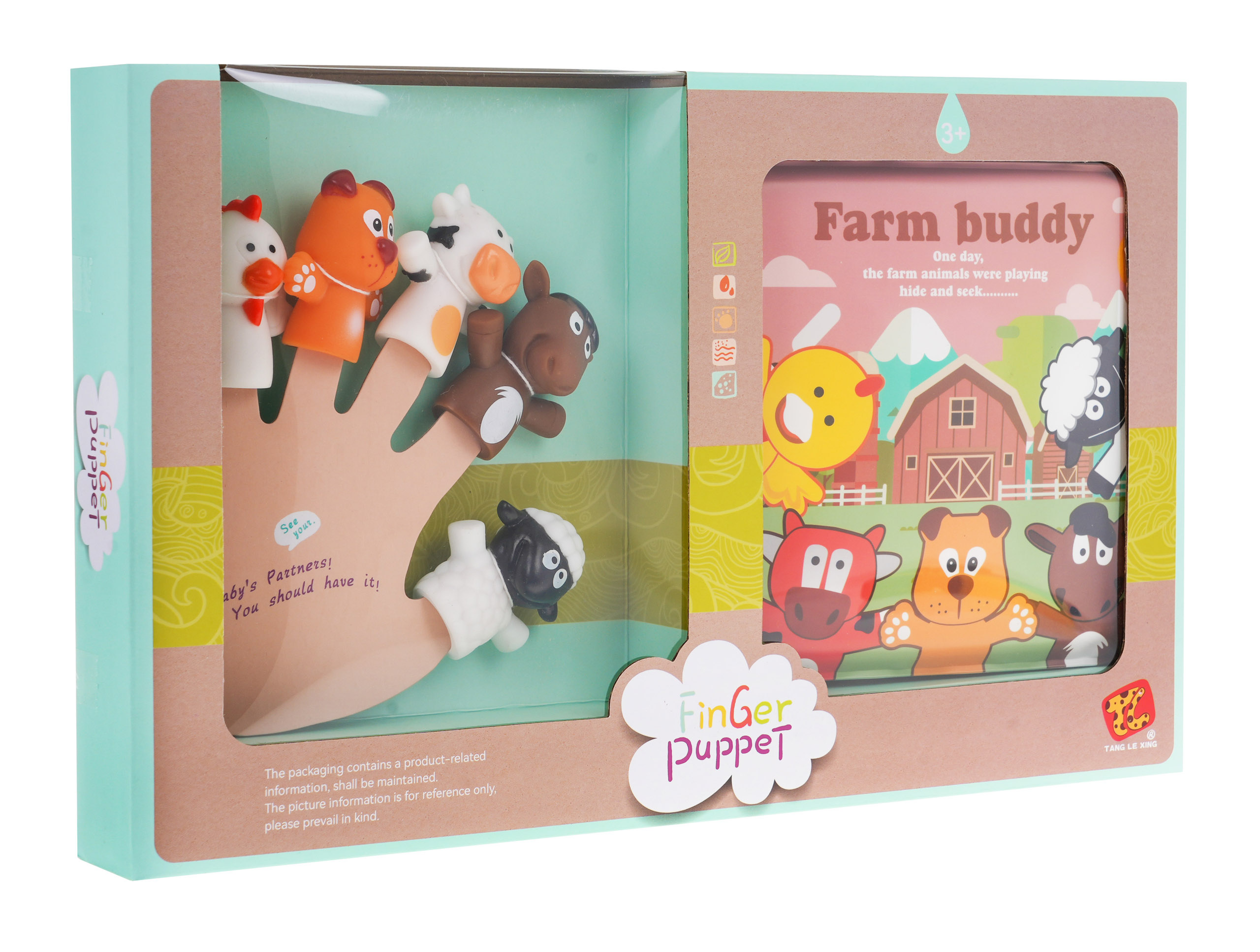Sada gumových prstových maňásků se zvířátky a měkká knížečka se zvířátky je určena pro děti od 3 let. Prstové loutky jsou skvělou zábavou a zároveň účinným vzdělávacím nástrojem pro děti. S touto sadou budou moci děti nebo dospělí hrát divadelní hry, ve kterých jsou hlavními postavami zvířata, jako je kuře, pes, osel, kráva, jehně. Součástí sady je měkká brožura s dobrodružstvími zvířat. Titulky v bookletu jsou v angličtině. Na hlavní stránce knihy je v pravém dolním rohu pískátko. Kniha a loutky jsou voděodolné a nemají ostré hrany. Hra s loutkami pozitivně ovlivňuje rozvoj představivosti, motoriky a soustředění.
