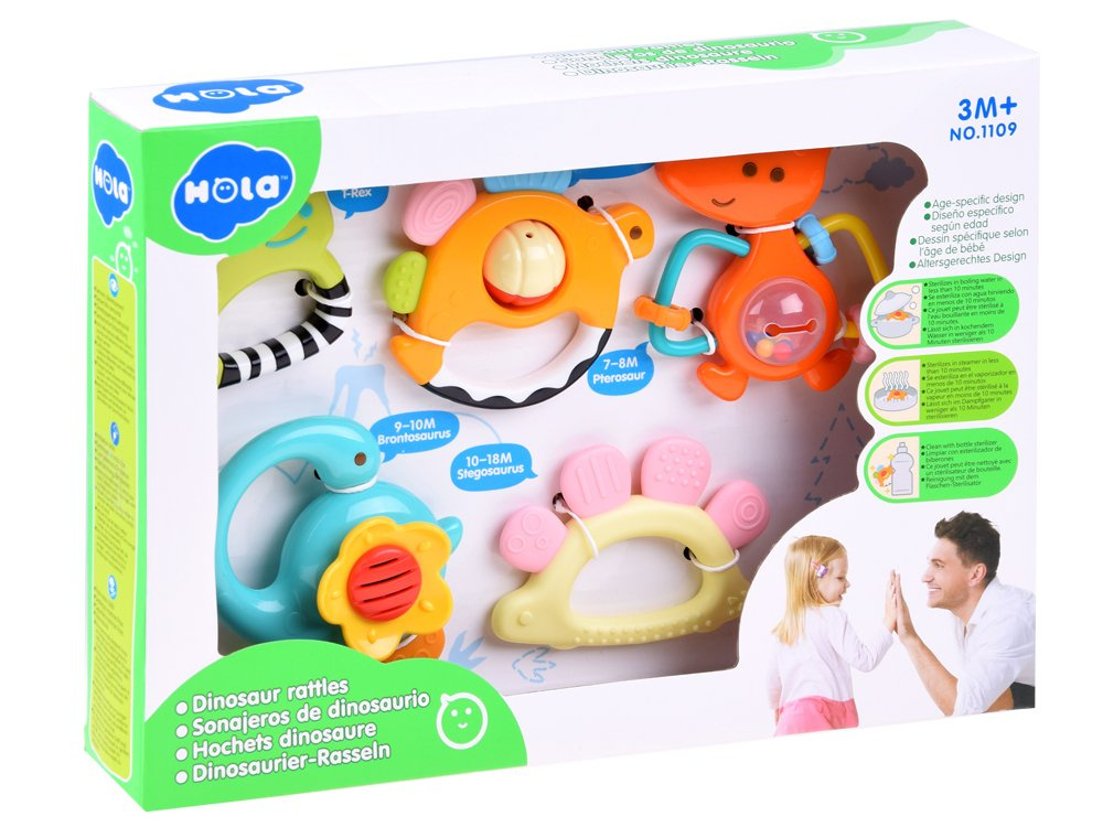 Rozkošná sada 5 barevných chrastítek a kousátkaje určena pro nejmenší děti, které právě objevují svět.Dinosauři jsou skvěle zpracovaní, ve velmi pěkných veselých barvách a tvarech a potěší nového člena rodiny.Hračky jsou vyrobeny z vysoce kvalitního plastu a jsou bezpečné pro batolata.