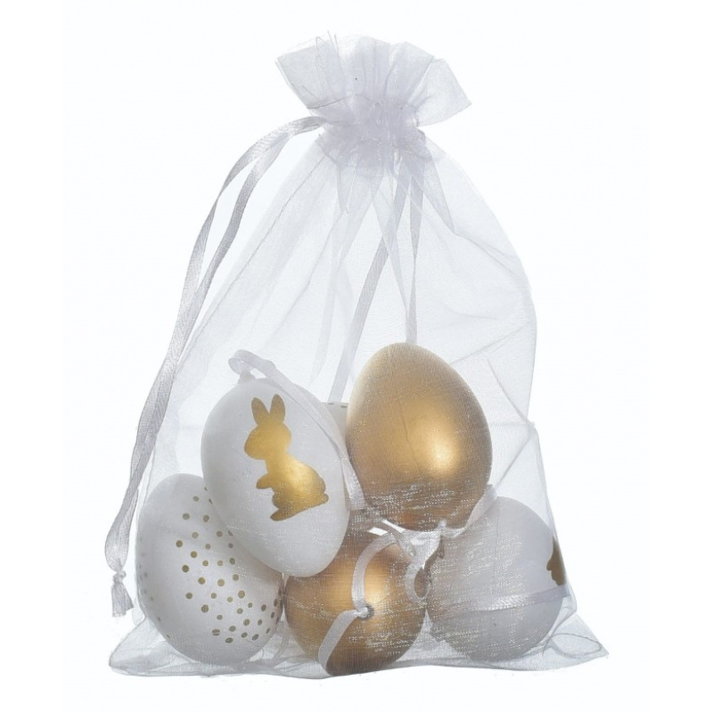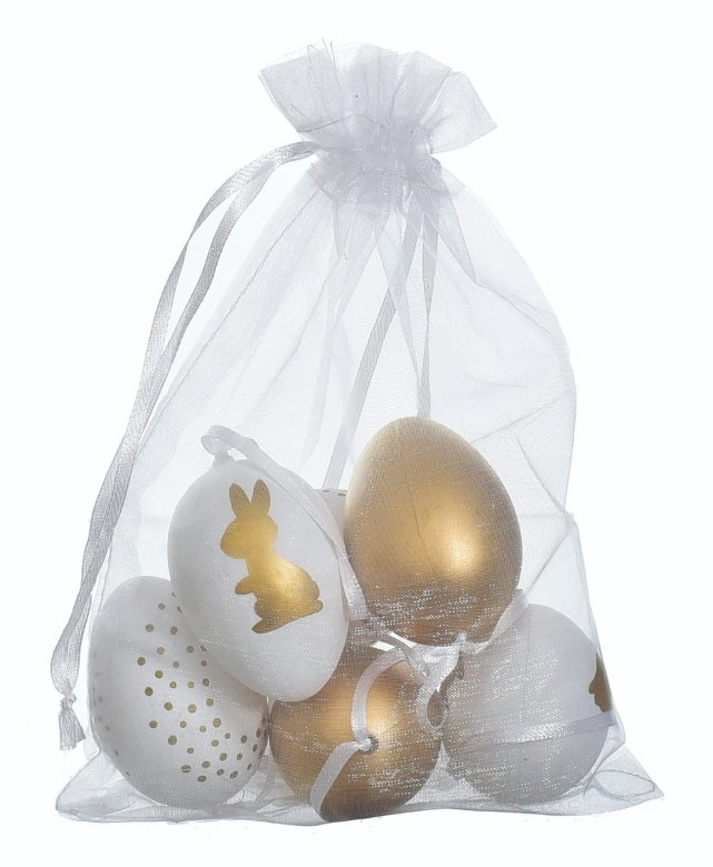 Vajíčka byla pečlivě vyrobena a jejich klasický tvar a elegantní forma zajistí, že se budou krásně vyjímat jako dekorace na velikonočním stromku, větvičkách, oknech nebo jako součást stolní výzdoby. Každé vajíčko bylo zabaleno do jemného sáčku, což činí sadu připravenou k darování jako dárek nebo k ozdobení prostoru. To je skvělý způsob, jak přinést jarní atmosféru a velikonoční teplo do každého interiéru.