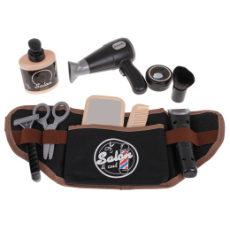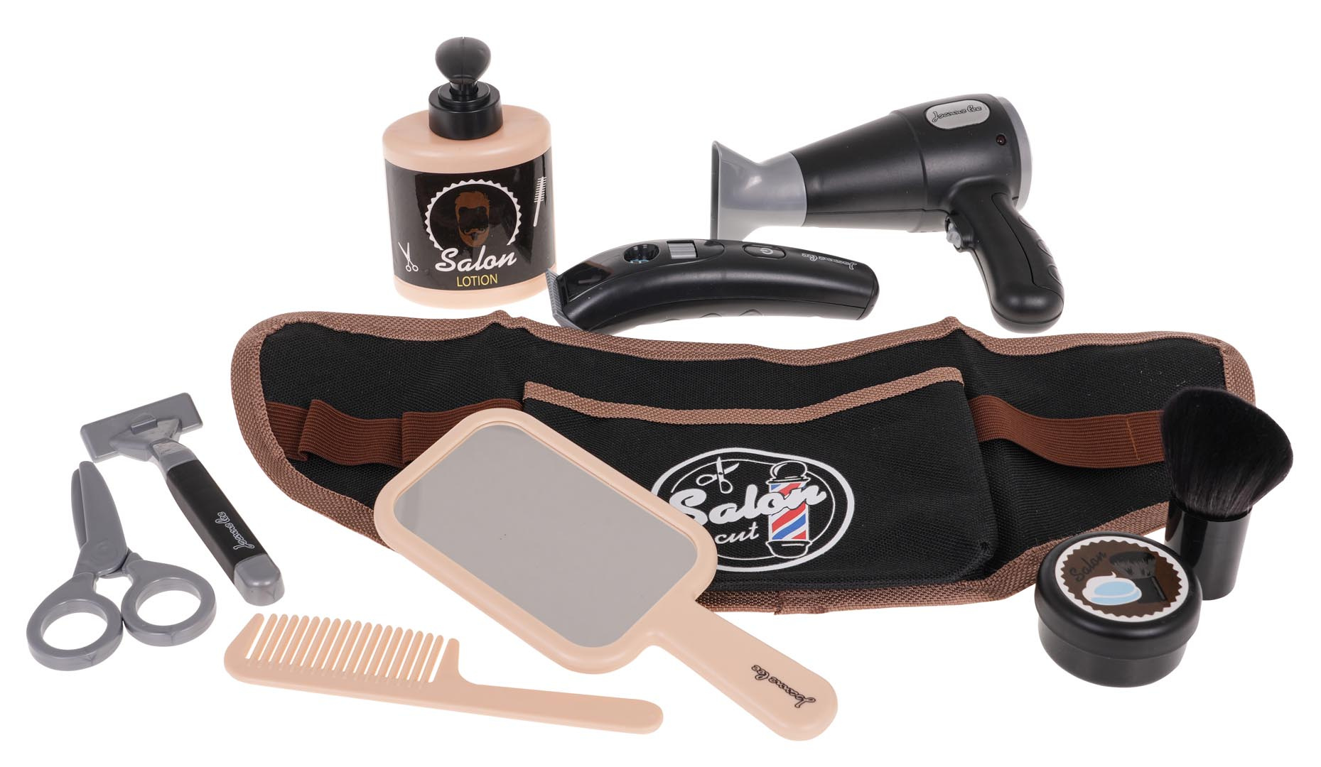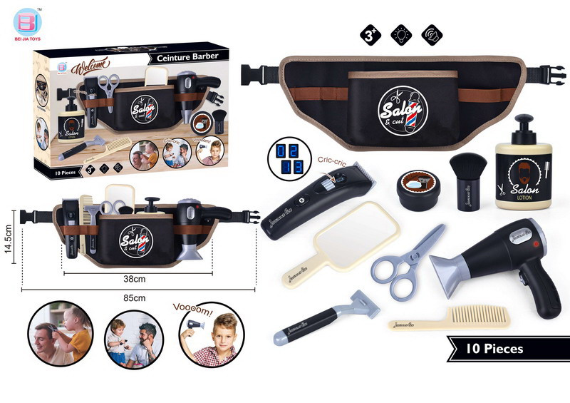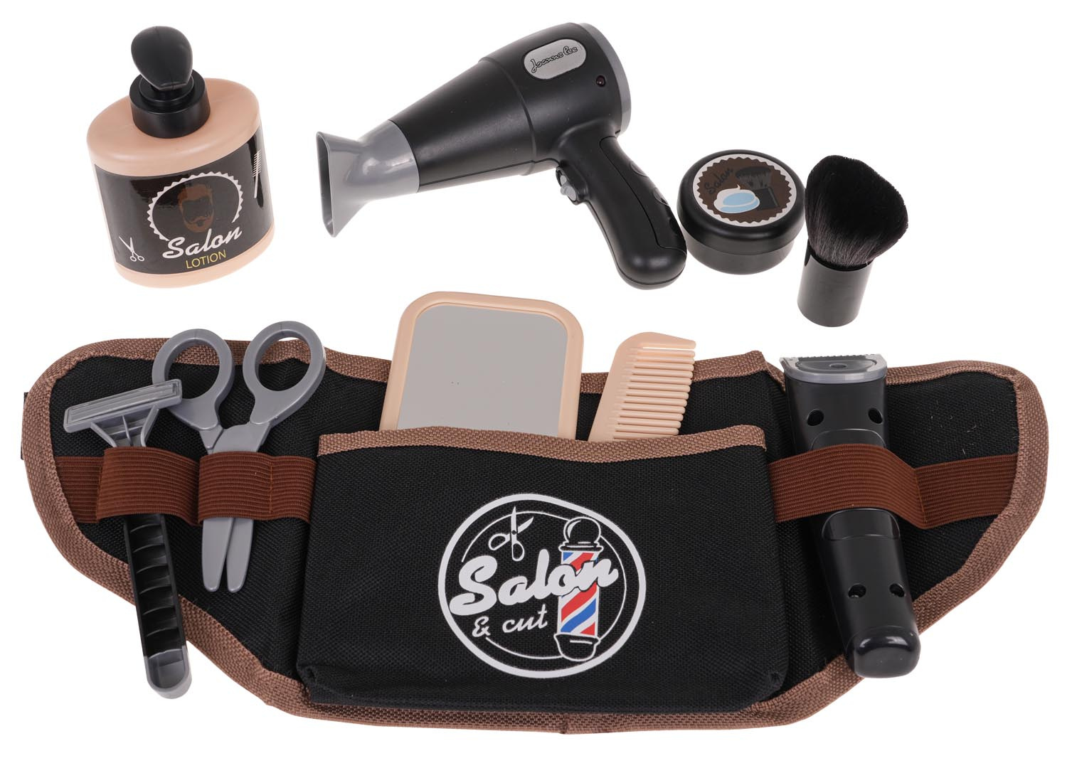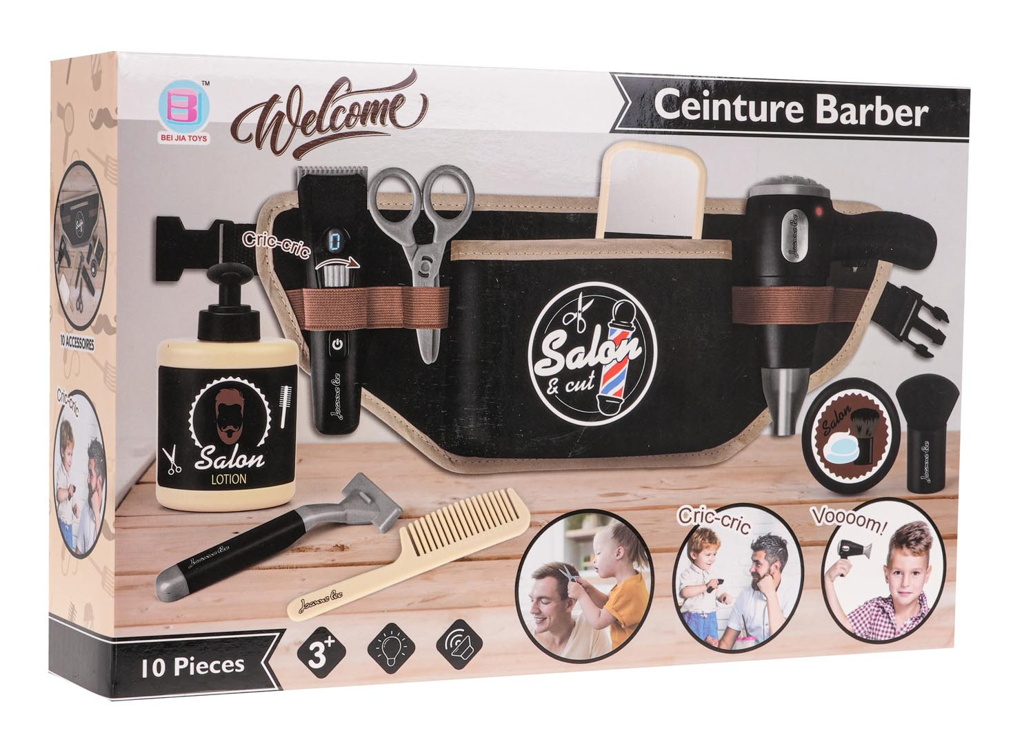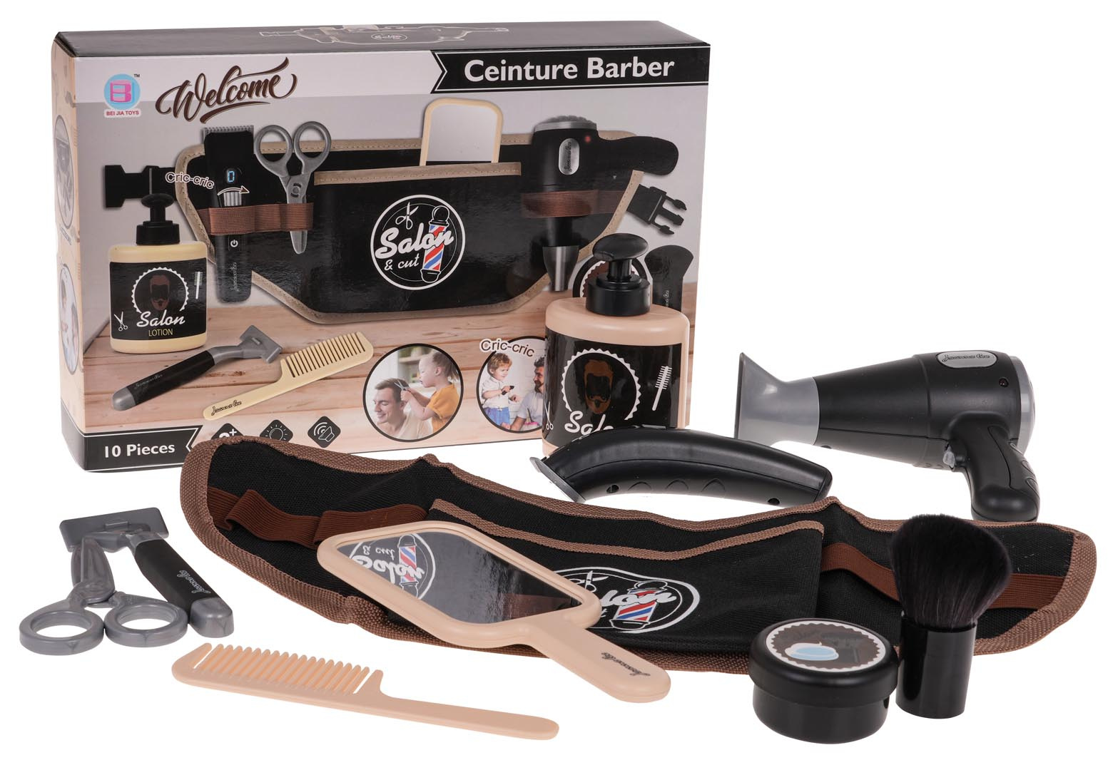 Bohatě vybavená sada pro holiče s pásem pro děti od 3 let. Sada se skládá z 10 prvků, je vyrobena z nejkvalitnějších materiálů, což zaručuje její dlouhou životnost. Součástí sady jsou: pásek, holicí strojek, fén, elektrický holicí strojek, nůžky, hřeben, zrcátko, štětec, lahvička s pumpičkou na kosmetiku, krabička na pěnu. S tak bohatě vybavenou sadou si vaše ratolest bude moci hrát na stříhání, modelování vousů nebo účesů. Pás lze přehodit přes boky a umístit do něj všechny prvky sady. Sušička má podsvícení a zvuky sušení. Napájena je bateriemi typu 2 x AAA 1,5 V (nejsou součástí balení).