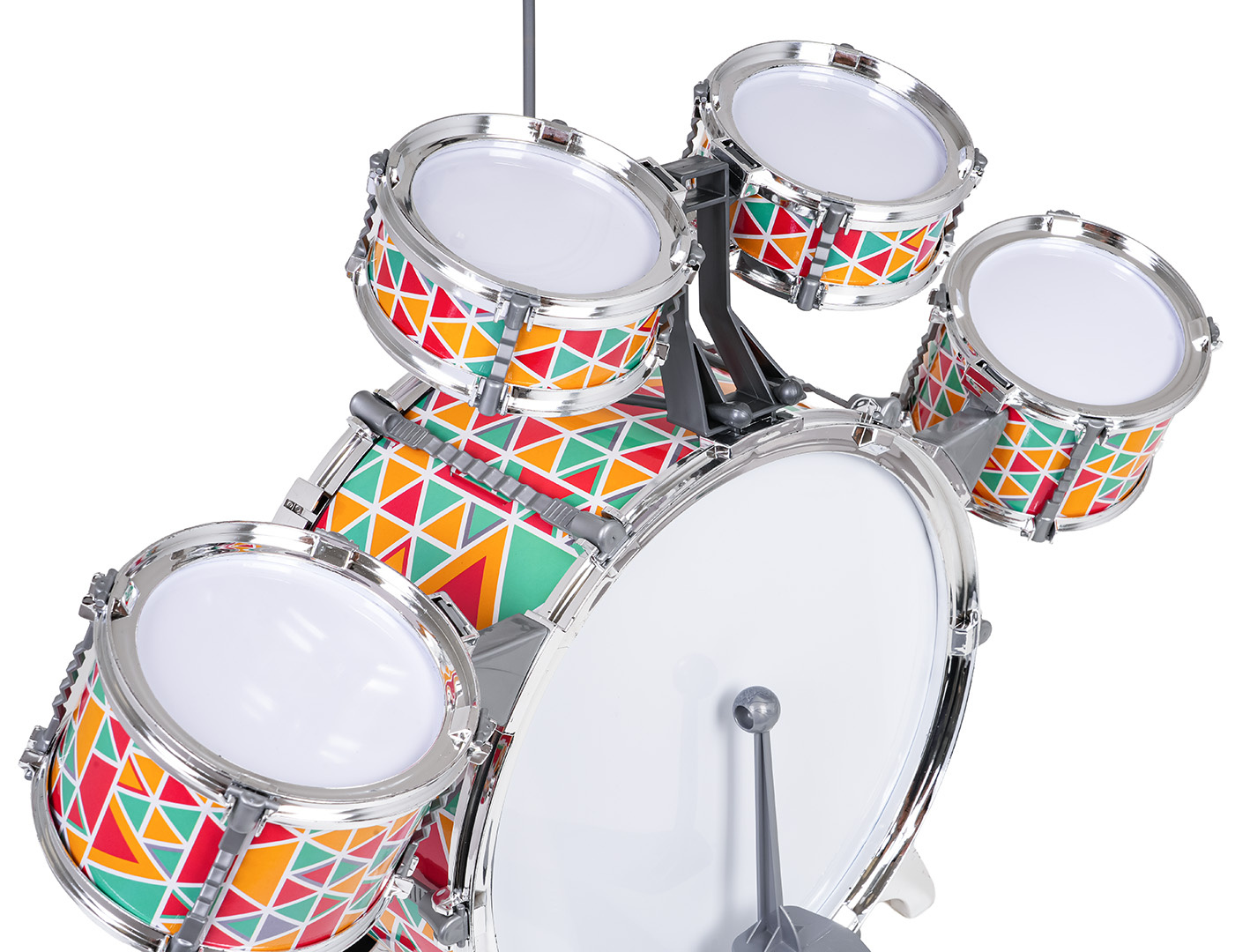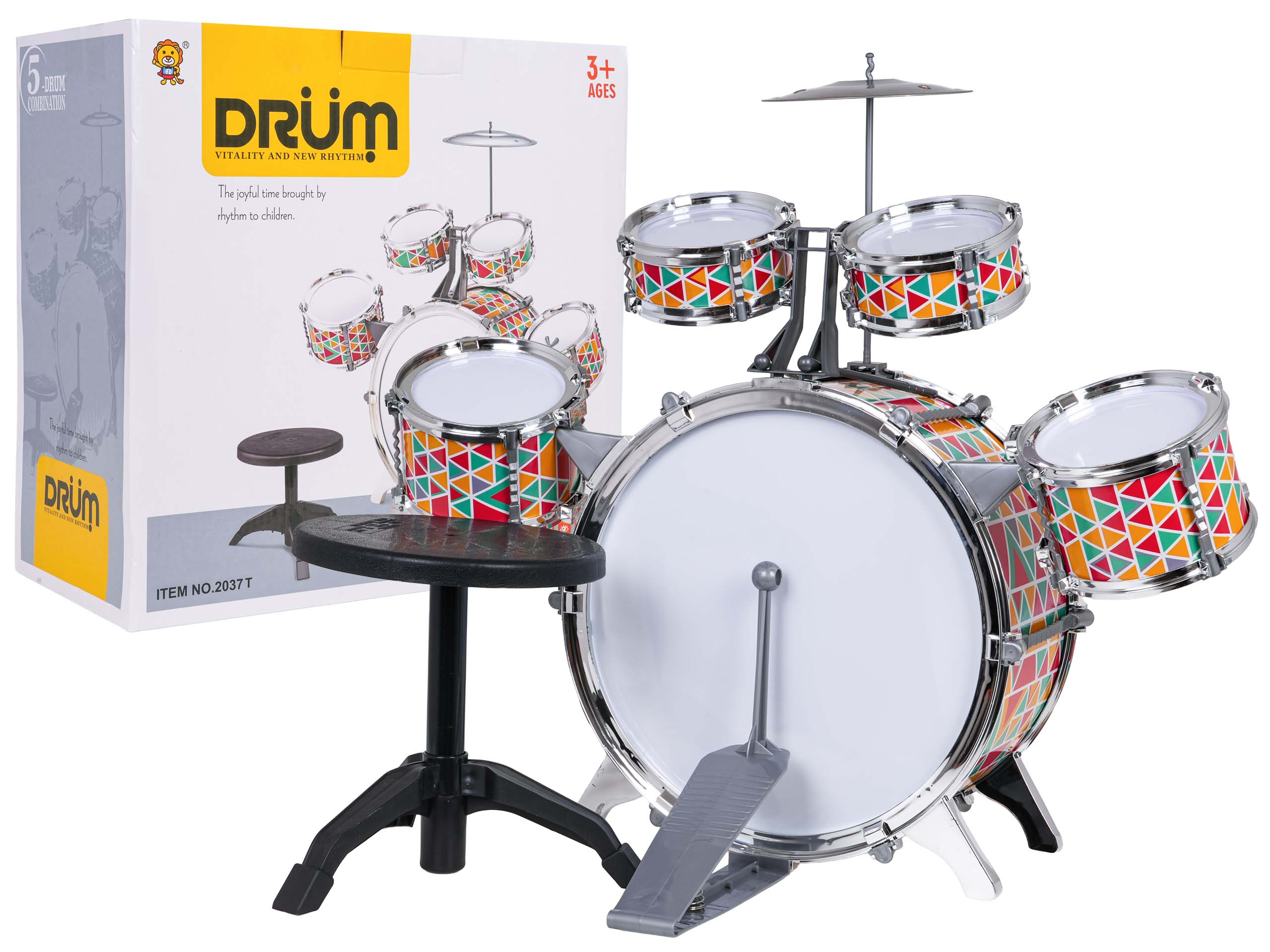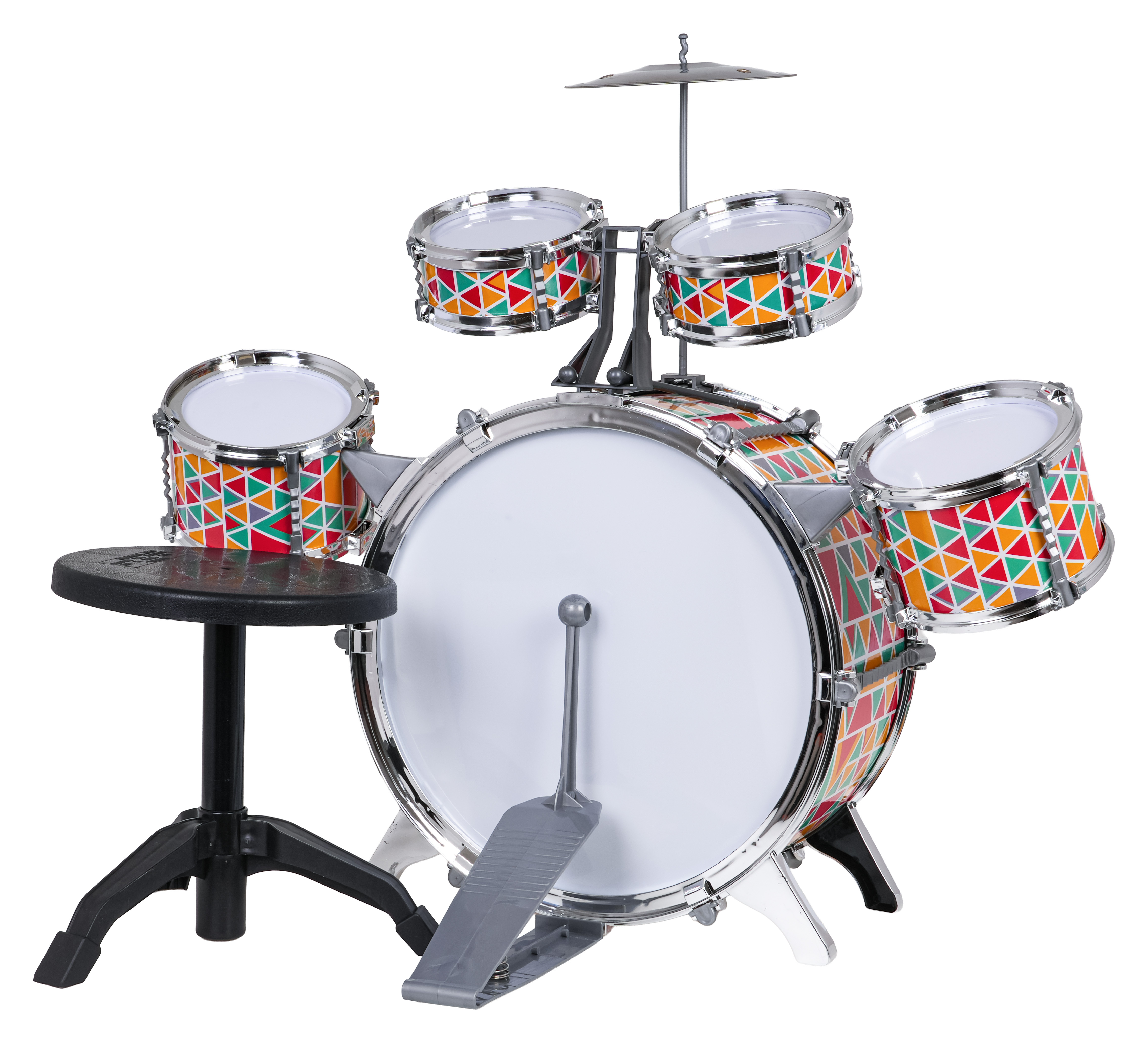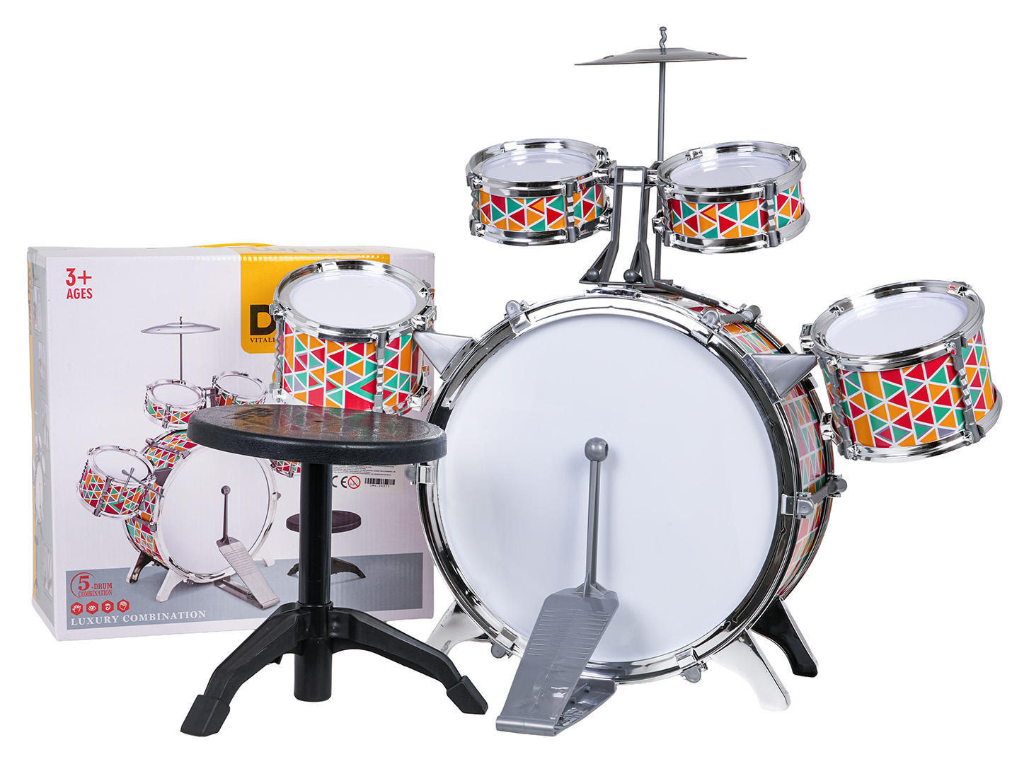 Velké, barevné bicí s židličkou v sadě jsou hračkovým nástrojem pro děti od tří let. Sada obsahuje 5 bubnů, kovový talíř, 2 paličky a stoličku.