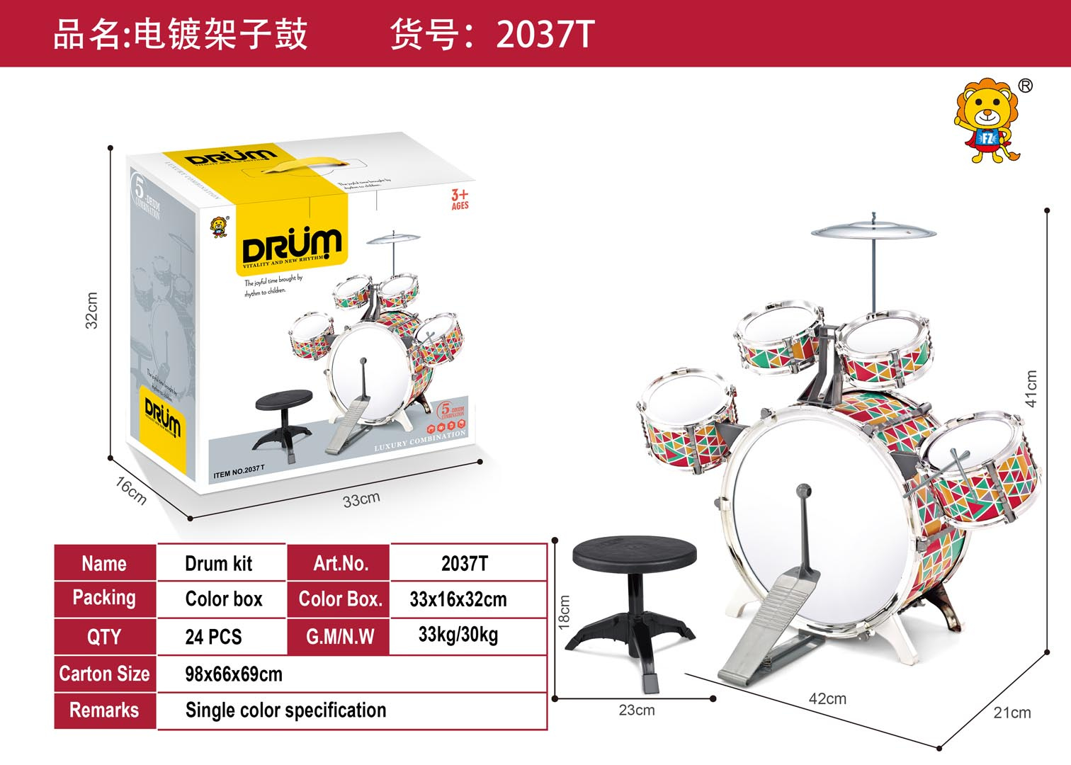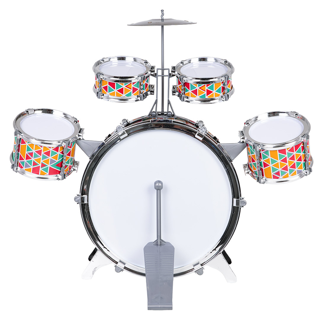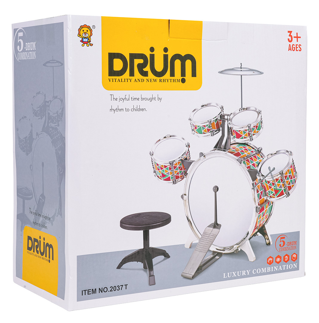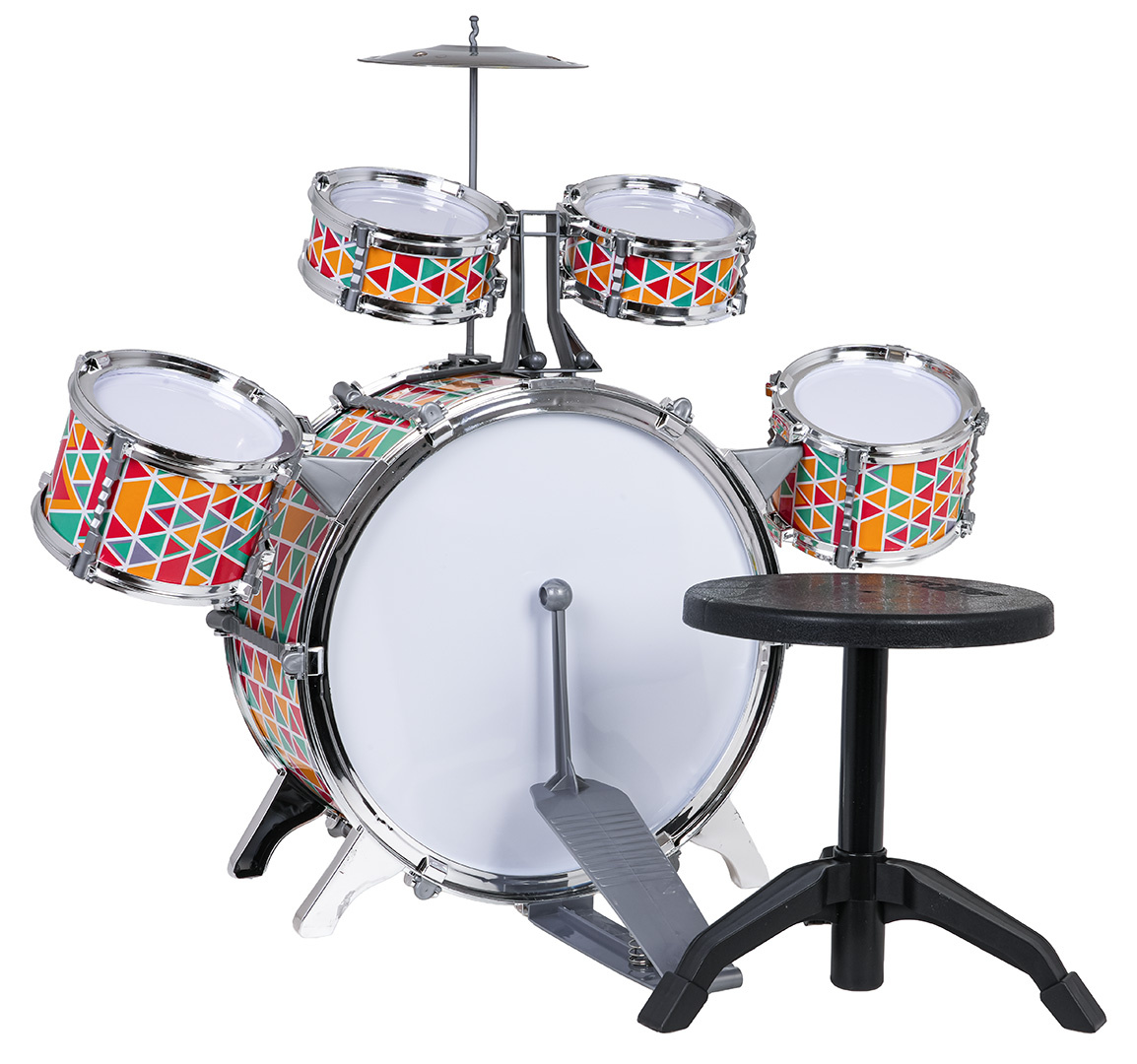 Velké, barevné bicí s židličkou v sadě jsou hračkovým nástrojem pro děti od tří let. Sada obsahuje 5 bubnů, kovový talíř, 2 paličky a stoličku.