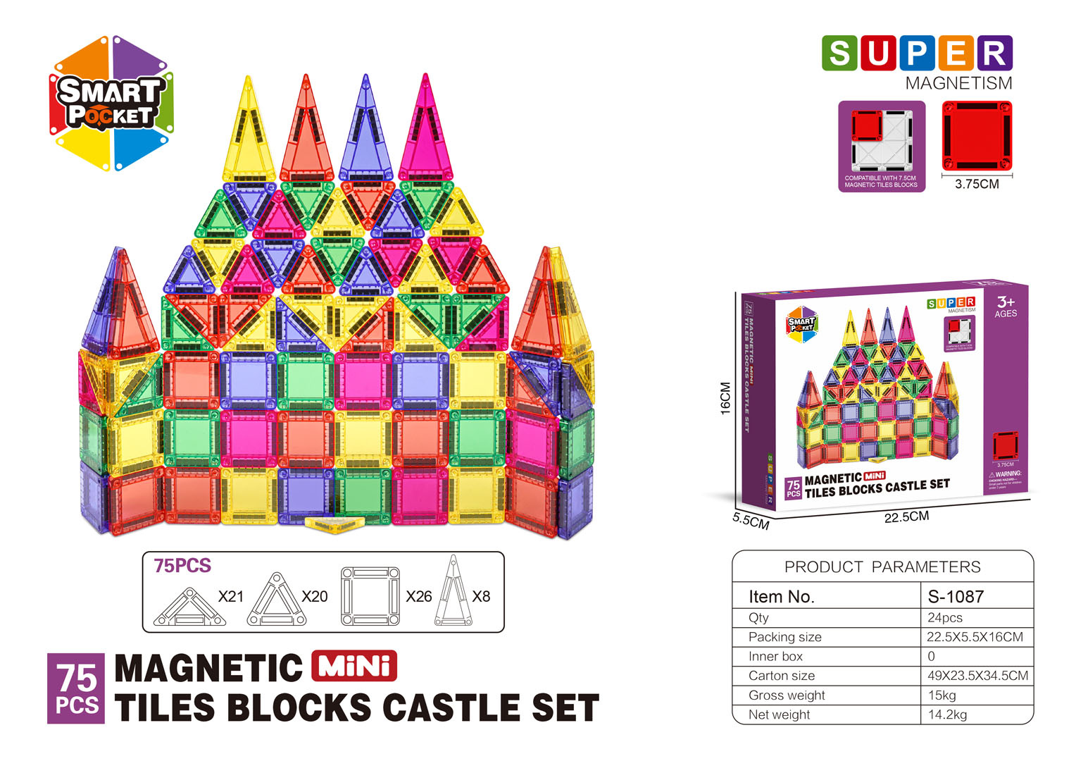 | Rozměry | - magnetické kostky čtverce cca.3,75 cm x 3,75 cm x 0,6 cm, - magnetické kostky trojúhelníky cca. 3,2 cm x 3,5 cm x 0,6 cm, ok. 2,5 cm x 5 cm x 0,6 cm, ok. 7 cm x 3,5 cm x 0,6 cm, - opakování cca 22,3 cm x 16,3 cm x 5,5 cm. |